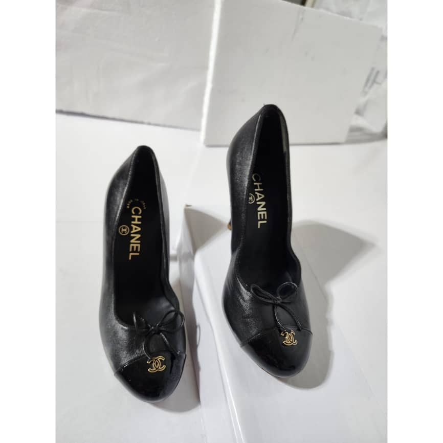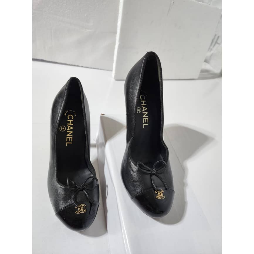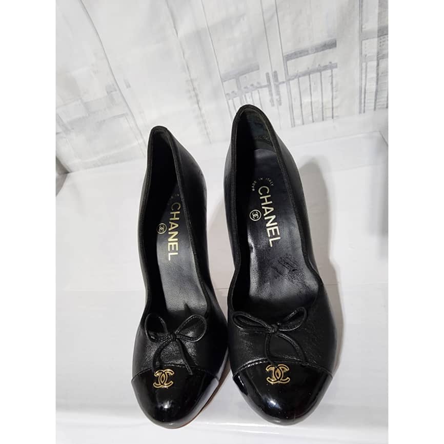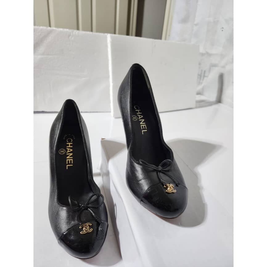 This authentic Chanel Leather And Patent CC Cap Toe Pumps Black Size 36C is in it’s good pre-owned condition. The exterior is clean and beautiful. The sole of the shoe shows scratch wear to it.