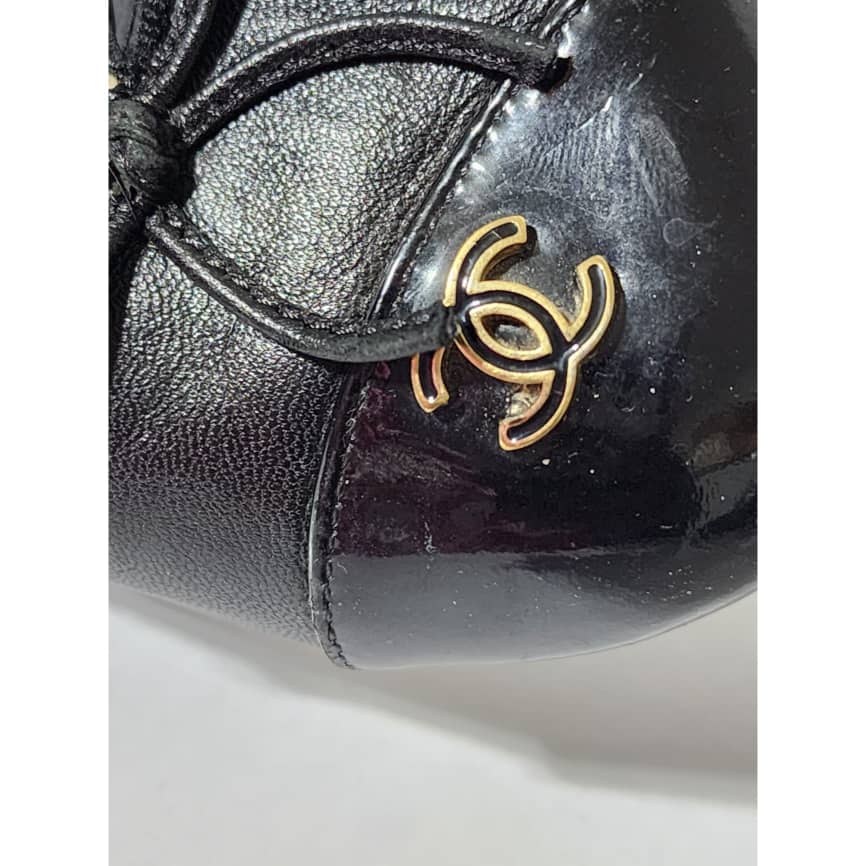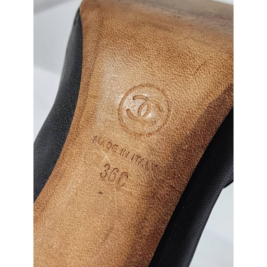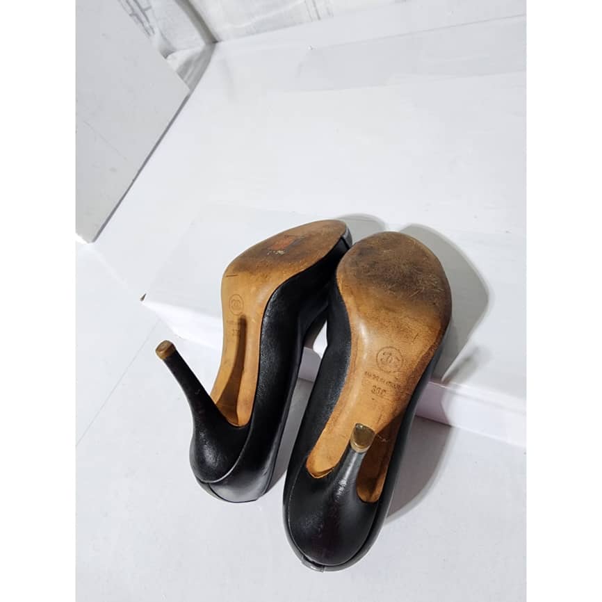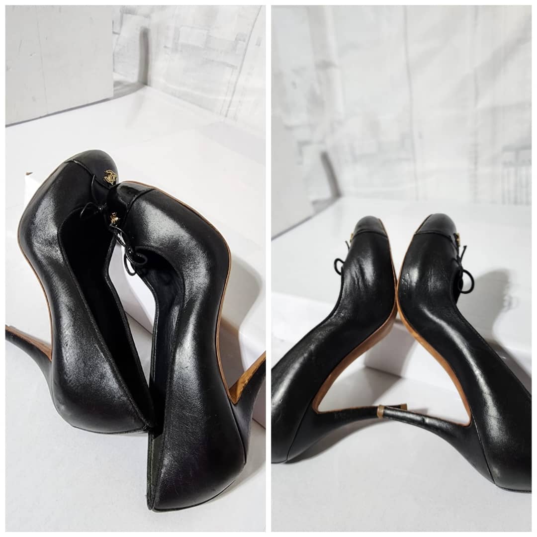 This authentic Chanel Leather And Patent CC Cap Toe Pumps Black Size 36C is in it’s good pre-owned condition. The exterior is clean and beautiful. The sole of the shoe shows scratch wear to it.