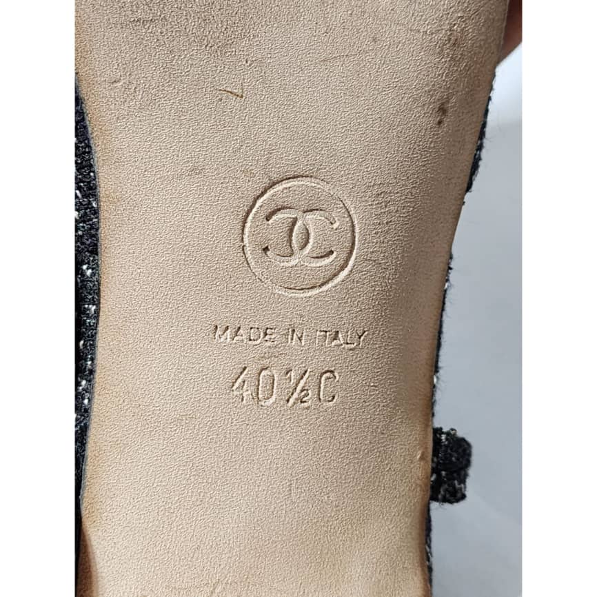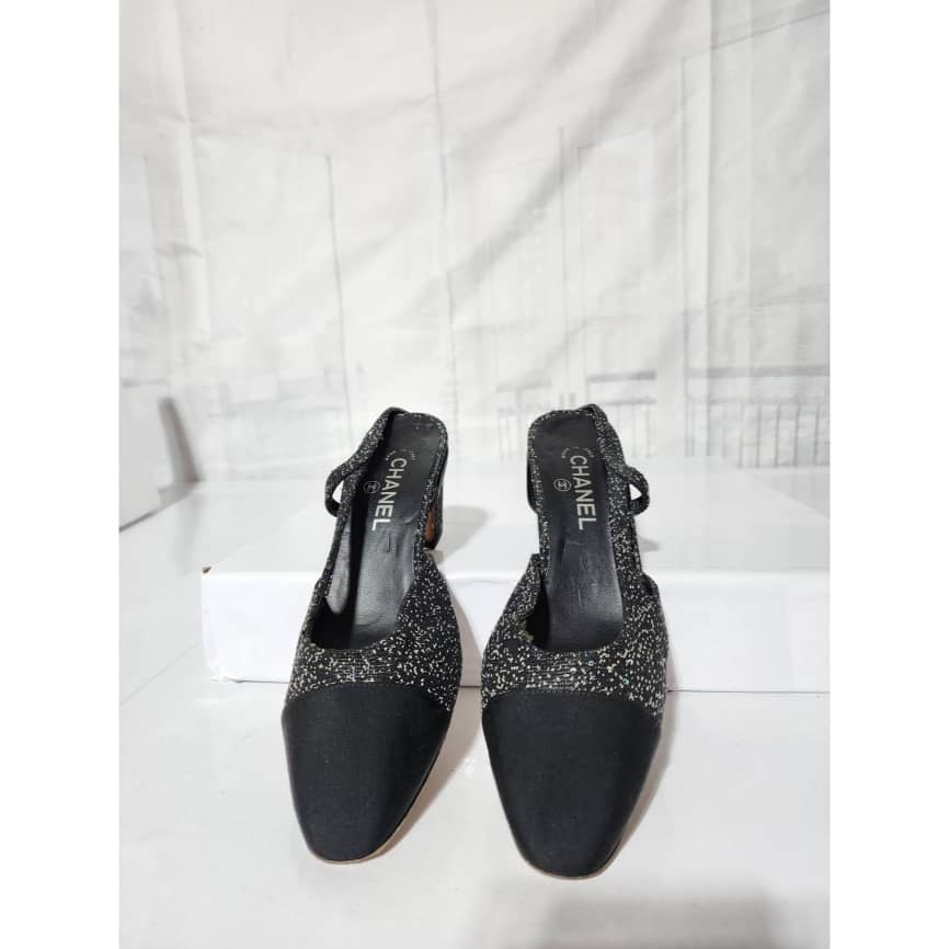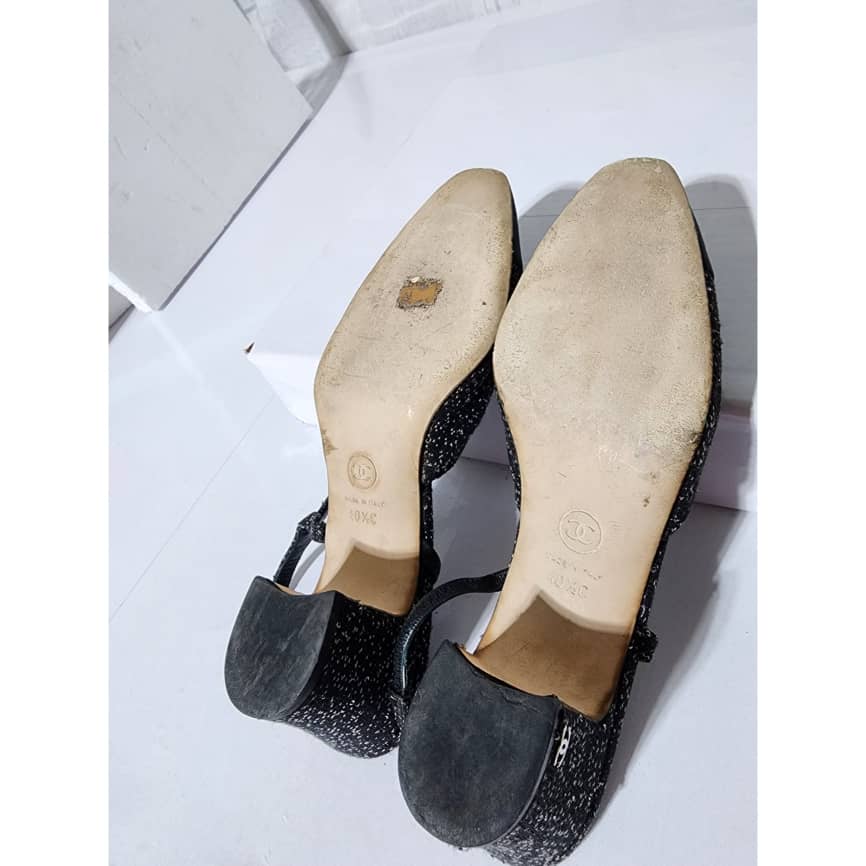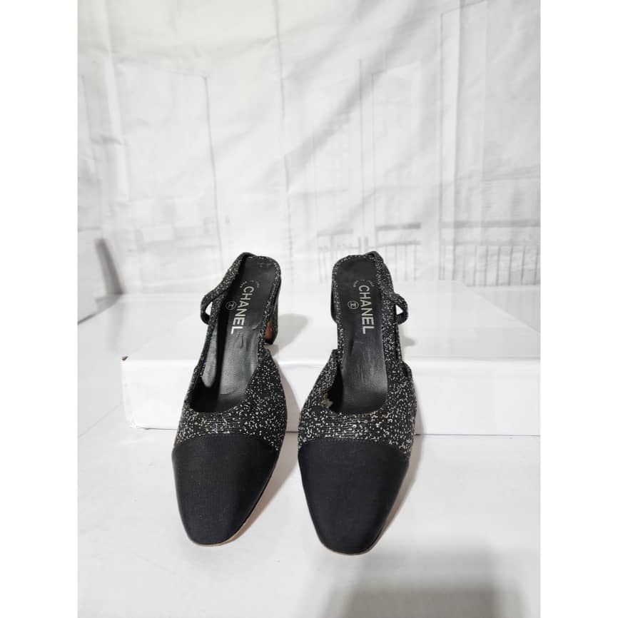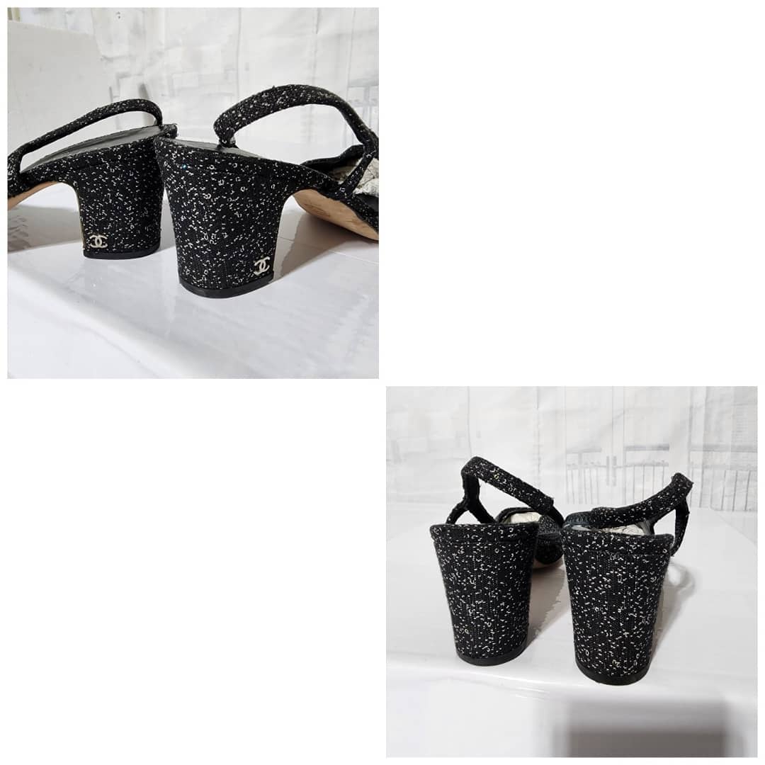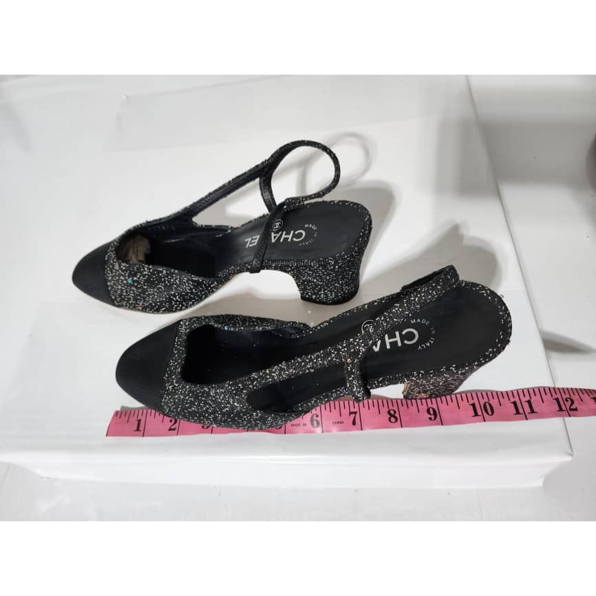 This authentic CHANEL Slingback Slingback Tweed Grosgrain Sequined Pumps Black Size 40.5 is in it’s pre-owned condition. The exterior is clean and beautiful. The interior is clean. Beneath the sole shows some scratches to it.