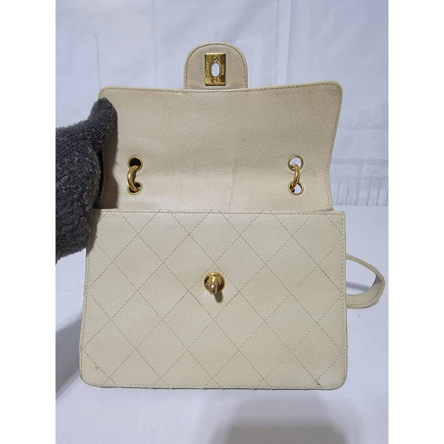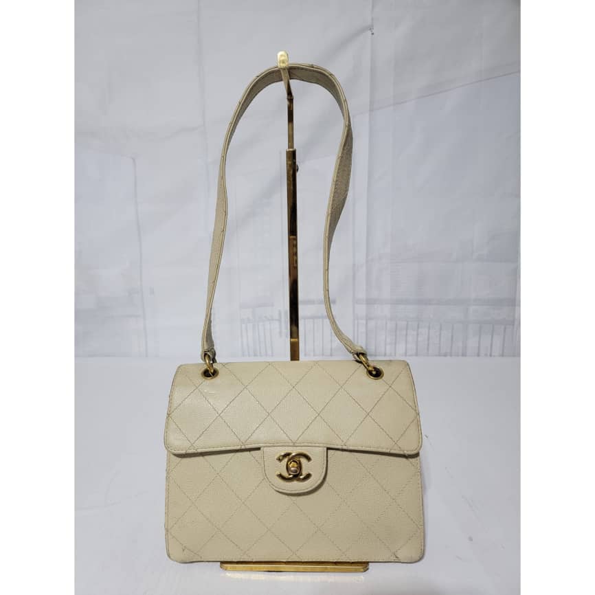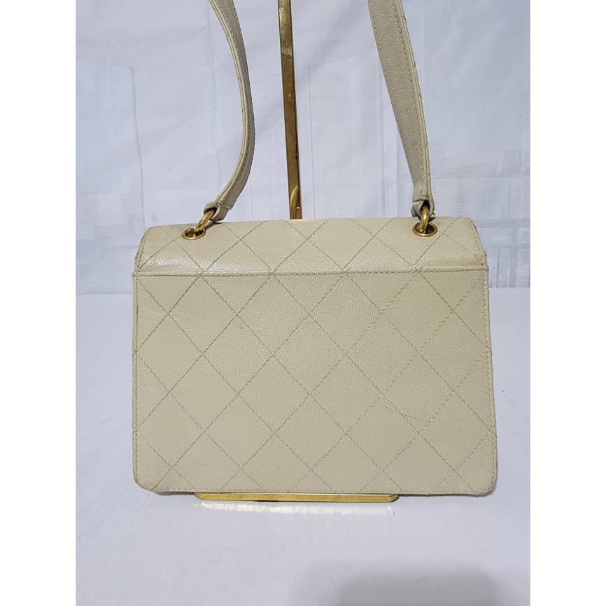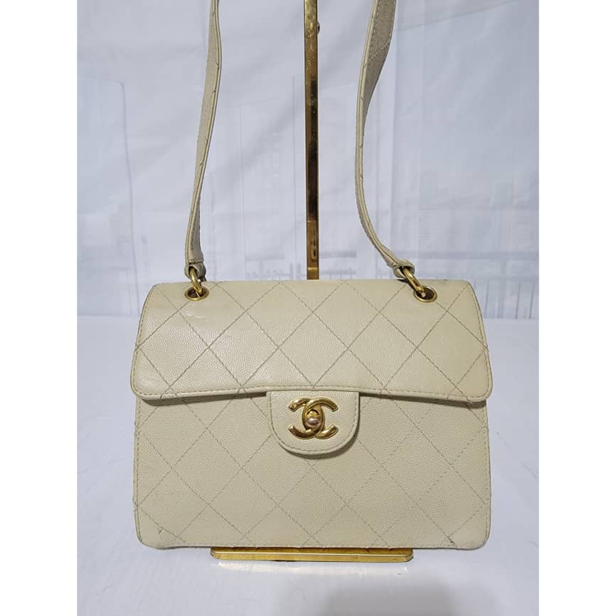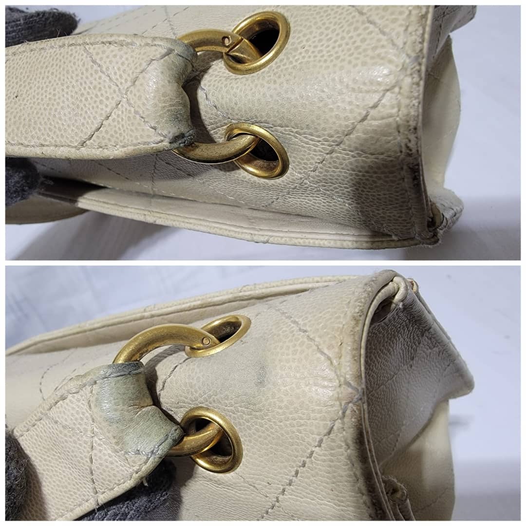 This authentic CHANEL vintage caviar beige flap bag Beige Cream is in it’s good pre-owned condition. The exterior is clean however, it shows sign of use. Interior is clean, it shows scratches for it vintage age. The gold ring on the flap of the bag shows the gold hardware rubbing on the caviar leather. There are some rubbing at the edge of the bag (Kindly look at pictures above). Good condition