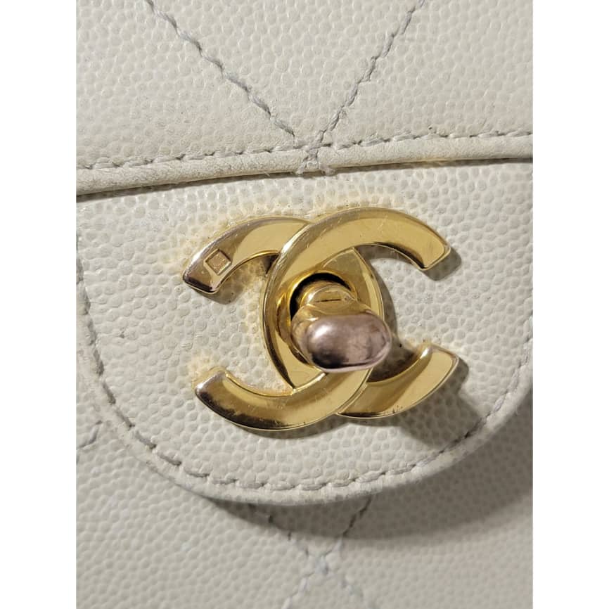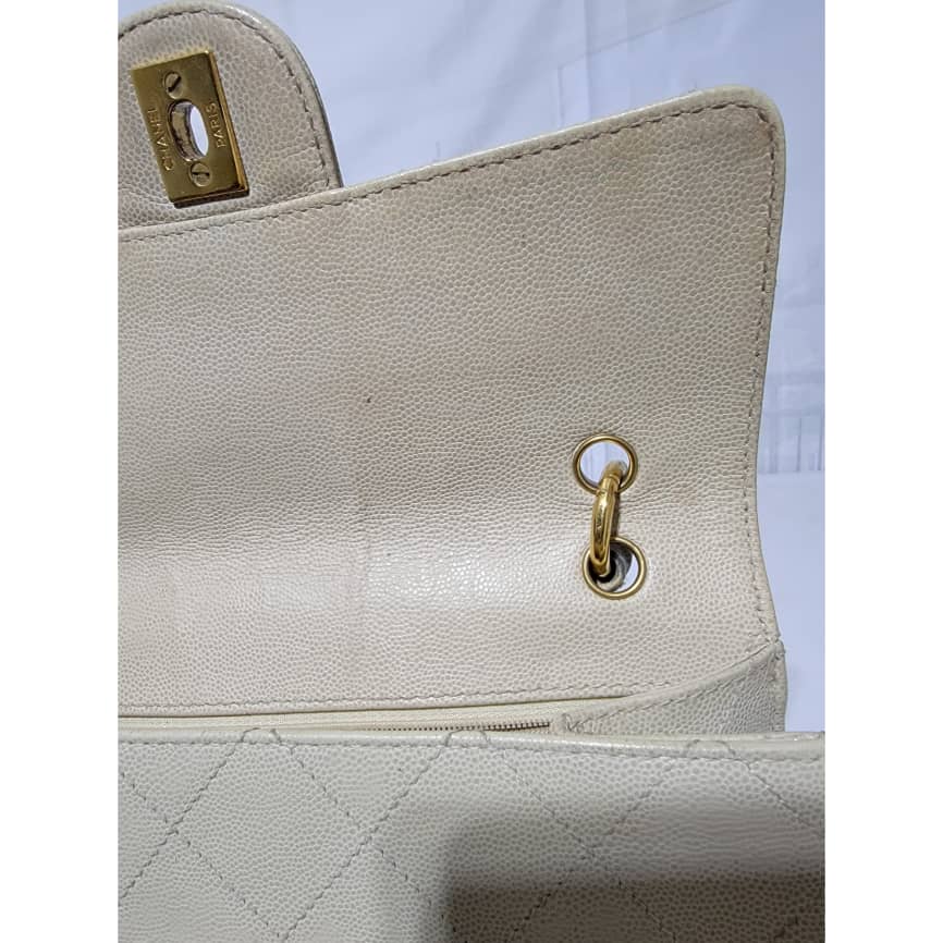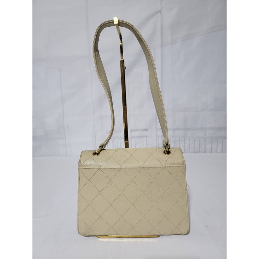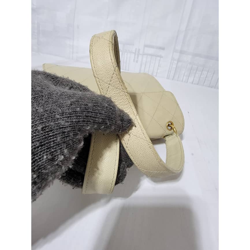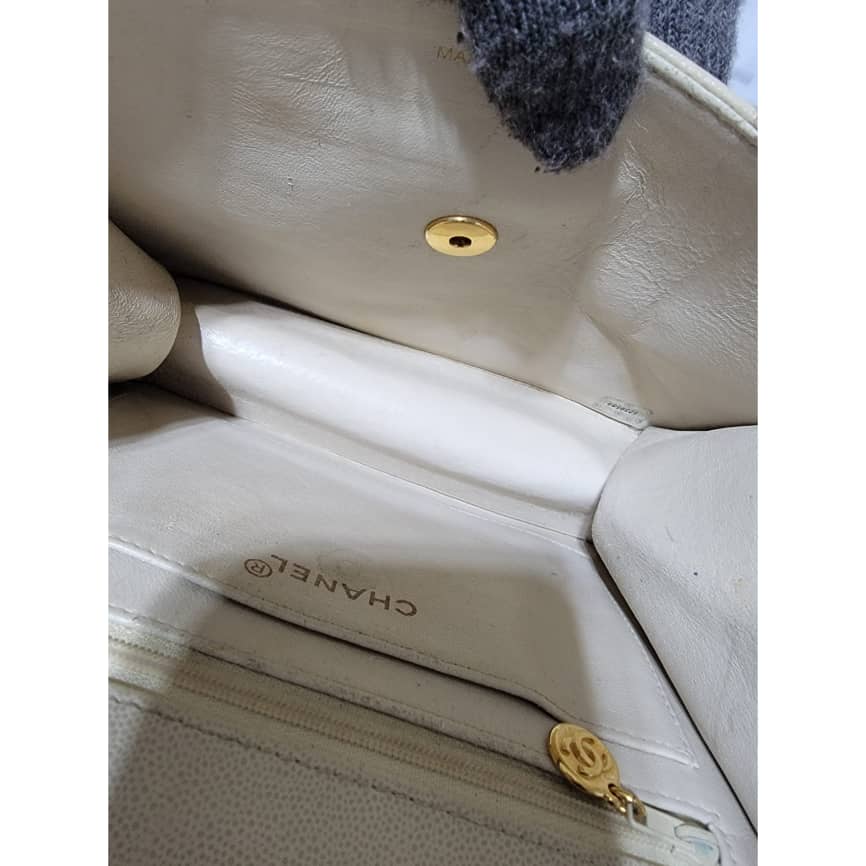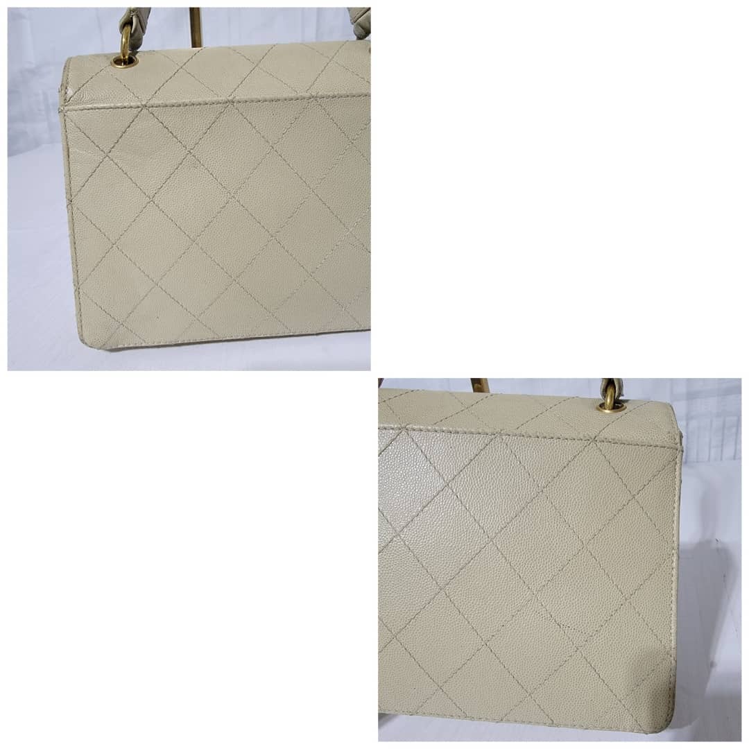 This authentic CHANEL vintage caviar beige flap bag Beige Cream is in it’s good pre-owned condition. The exterior is clean however, it shows sign of use. Interior is clean, it shows scratches for it vintage age. The gold ring on the flap of the bag shows the gold hardware rubbing on the caviar leather. There are some rubbing at the edge of the bag (Kindly look at pictures above). Good condition