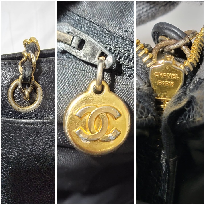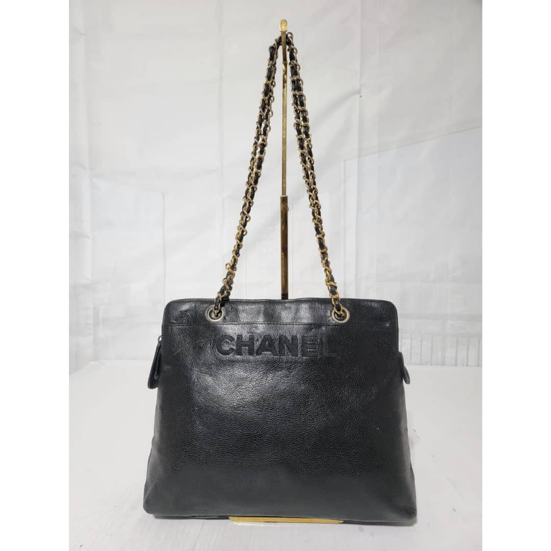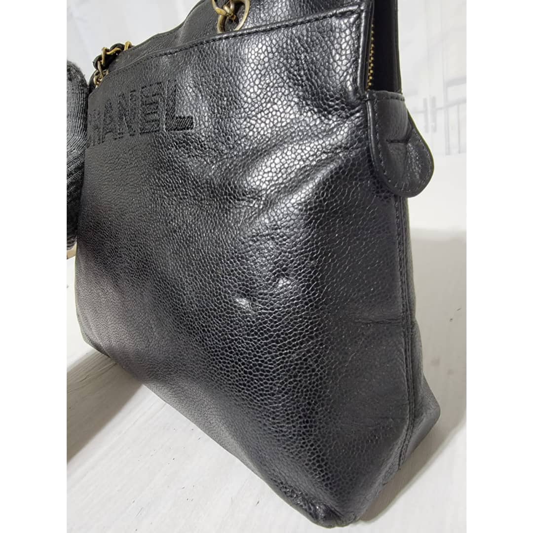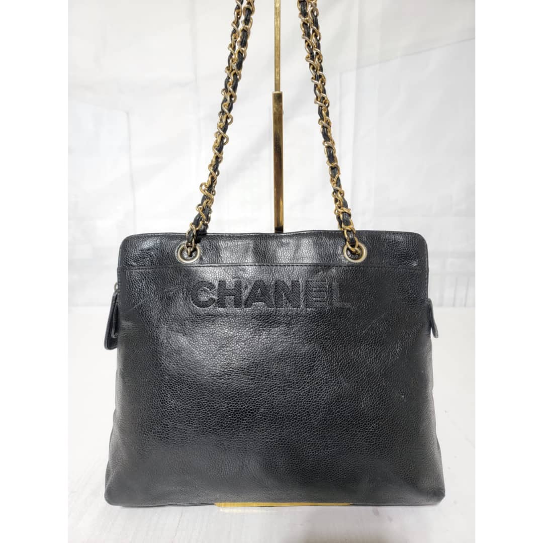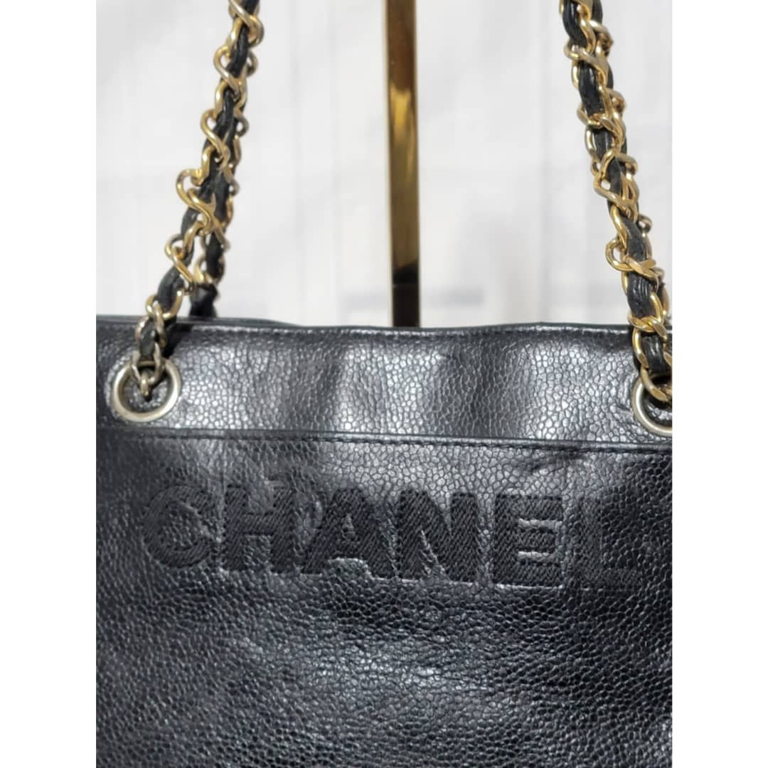This authentic Chanel Vintage Caviar Leather Sac Shopping Shoulder Bag Black is in it’s good pre-owned condition. The exterior is clean. The interior is clean. The gold hardware shows scratches. It has an embroidered chanel logo in front of the bag, it has a chanel gold hardware logo on the zipper pull and a 24 karat gold chain handle, however it shows scratches. It is in it’s good vintage condition.
