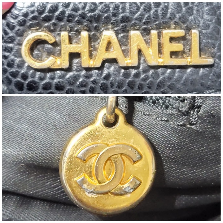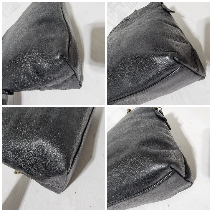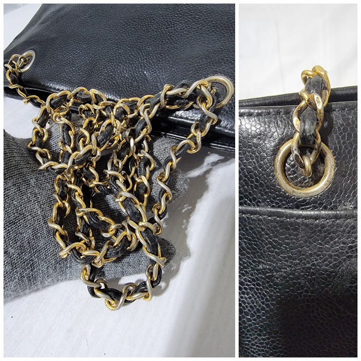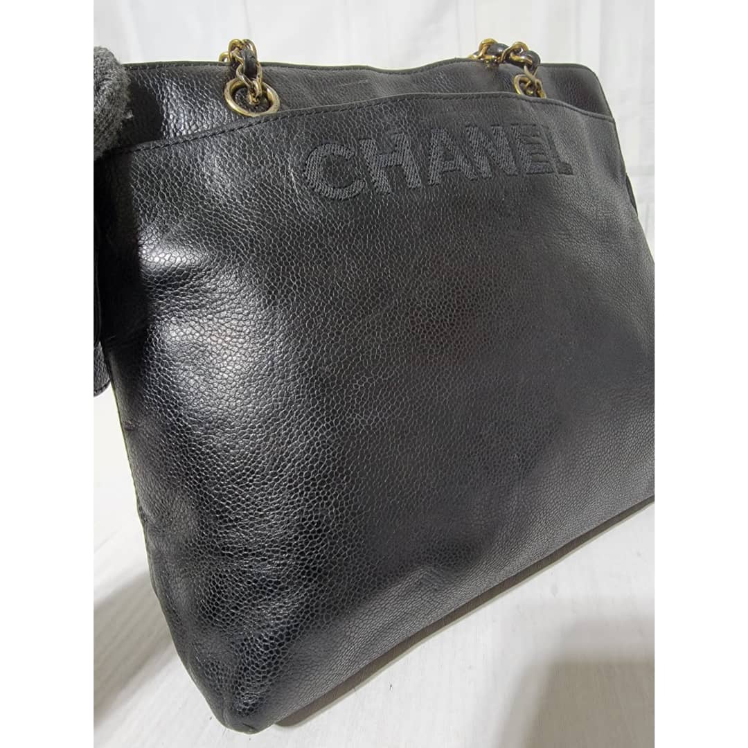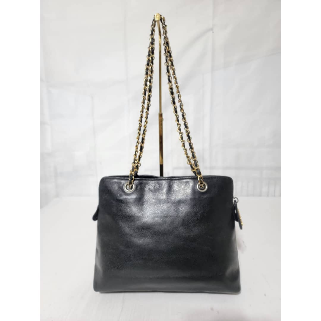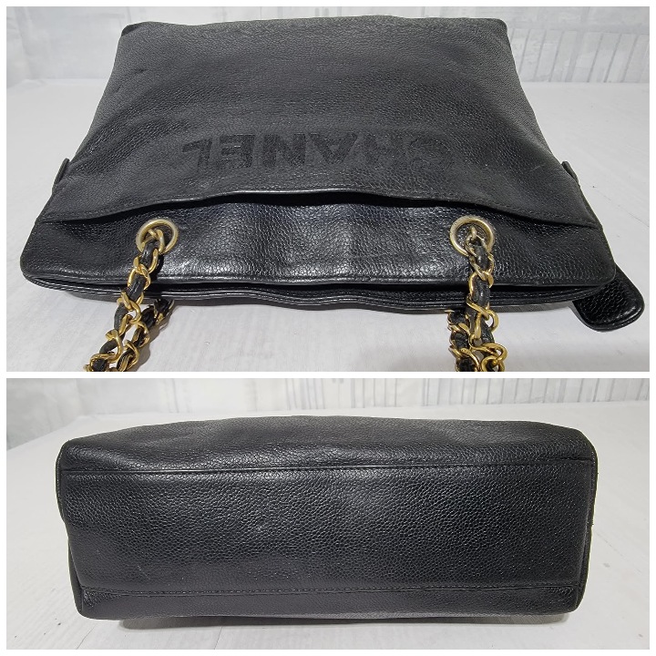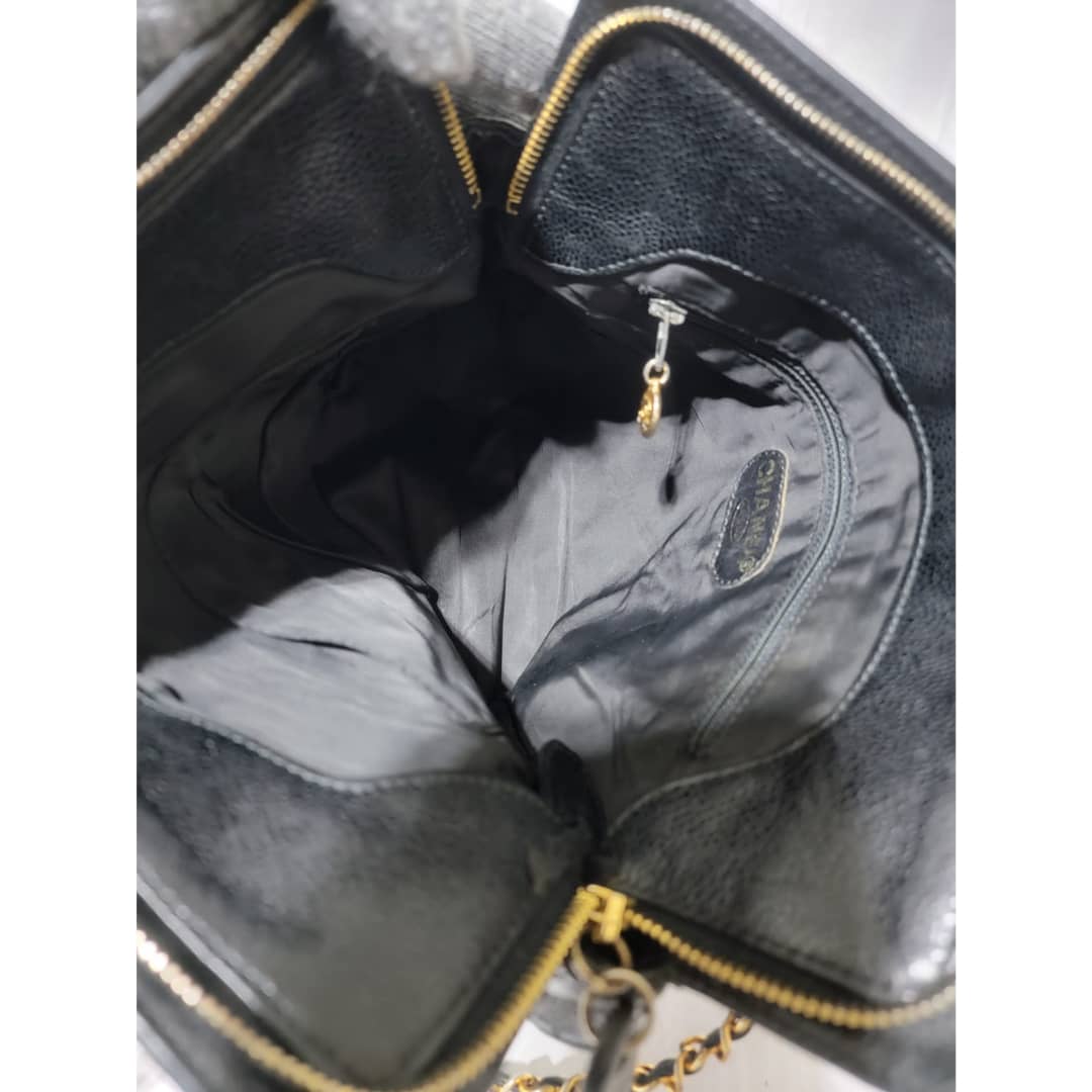 This authentic Chanel Vintage Caviar Leather Sac Shopping Shoulder Bag Black is in it’s good pre-owned condition. The exterior is clean. The interior is clean. The gold hardware shows scratches. It has an embroidered chanel logo in front of the bag, it has a chanel gold hardware logo on the zipper pull and a 24 karat gold chain handle, however it shows scratches. It is in it’s good vintage condition.