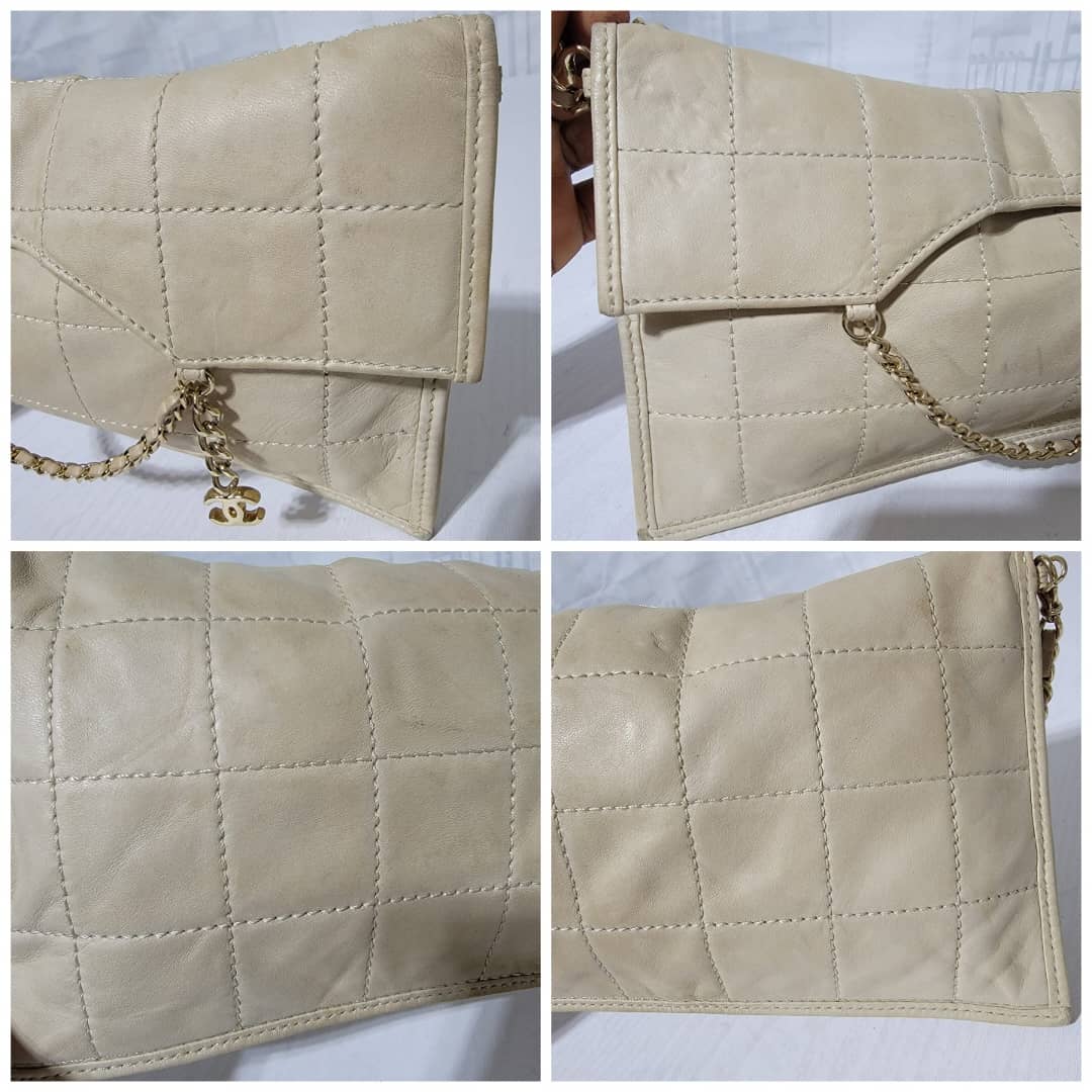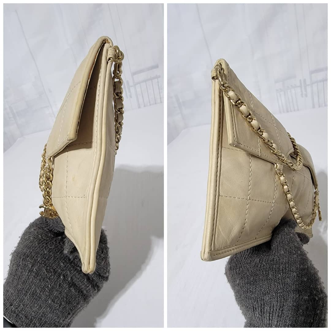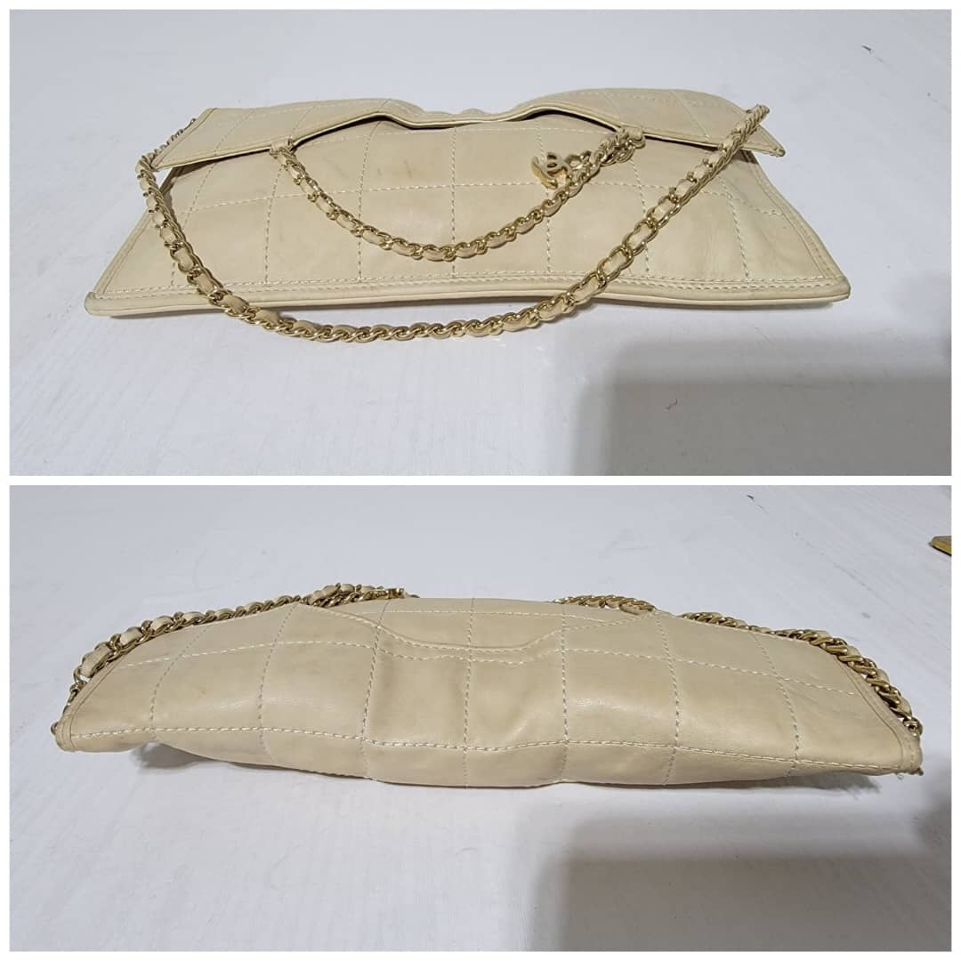This authentic CHANEL Box Quilted Fold Down Envelope Clutch Bag Beige is in it’s pre-owned condition. The exterior shows sign of wear, slight dirt on it and little dotted dent (Kindly look at pictures above for more details). Interior is clean.