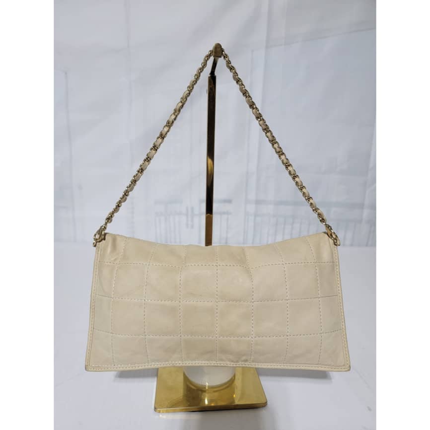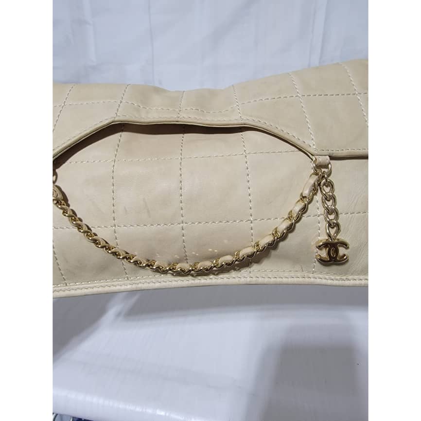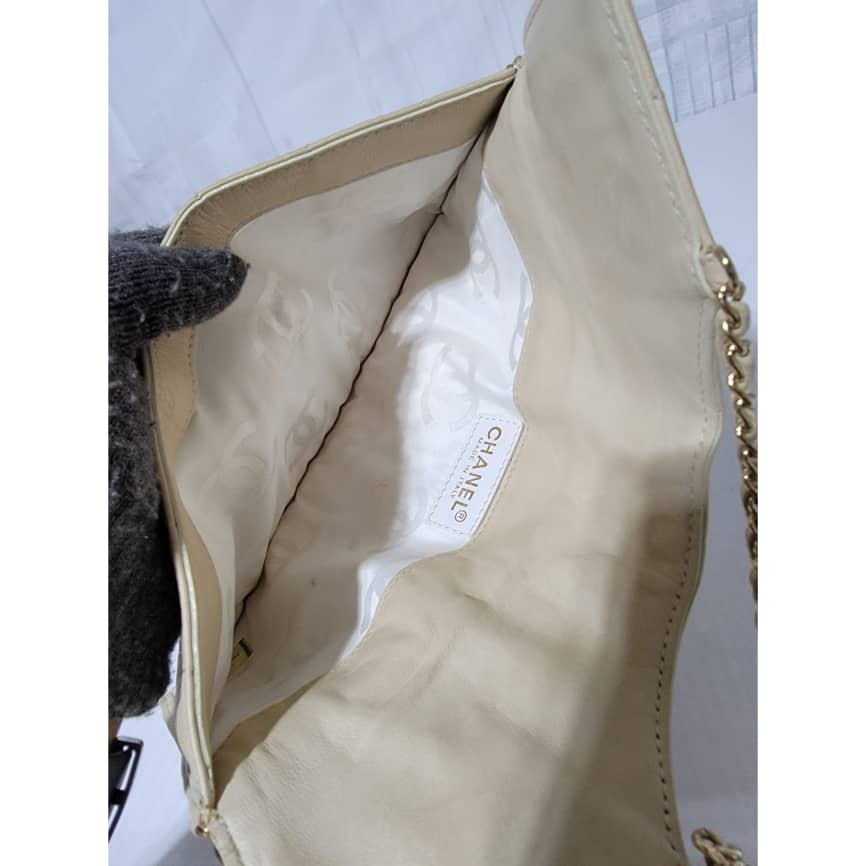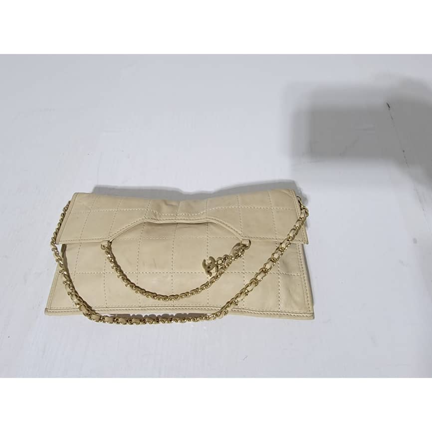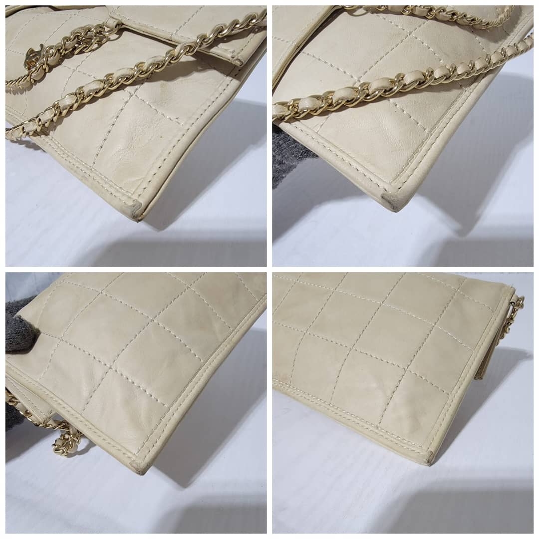 This authentic CHANEL Box Quilted Fold Down Envelope Clutch Bag Beige is in it’s pre-owned condition. The exterior shows sign of wear, slight dirt on it and little dotted dent (Kindly look at pictures above for more details). Interior is clean.