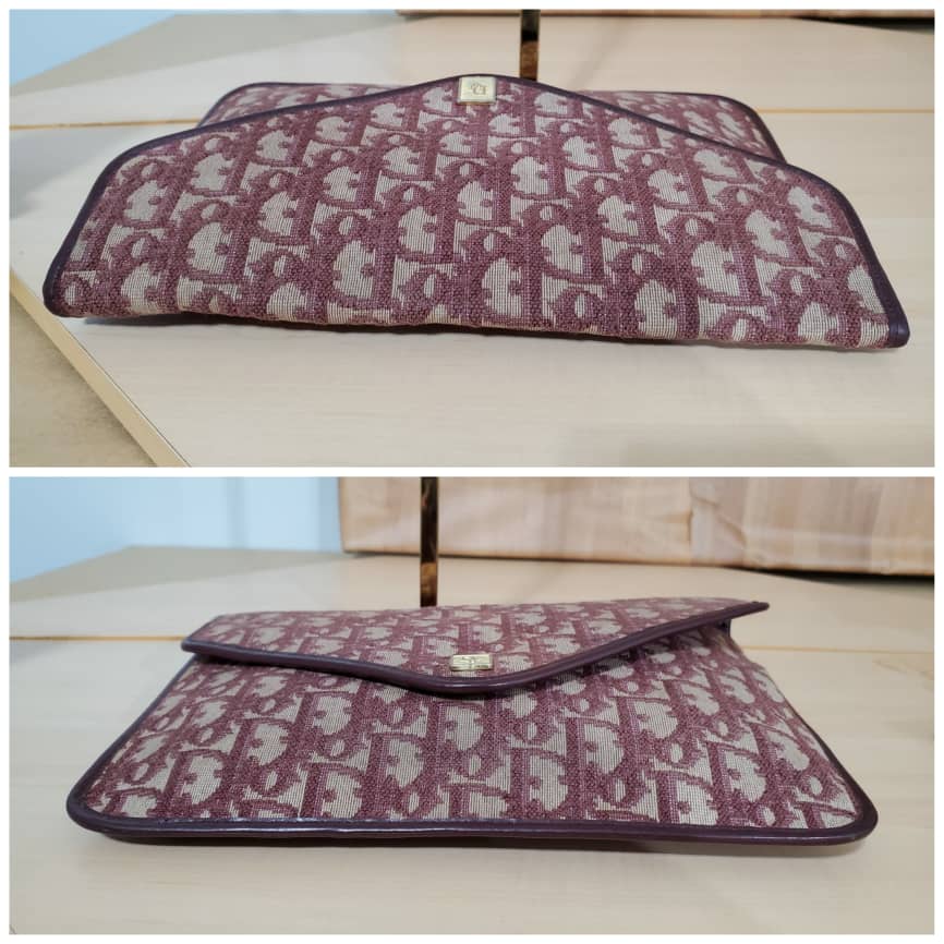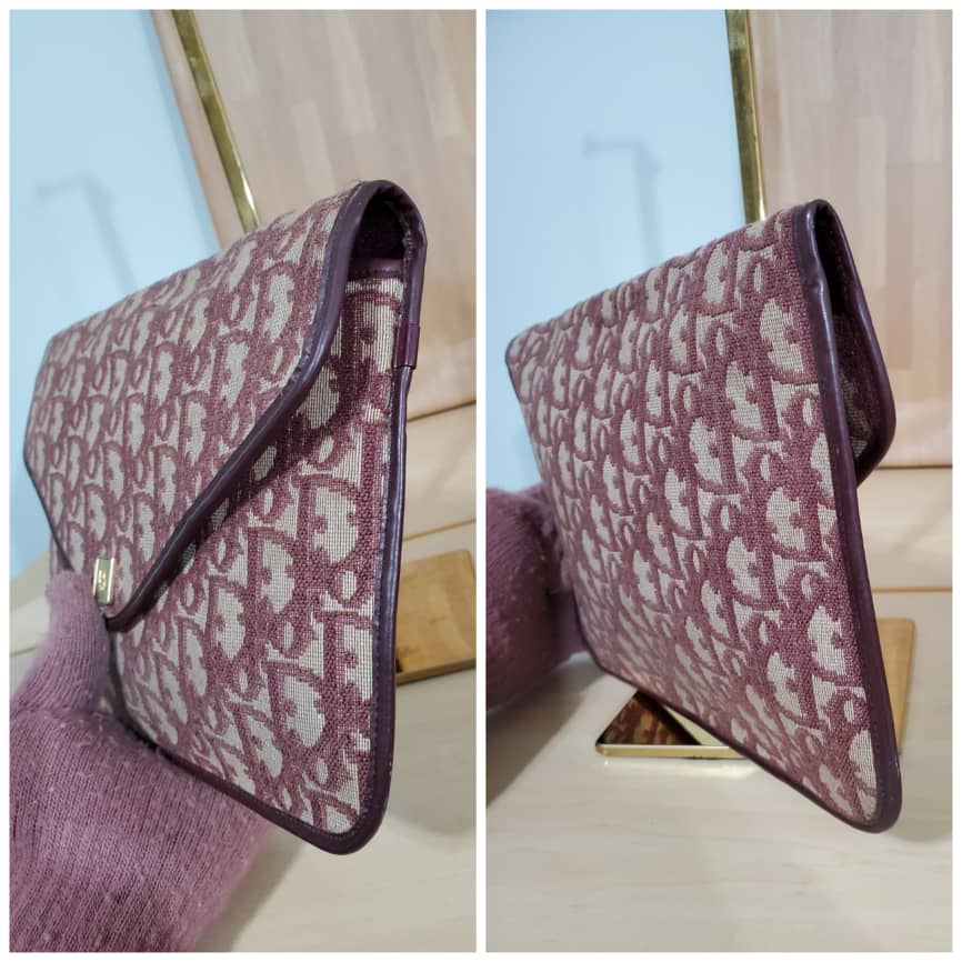 1970s Burgundy Monogram Canvas Envelope Clutch is in it’s pre-owned good condition. The exterior canvas is clean. Interior is clean. Can be worn as a clutch or converted to a Crossbody