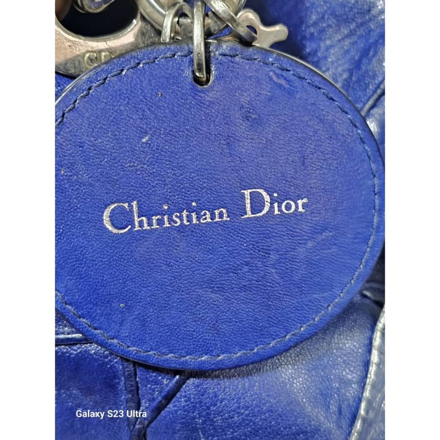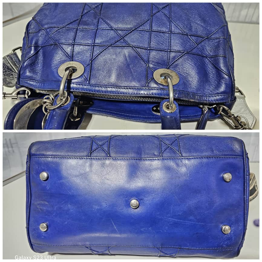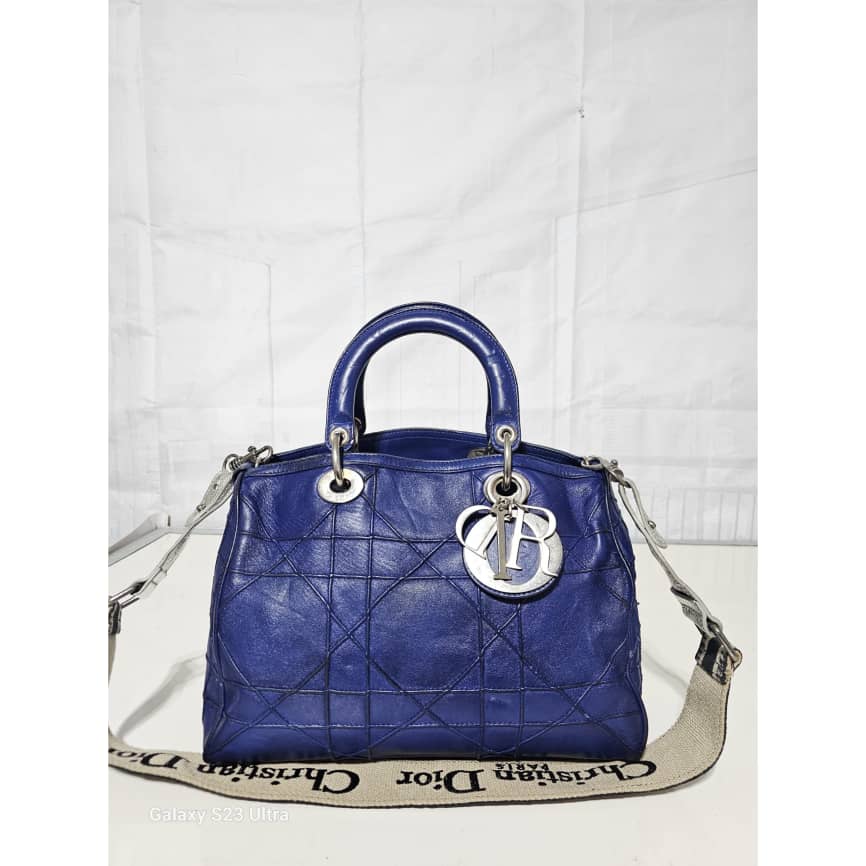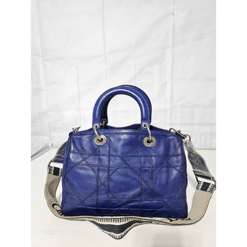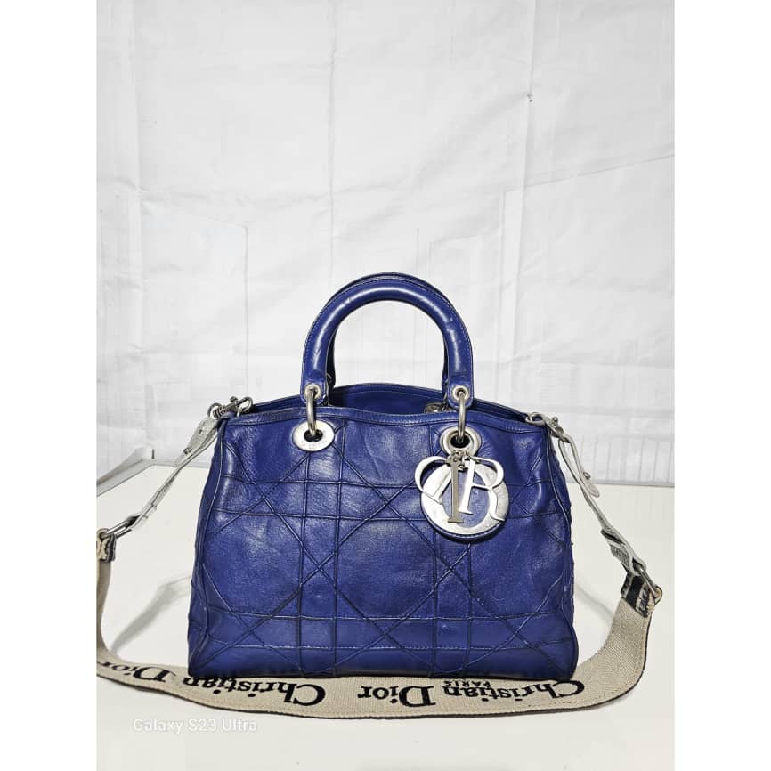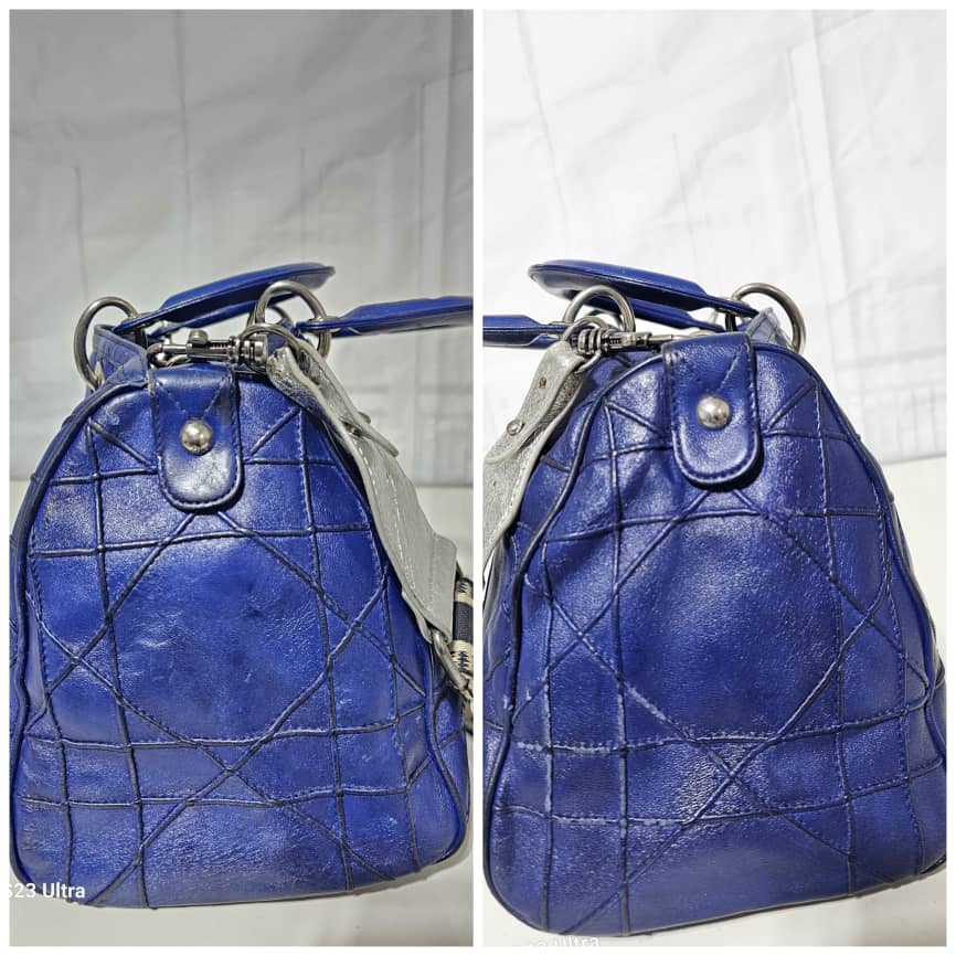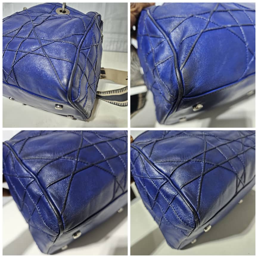 This authentic Christian Dior Cannage Granville Polochon Bag Blue is in it’s good pre-owned condition. The exterior leather is clean with some rubbing at the leather and base edges. The interior is clean. Silver hardware. The strap is a generic strap, it is not originally made for this bag. Just included to give a shoulder/ crossbody fit