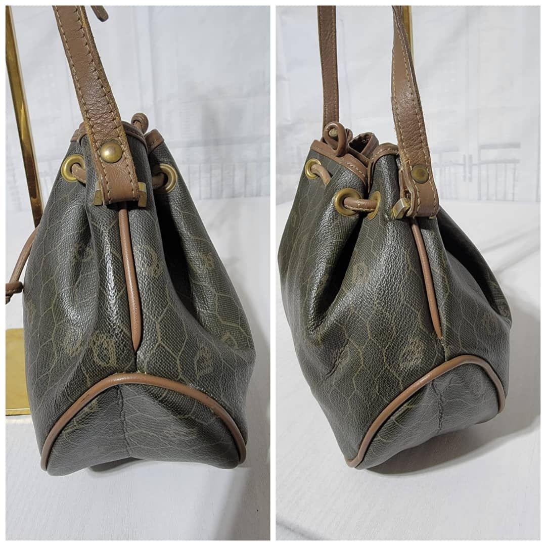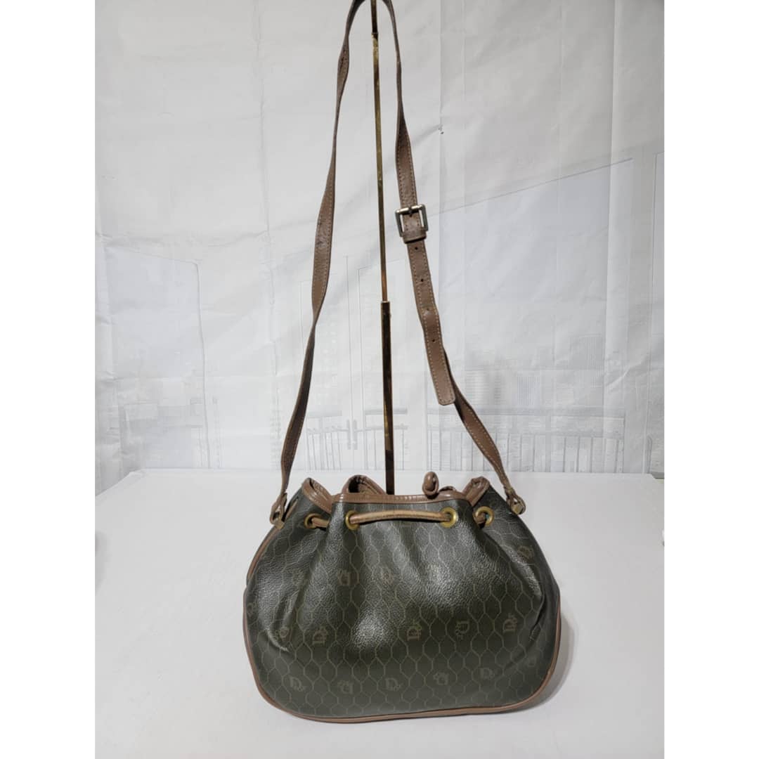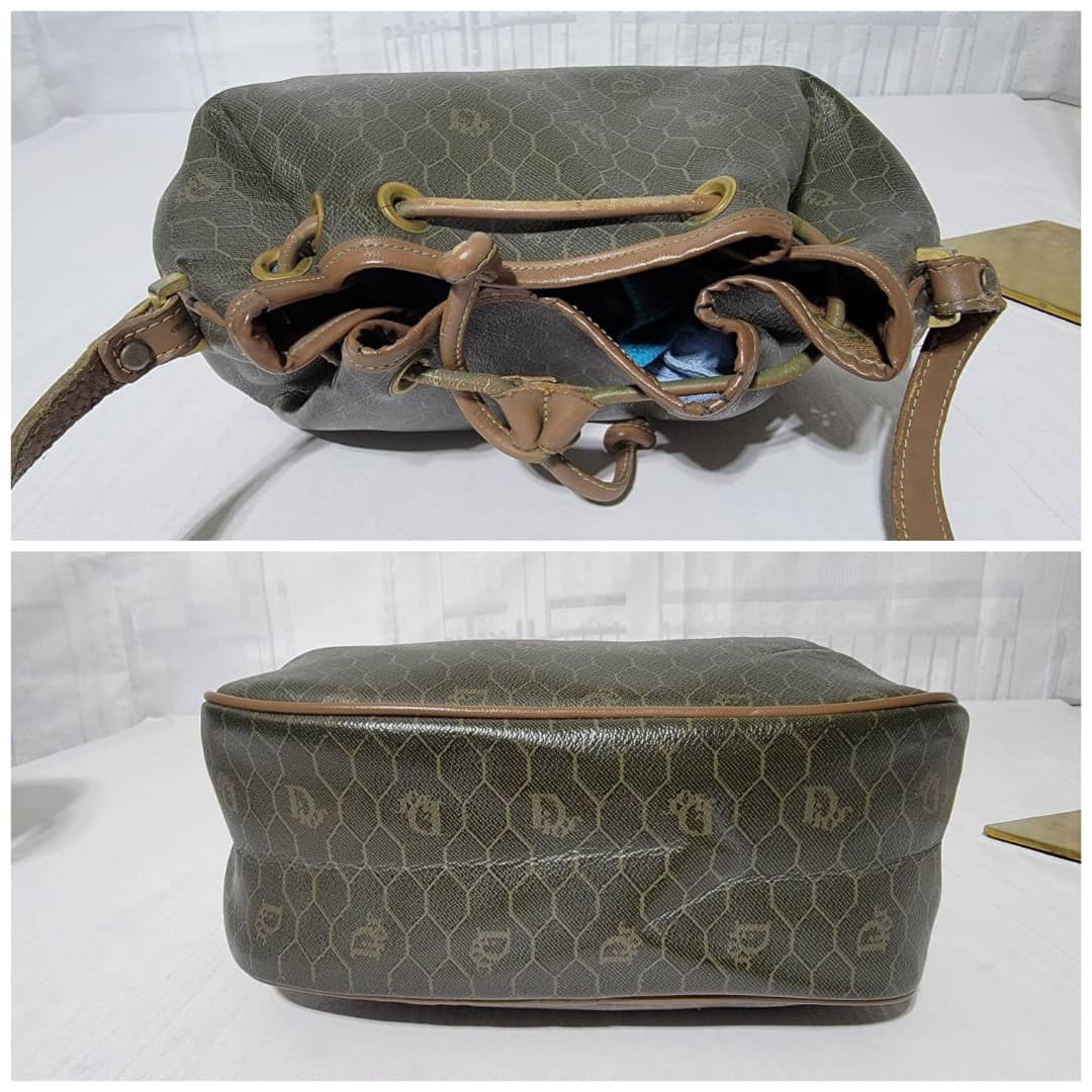 This authentic Christian Dior Vintage honeycomb Drawstring Crossbody Bag Brown is in it’s good pre-owned condition. The exterior coated canvas is clean and beautiful. The top brown leather trim and handle is clean but shows some scratches. Interior is clean. Gold hardware is clean but shows some tarnishing.