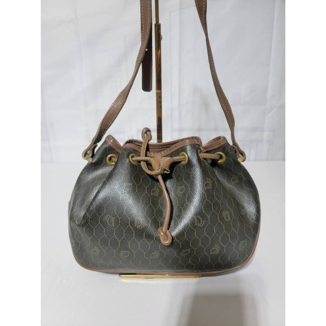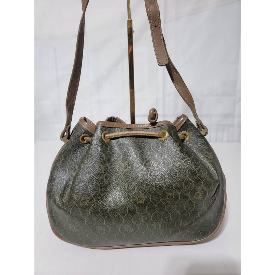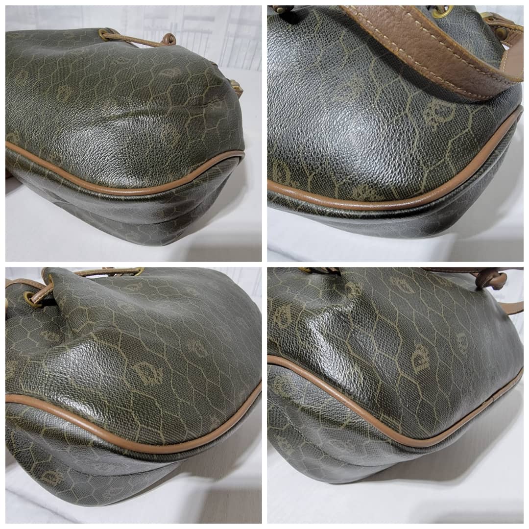 This authentic Christian Dior Vintage honeycomb Drawstring Crossbody Bag Brown is in it’s good pre-owned condition. The exterior coated canvas is clean and beautiful. The top brown leather trim and handle is clean but shows some scratches. Interior is clean. Gold hardware is clean but shows some tarnishing.
