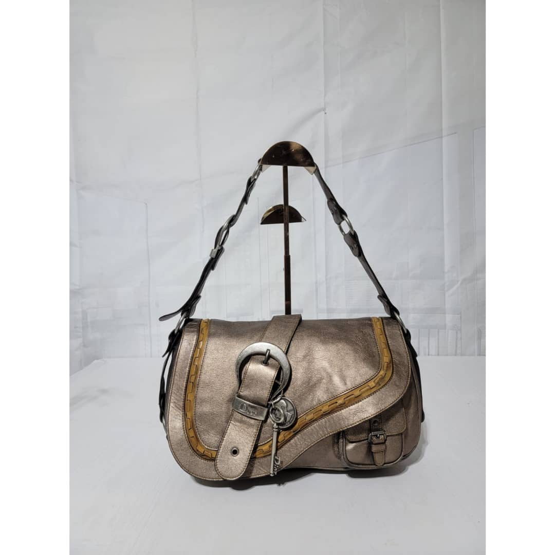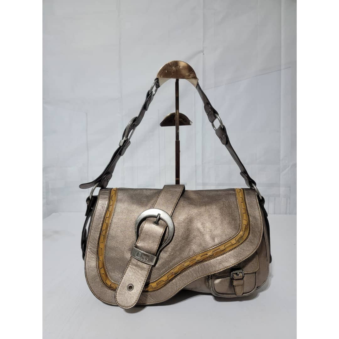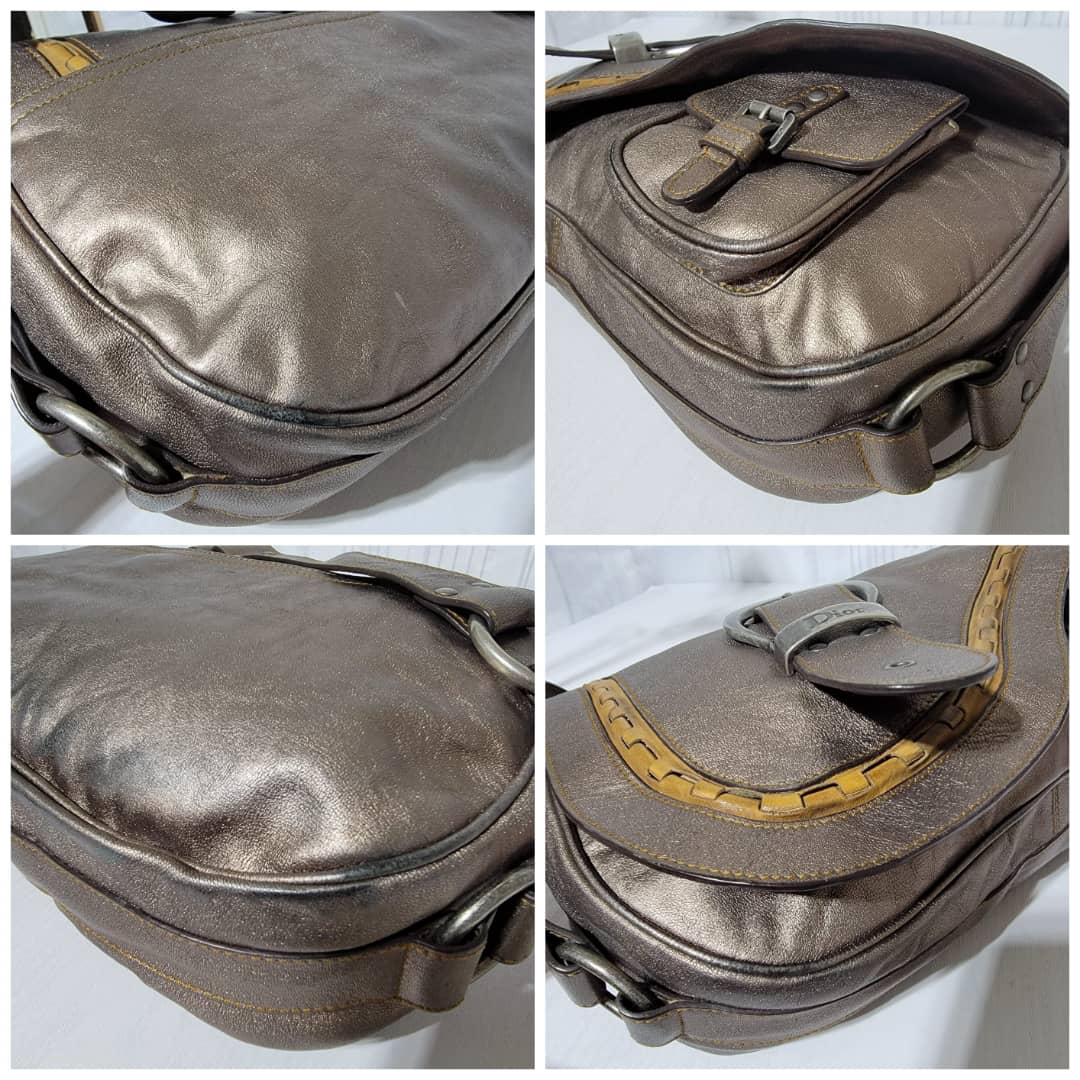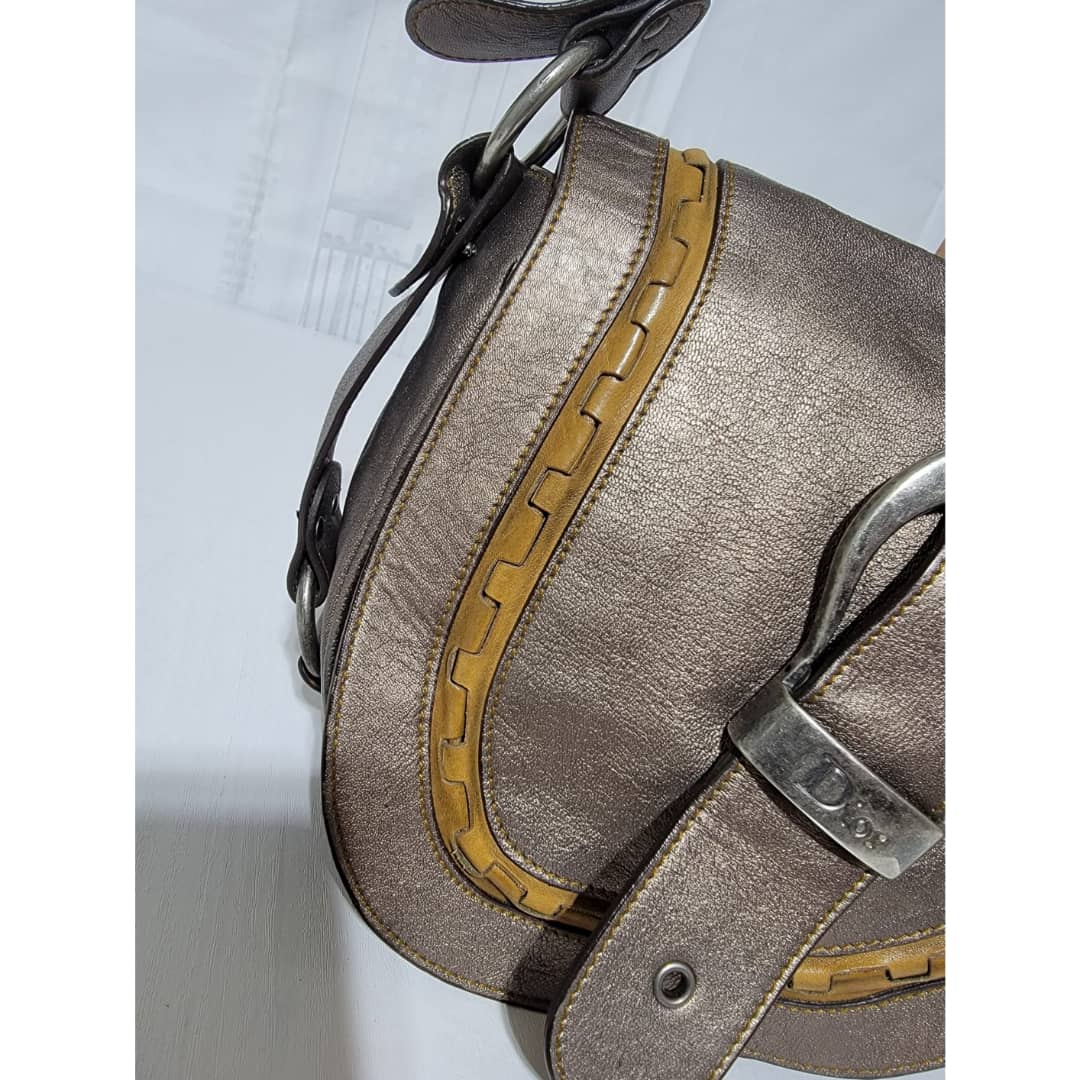 This authentic Dior Metallic Khaki Leather Gaucho Saddle Bag is in it’s good pre-owned condition. The exterior leather is clean and beautiful. There is a little rubbing at the back base corner of the bag. Interior is clean. Silver hardware. Has a beautiful charm