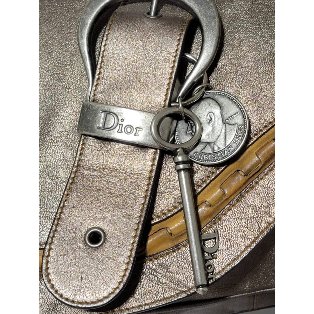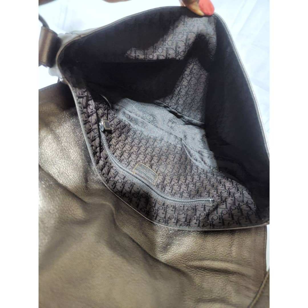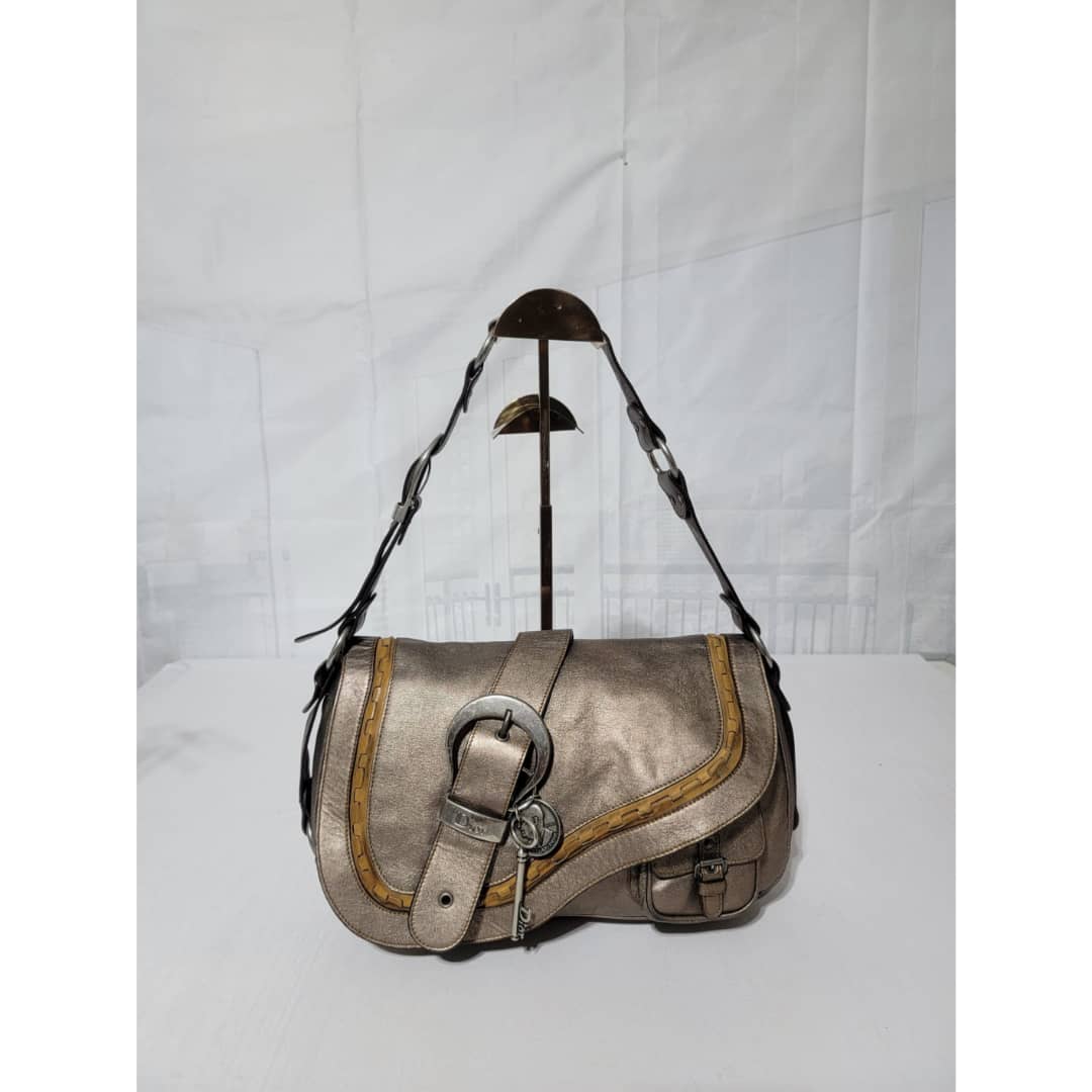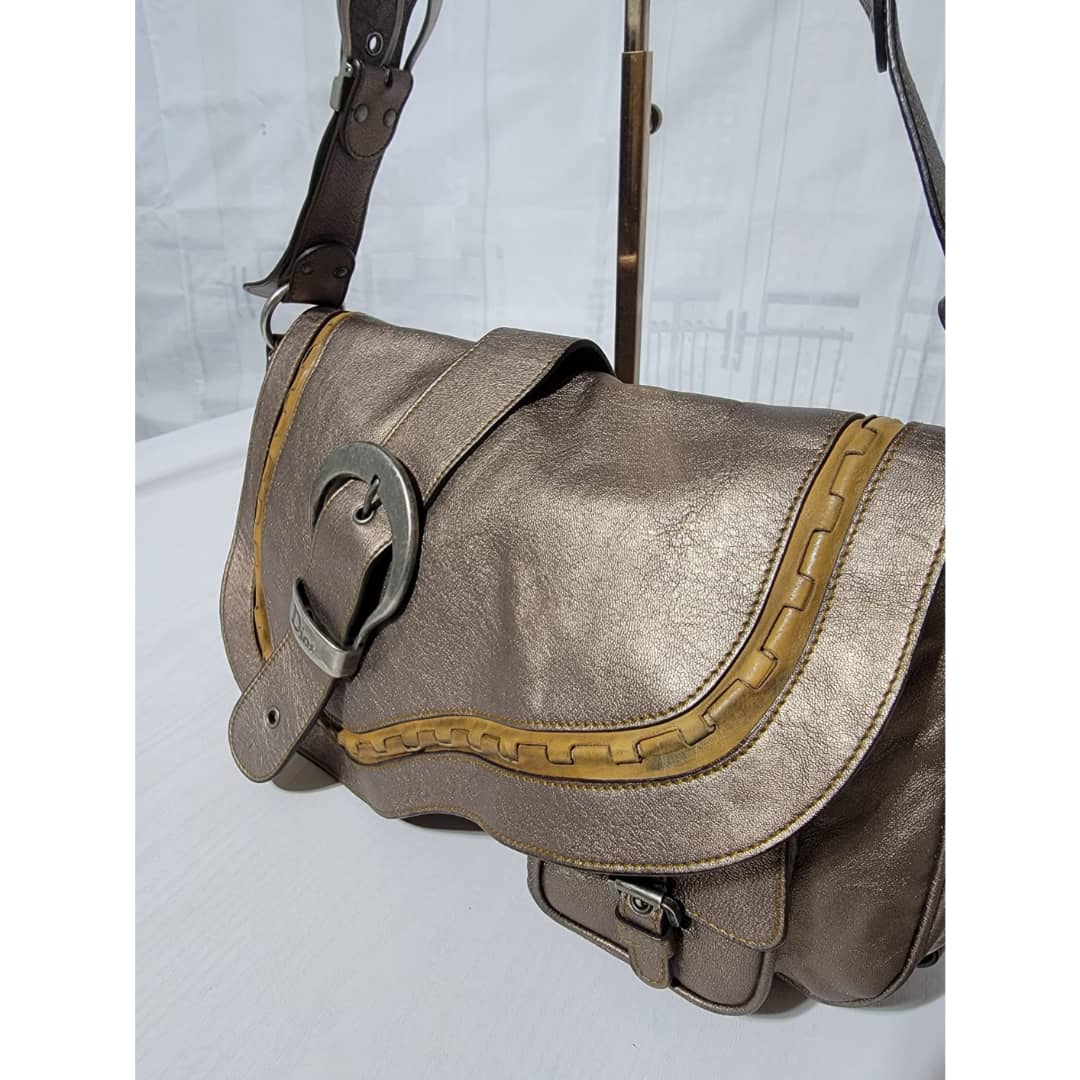 This authentic Dior Metallic Khaki Leather Gaucho Saddle Bag is in it’s good pre-owned condition. The exterior leather is clean and beautiful. There is a little rubbing at the back base corner of the bag. Interior is clean. Silver hardware. Has a beautiful charm