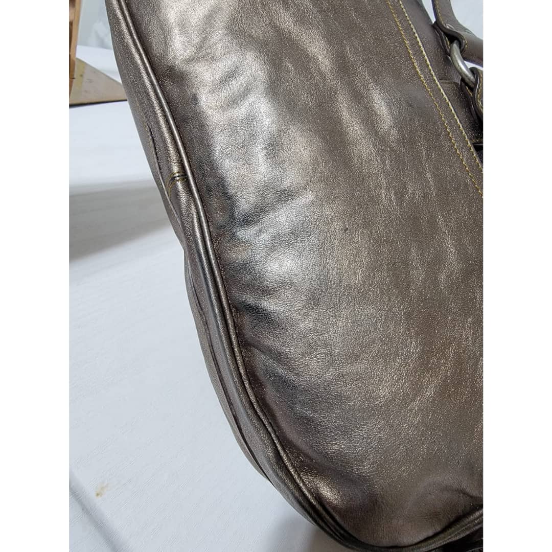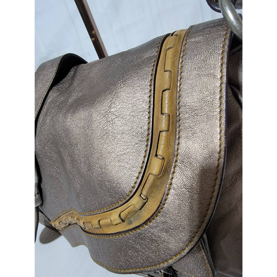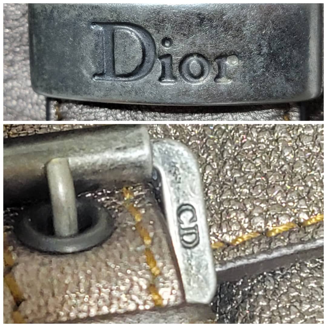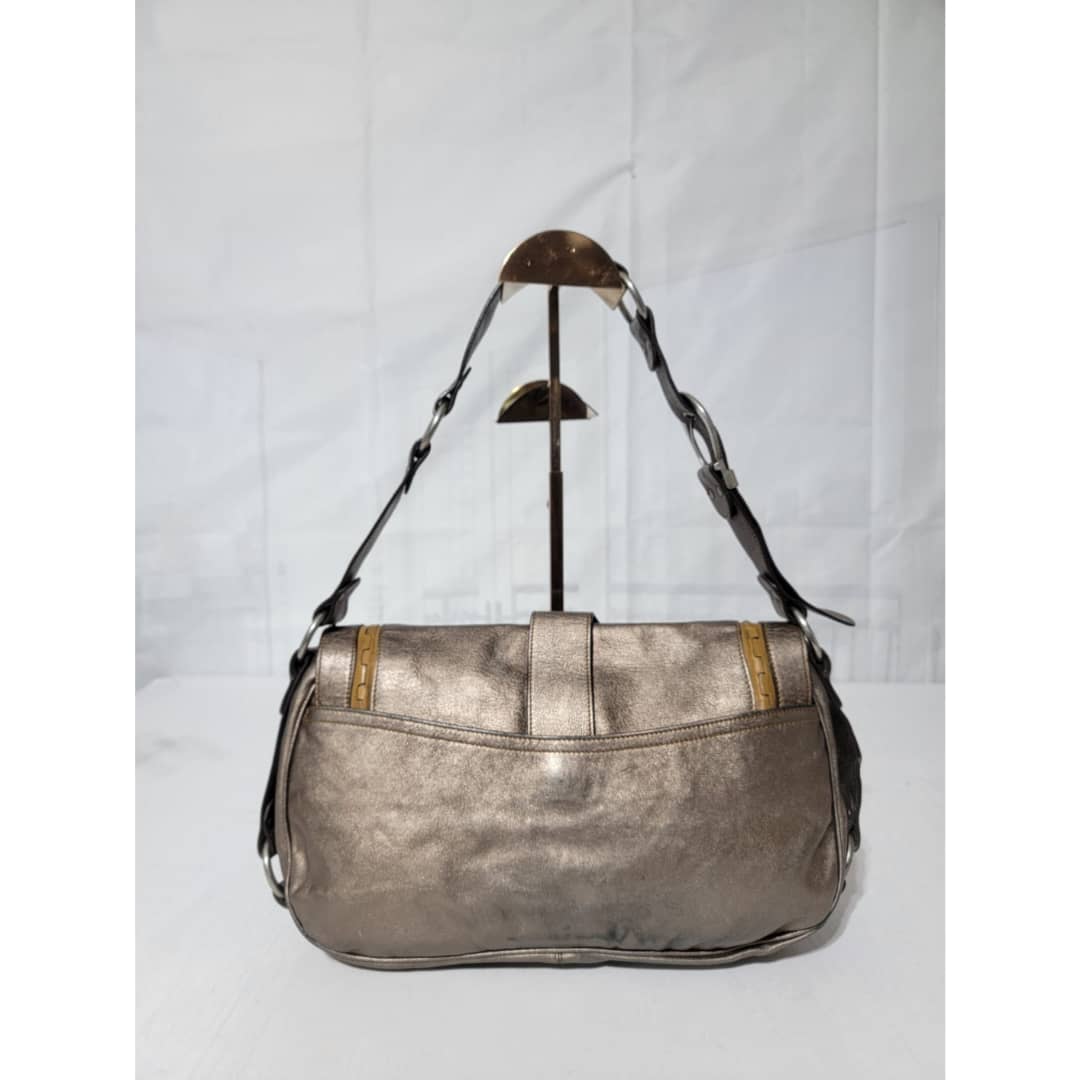 This authentic Dior Metallic Khaki Leather Gaucho Saddle Bag is in it’s good pre-owned condition. The exterior leather is clean and beautiful. There is a little rubbing at the back base corner of the bag. Interior is clean. Silver hardware. Has a beautiful charm