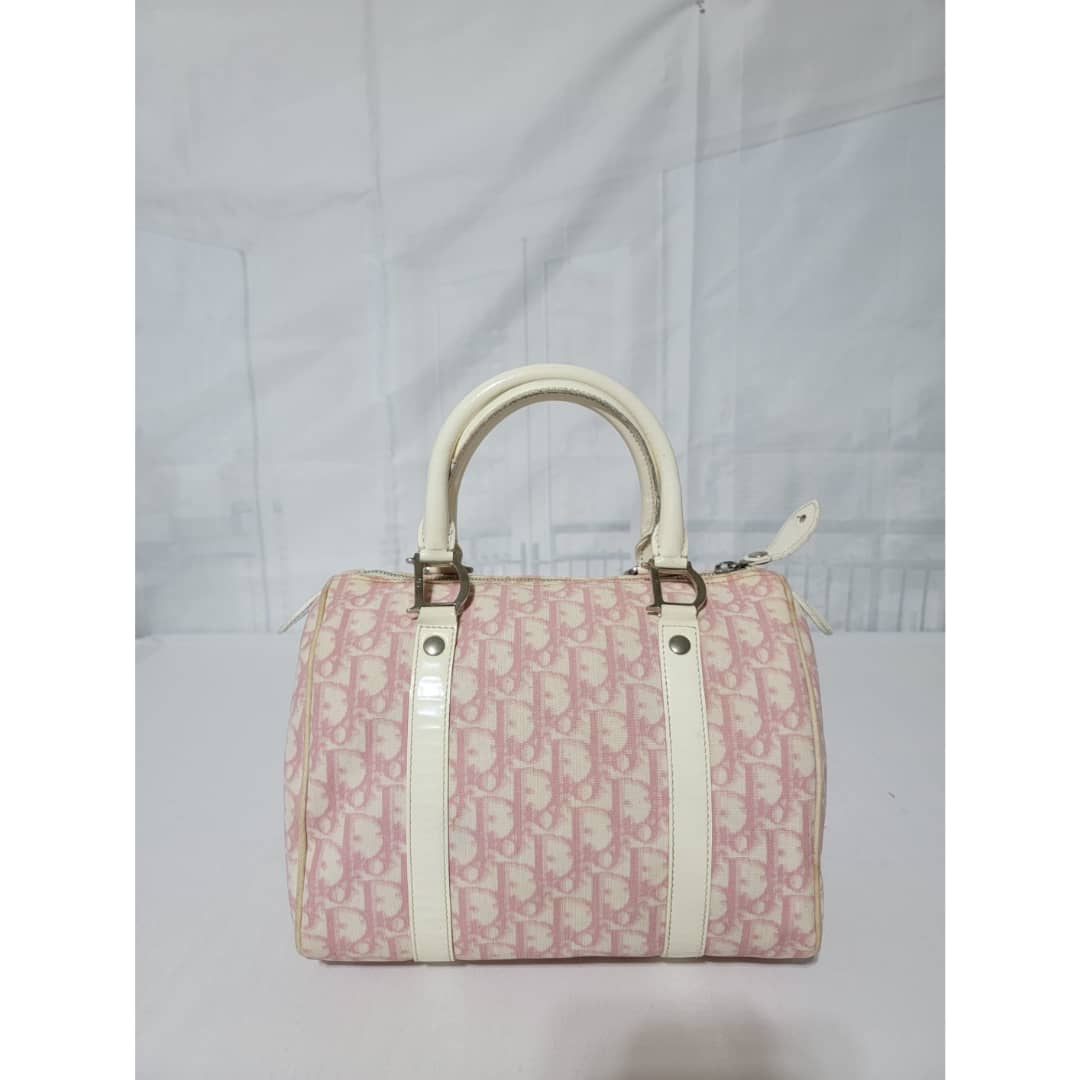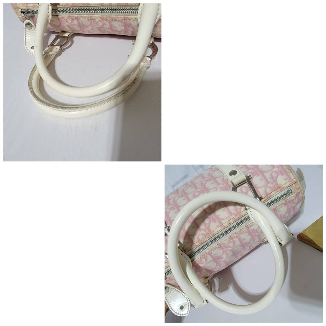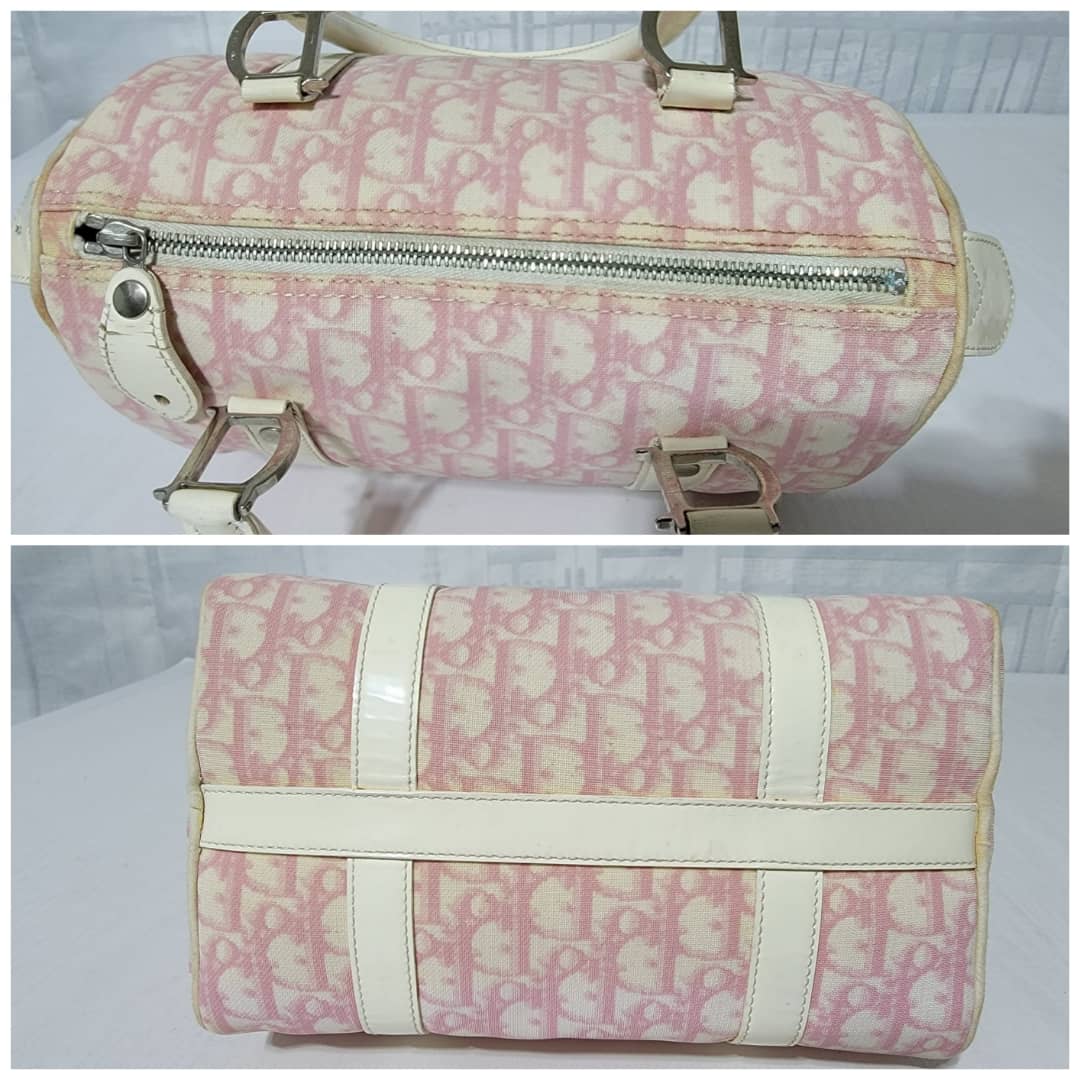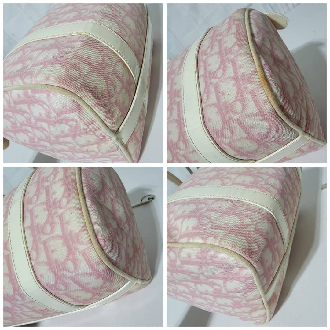 This authentic CHRISTIAN DIOR Monogram Boston Bag Pink is in it’s good pre-owned condition. The exterior coated canvas is clean and beautiful. The edges off white trim that runs by the side of the bag shows some little wear to it, it is not so obvious. The handles shows little rubbing. Silver hardware. The zipper pull shows little crack (Kindly look at pictures). Interior is clean.