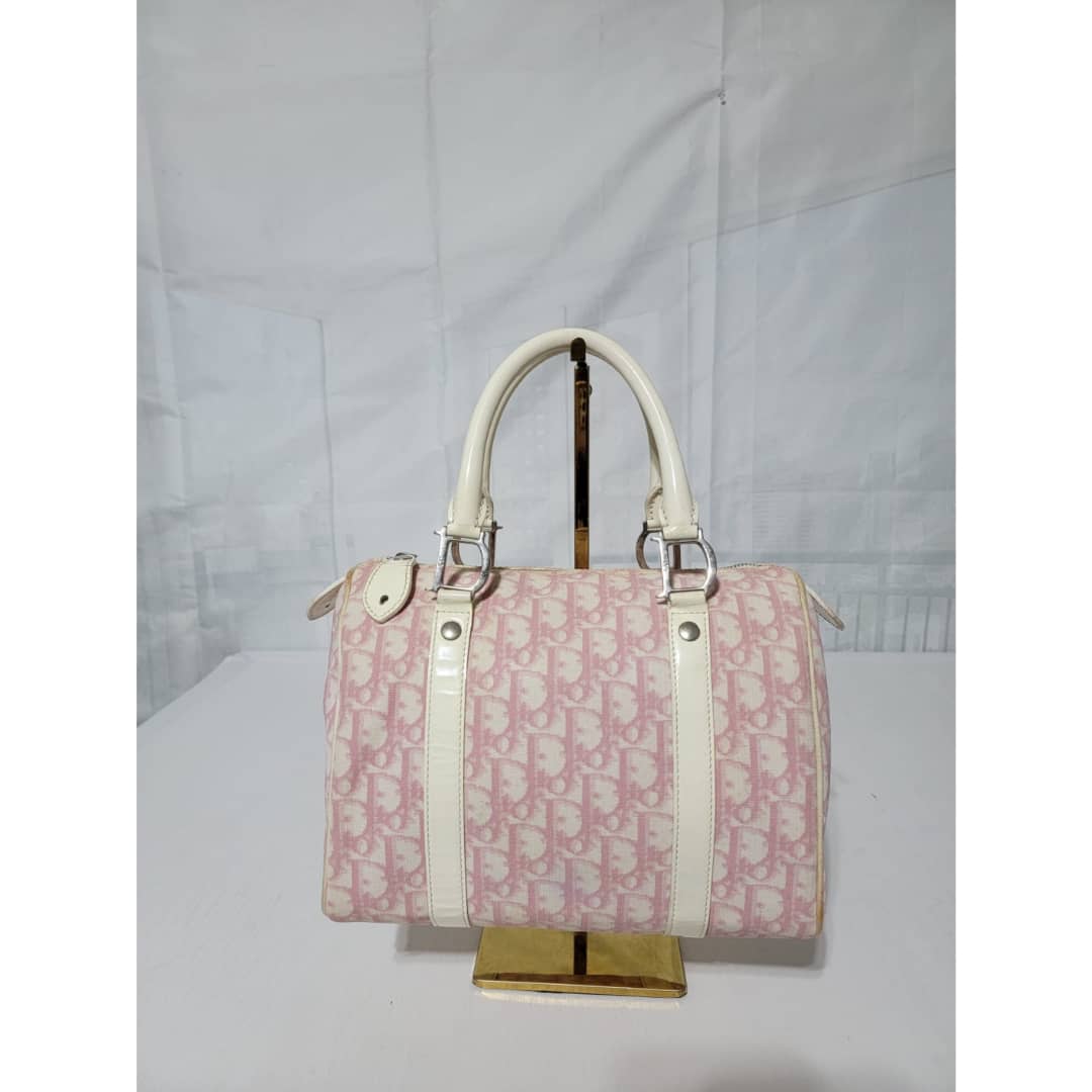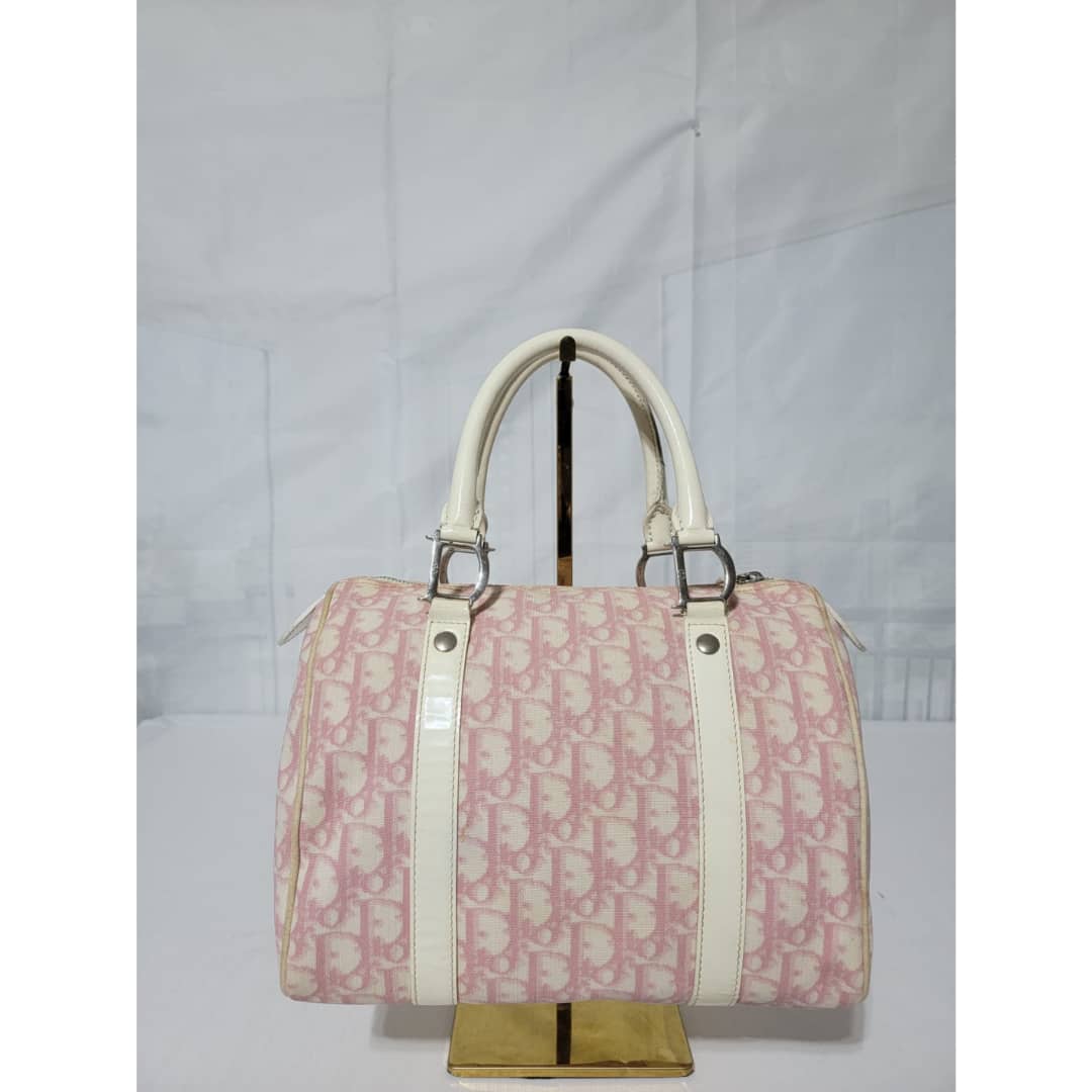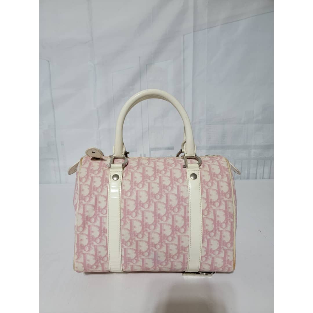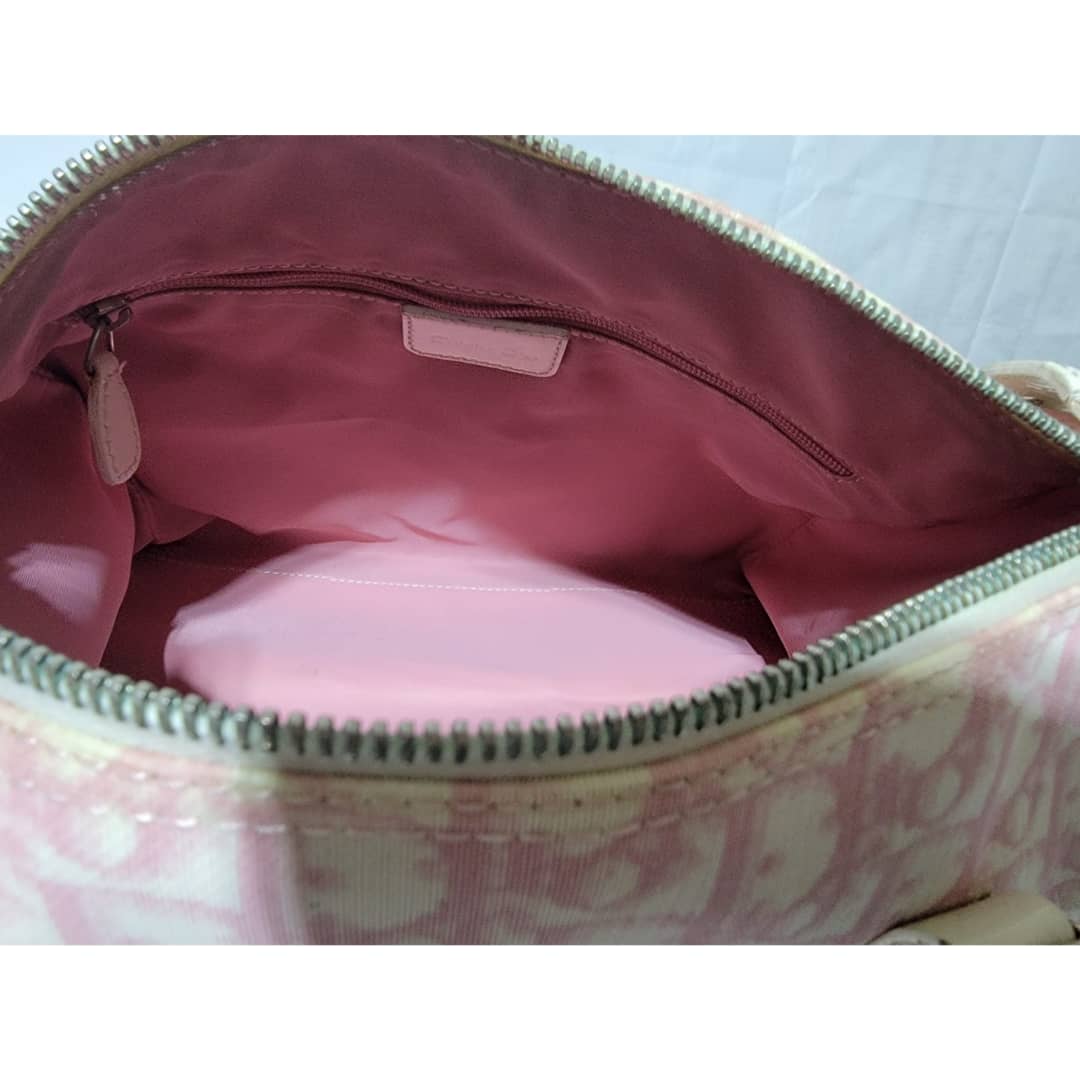This authentic CHRISTIAN DIOR Monogram Boston Bag Pink is in it’s good pre-owned condition. The exterior coated canvas is clean and beautiful. The edges off white trim that runs by the side of the bag shows some little wear to it, it is not so obvious. The handles shows little rubbing. Silver hardware. The zipper pull shows little crack (Kindly look at pictures). Interior is clean.