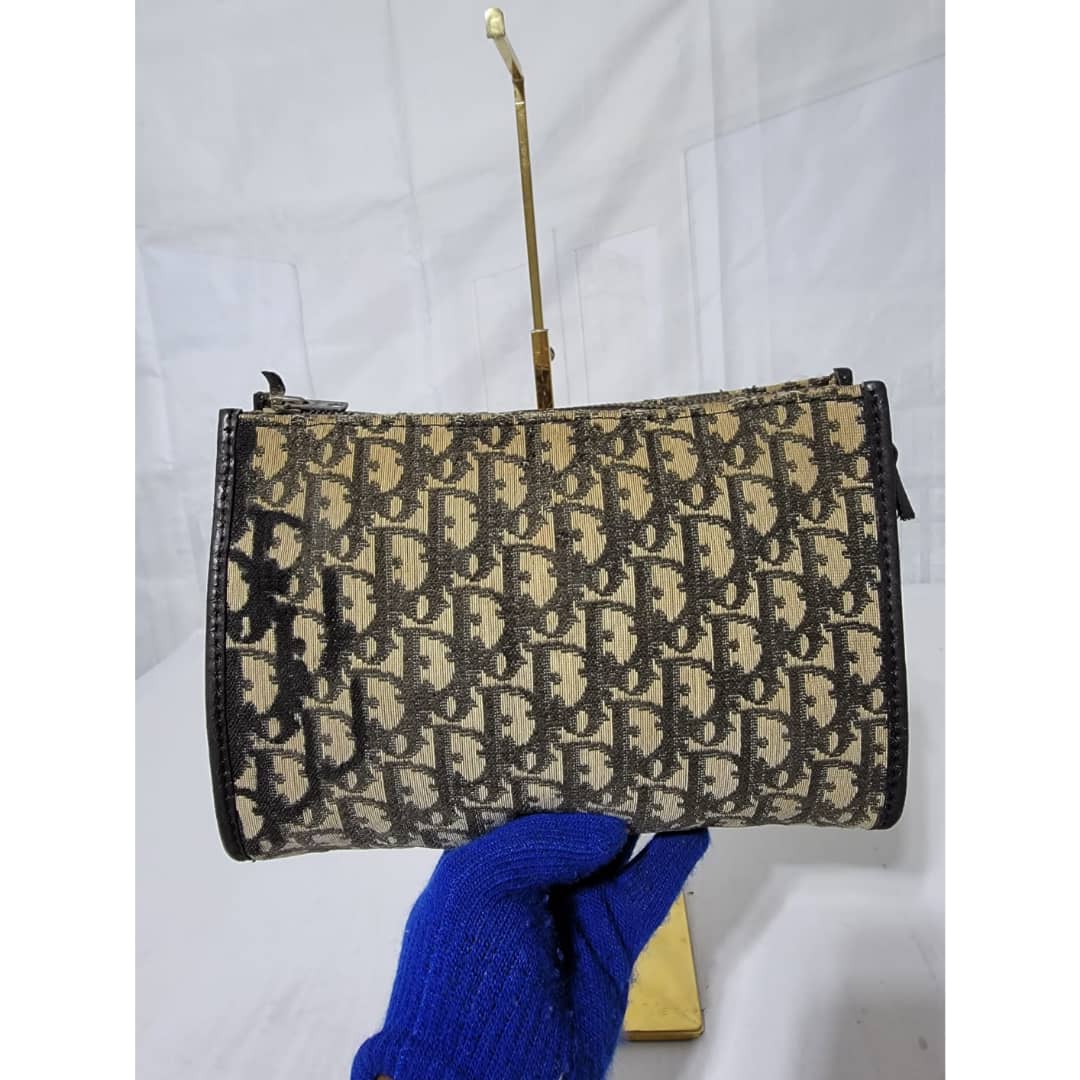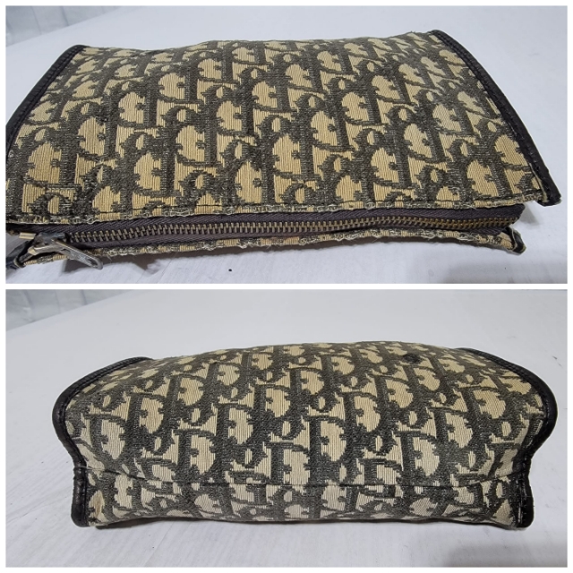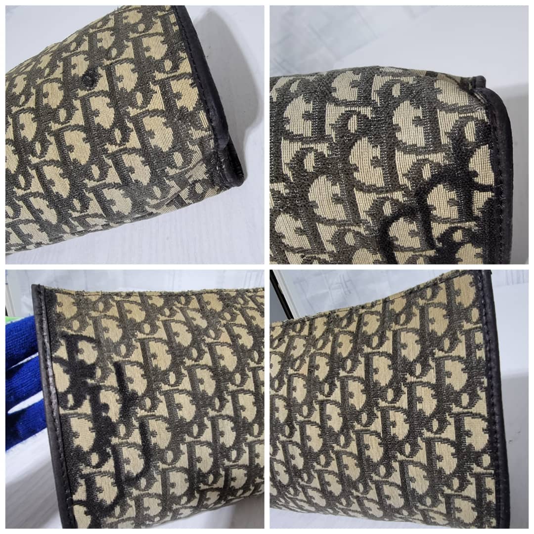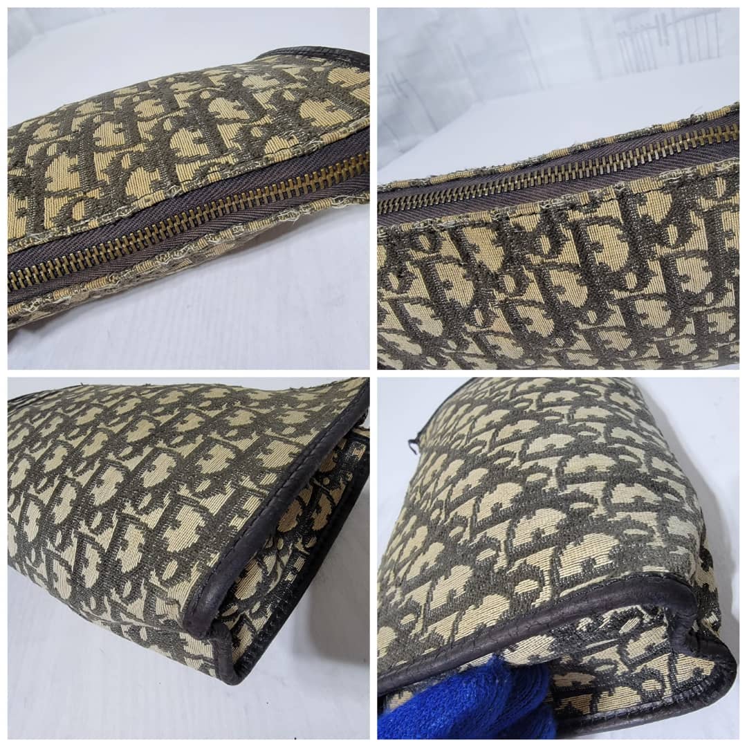 This authentic CHRISTIAN DIOR OBLIQUE POUCH/CLUTCH Black/Off-White is in it’s good pre-owned condition. The exterior canvas is clean. the canvas is Faded. The top trim shows sign of wear and thread pull. Interior is clean, there is a sign of wear in the interior leather. It is an 80’s vintage clutch.