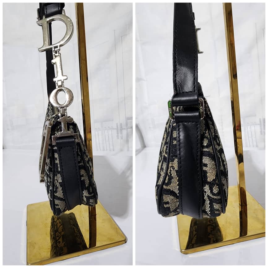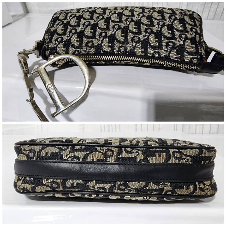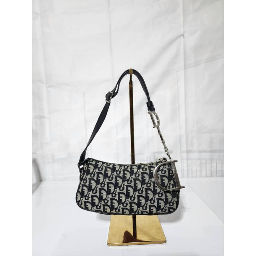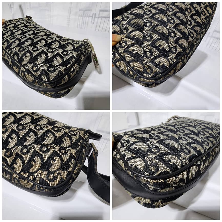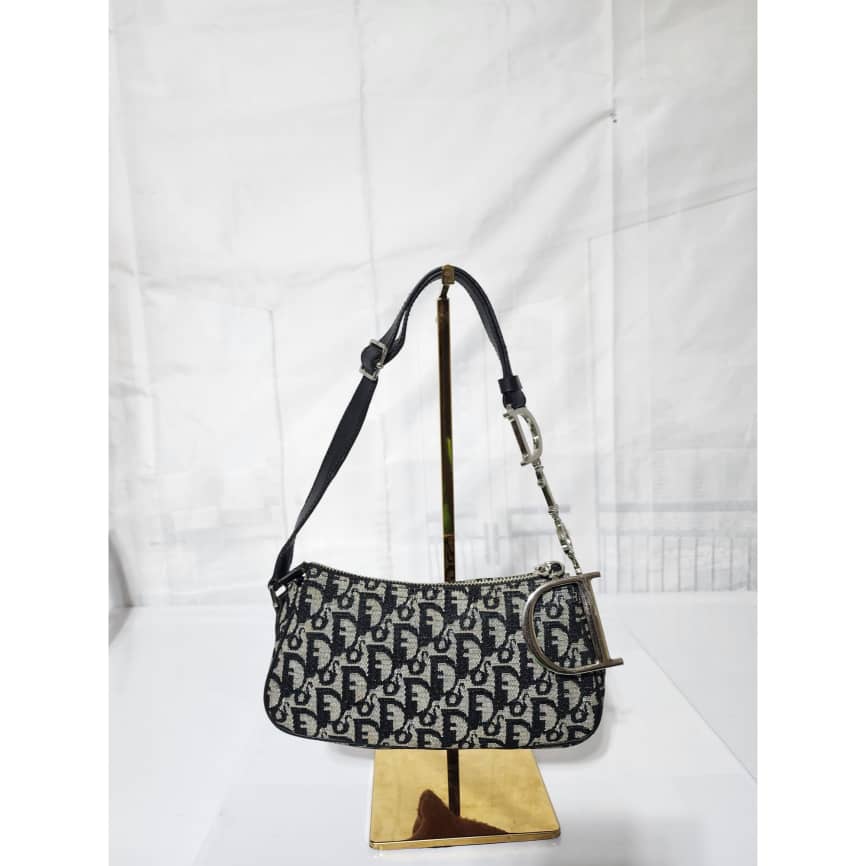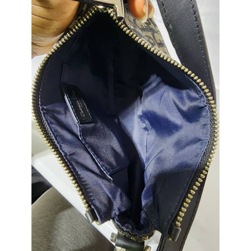 This authentic Christian Dior Trotter Canvas Pouch Blue/Grey is in itβs good pre-owned condition. The exterior is clean. Interior is clean. There is a little bit of stain wear at the base. The strap is adjustable