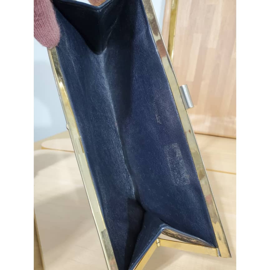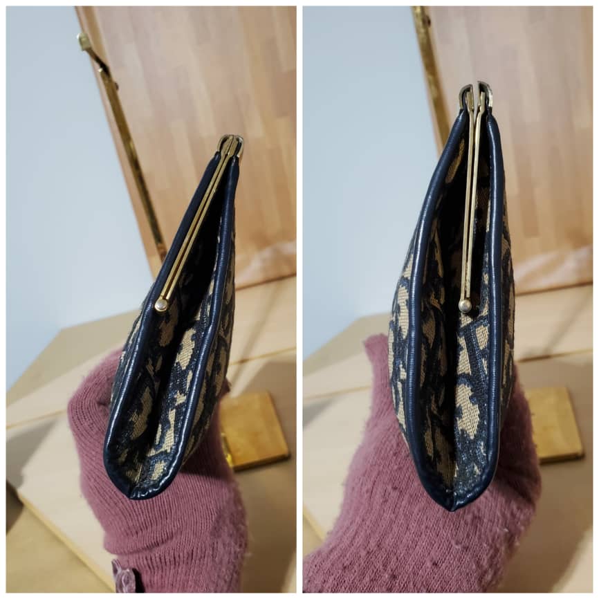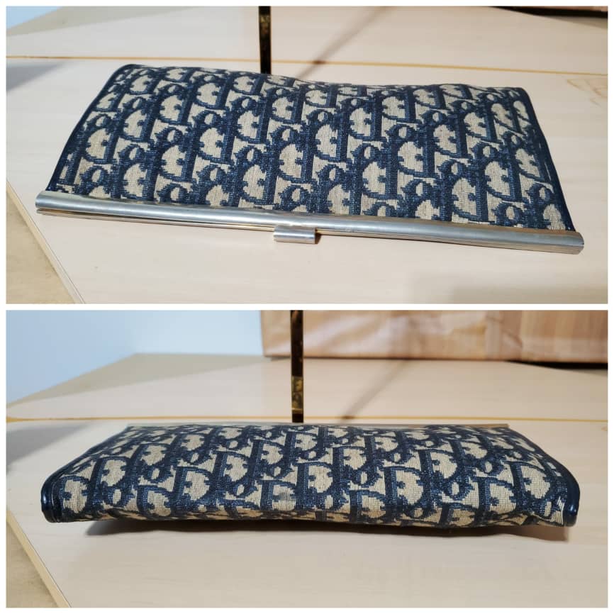 This authentic Christian Dior Vintage Blue Logo Tapestry Canvas Clutch Bag Purse. Is in its pre-owned condition. The exterior canvas is clean and beautiful. Shows scratches on the hardware .interior is clean. Can be worn as Clutch or converted to a Crossbody Bag with chain strap.