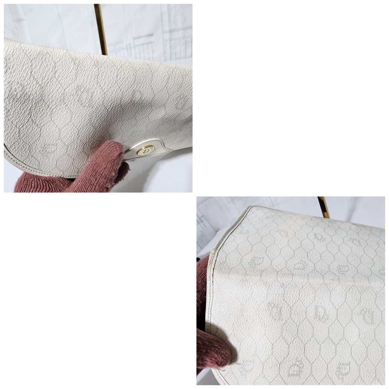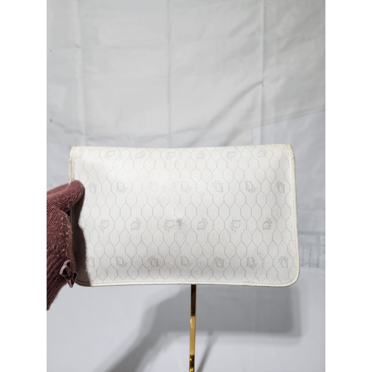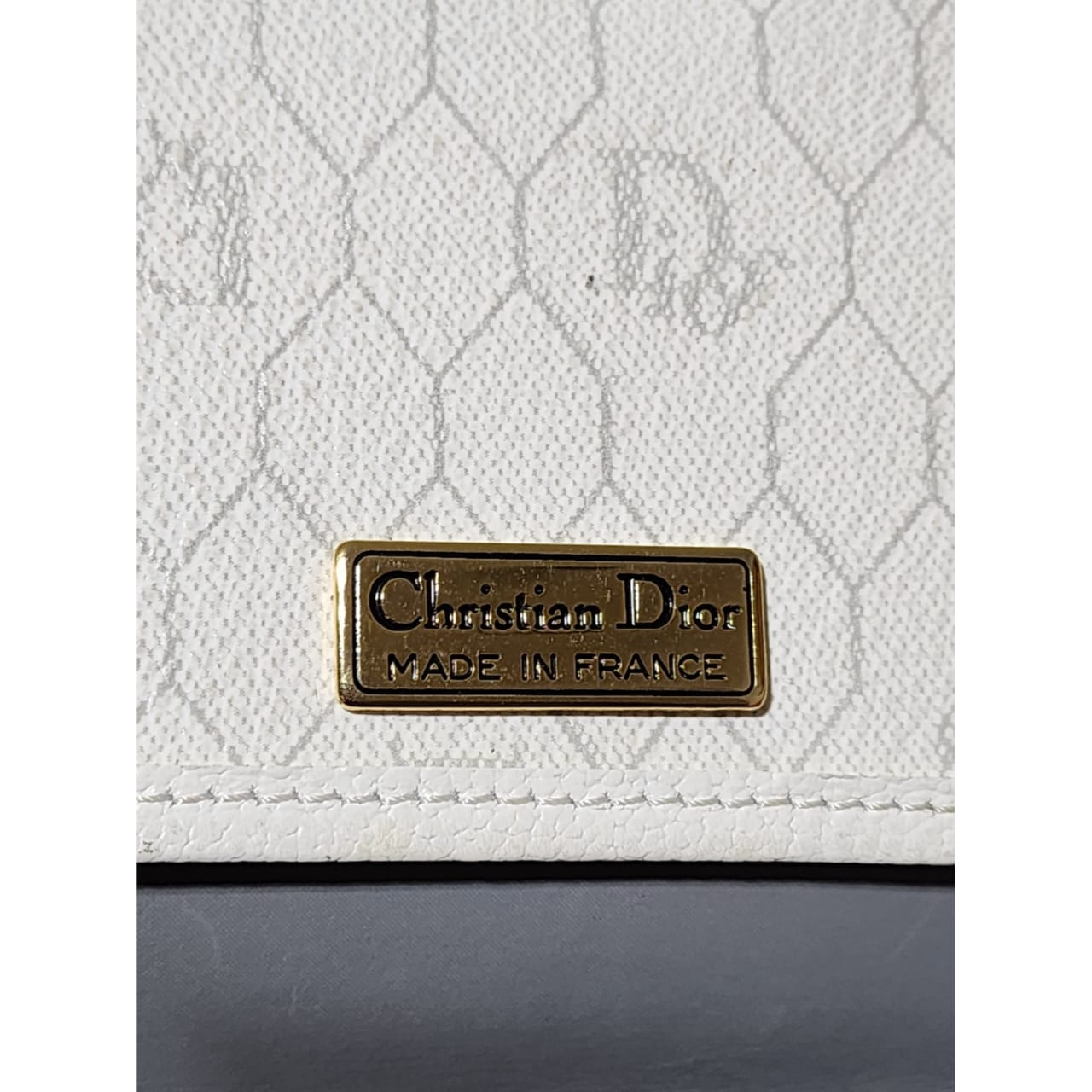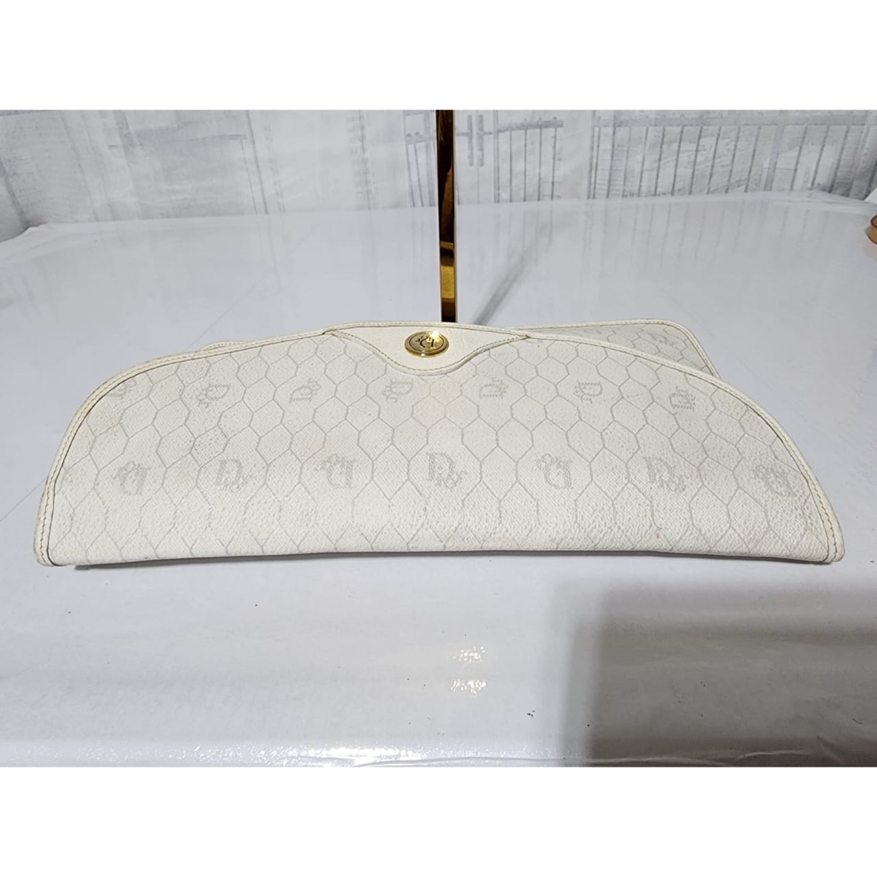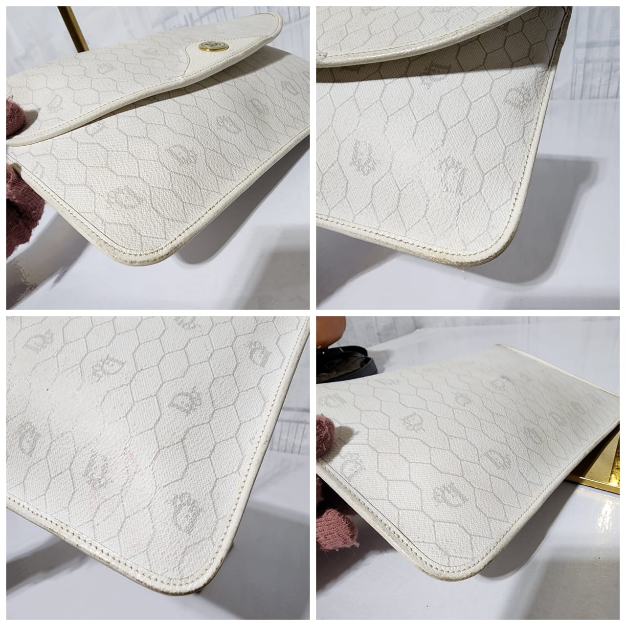 This authentic Christian Dior Vintage Coated Canvas and Leather Trim Honeycomb Clutch White is in it’s pre-owned condition. The exterior is clean however, it shows some sign of wear, scratches around the trim and edges of the clutch, some rubbing and dirt wear to the print of the clutch (Kindly look at pictures for all details).
