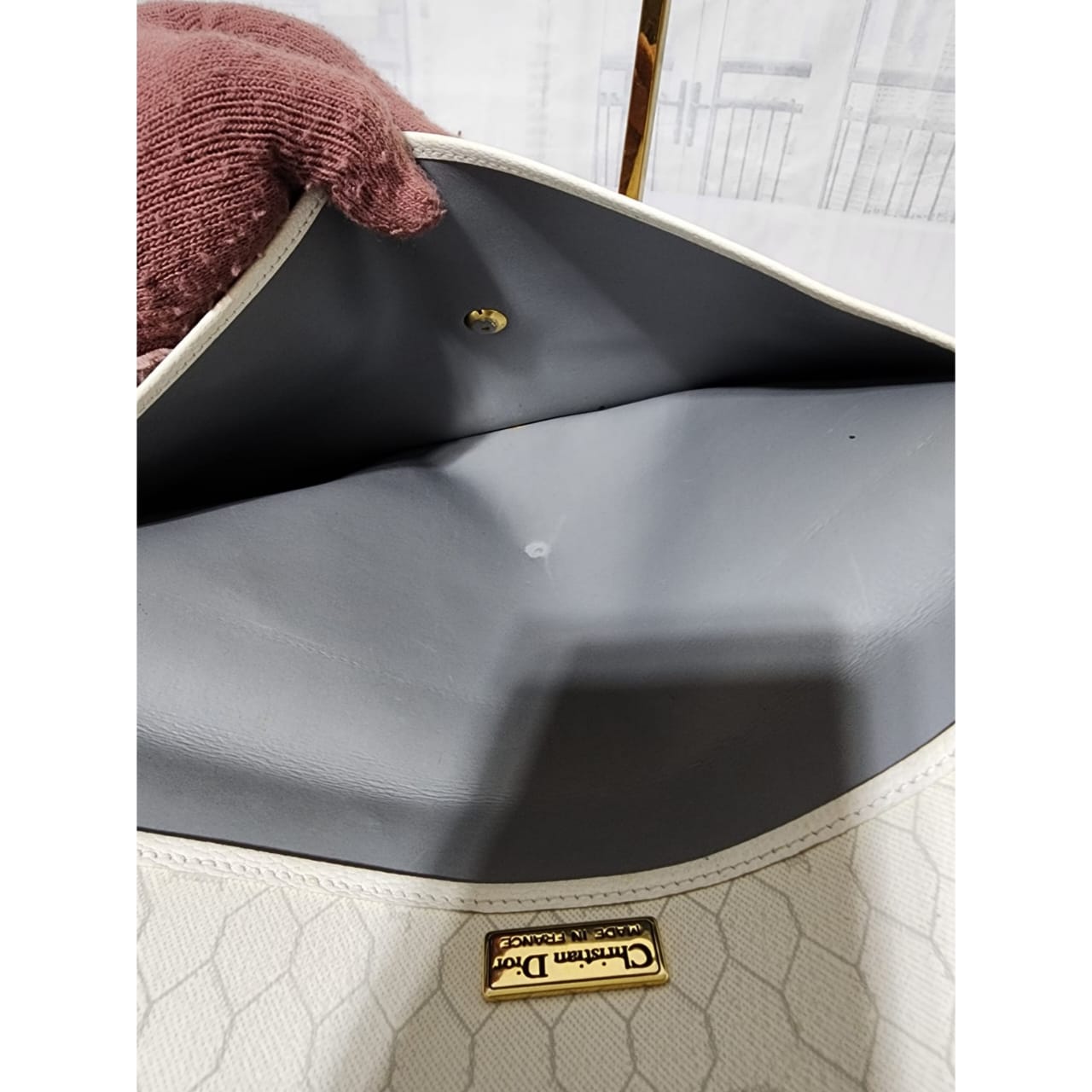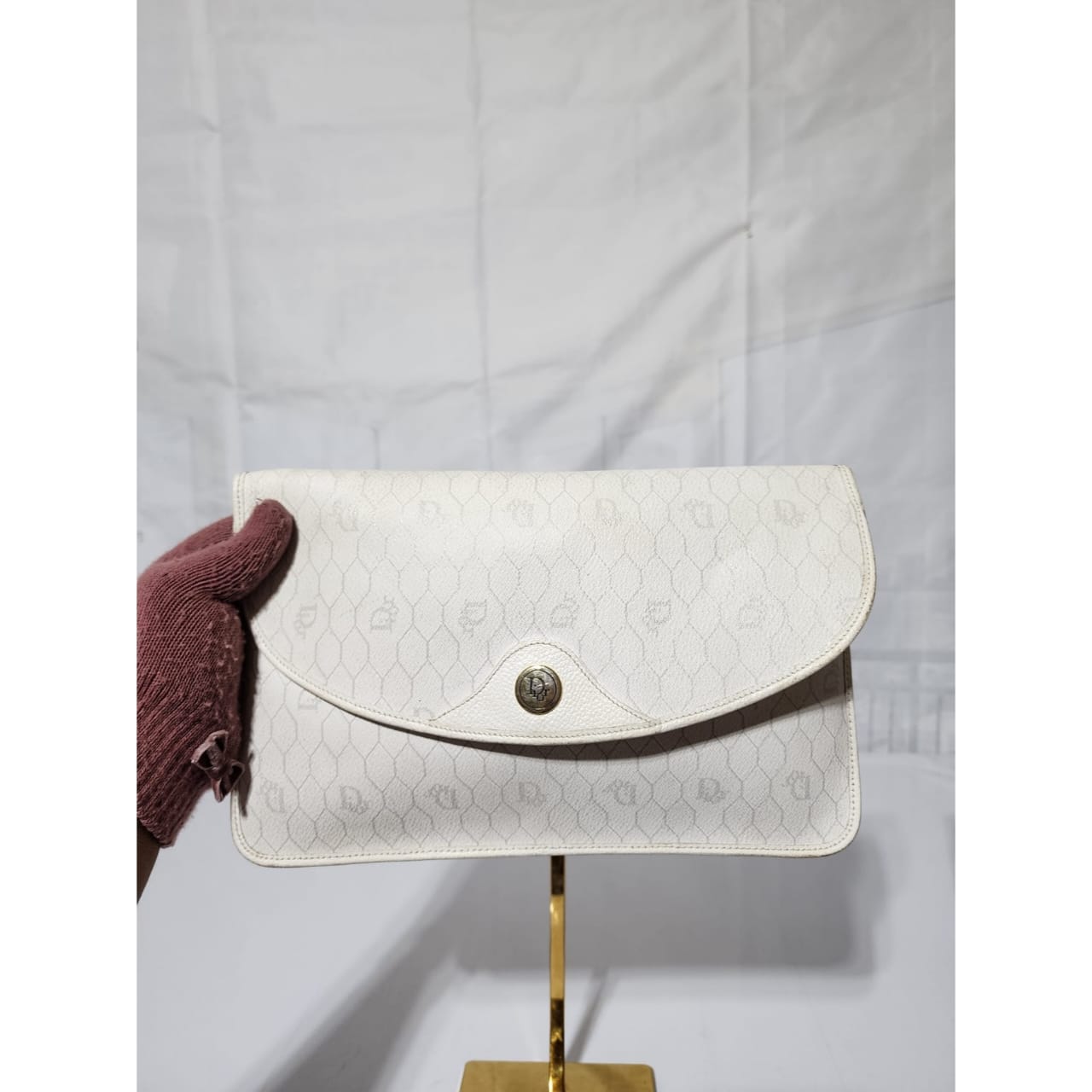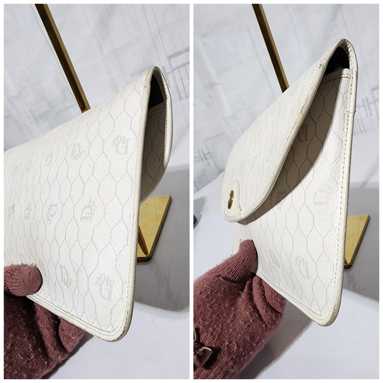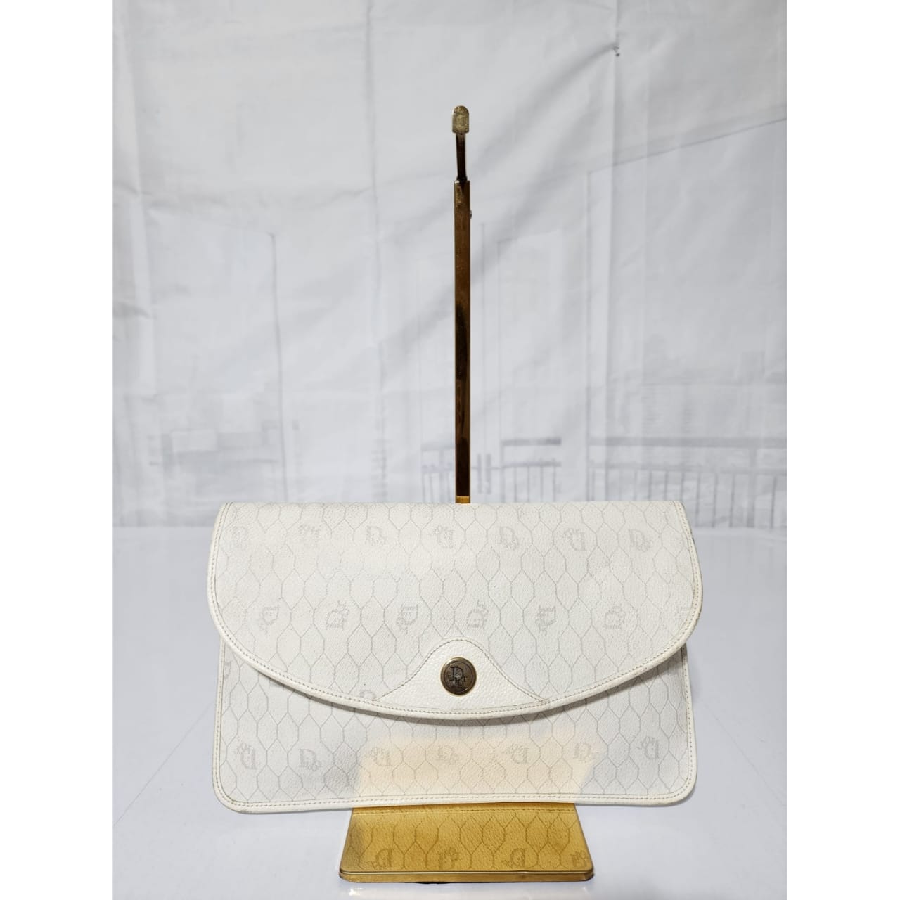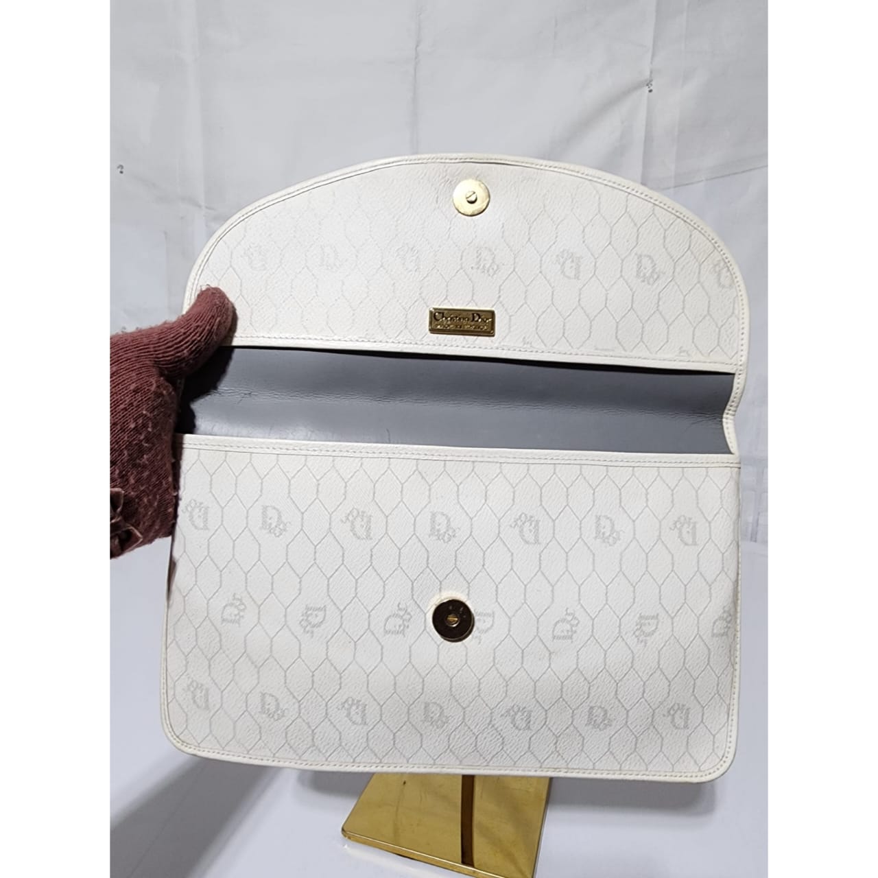 This authentic Christian Dior Vintage Coated Canvas and Leather Trim Honeycomb Clutch White is in it’s pre-owned condition. The exterior is clean however, it shows some sign of wear, scratches around the trim and edges of the clutch, some rubbing and dirt wear to the print of the clutch (Kindly look at pictures for all details).