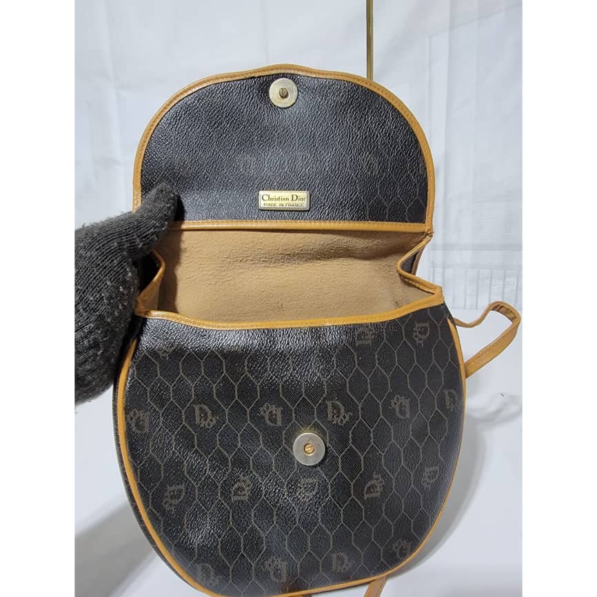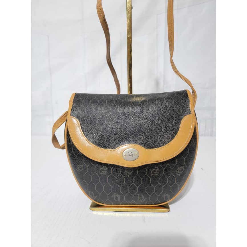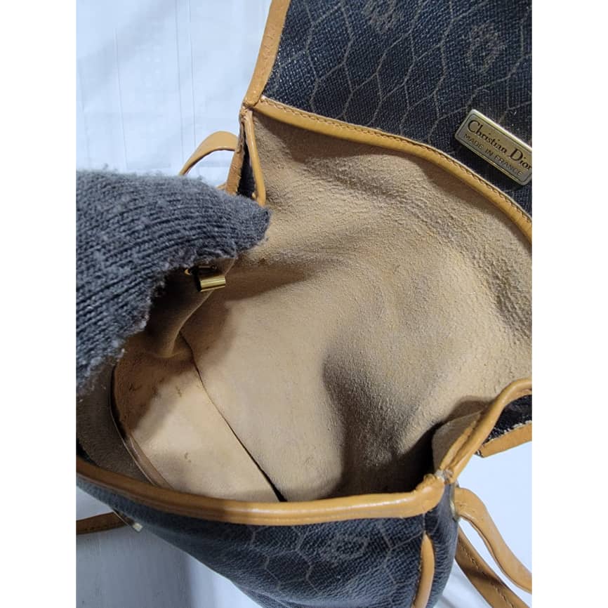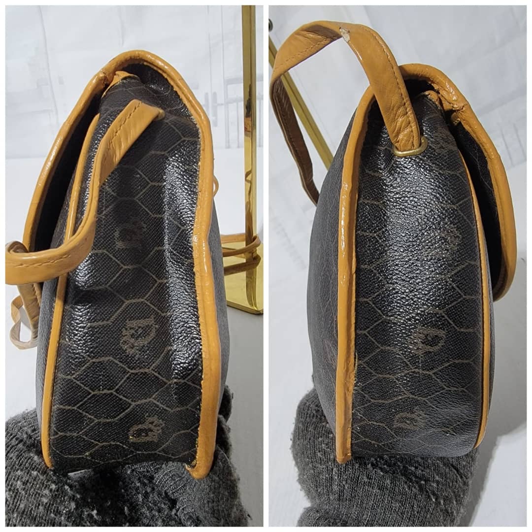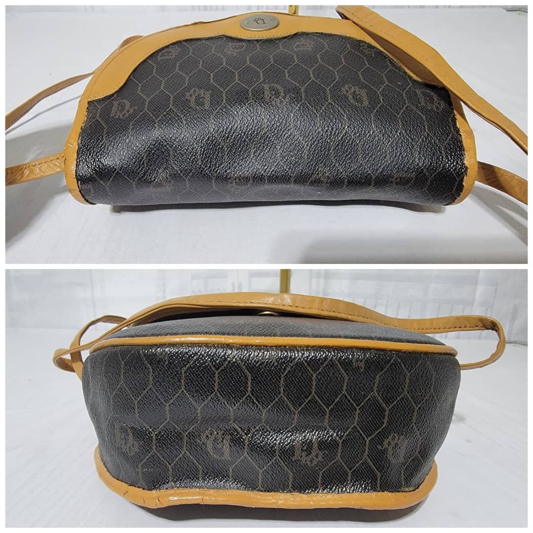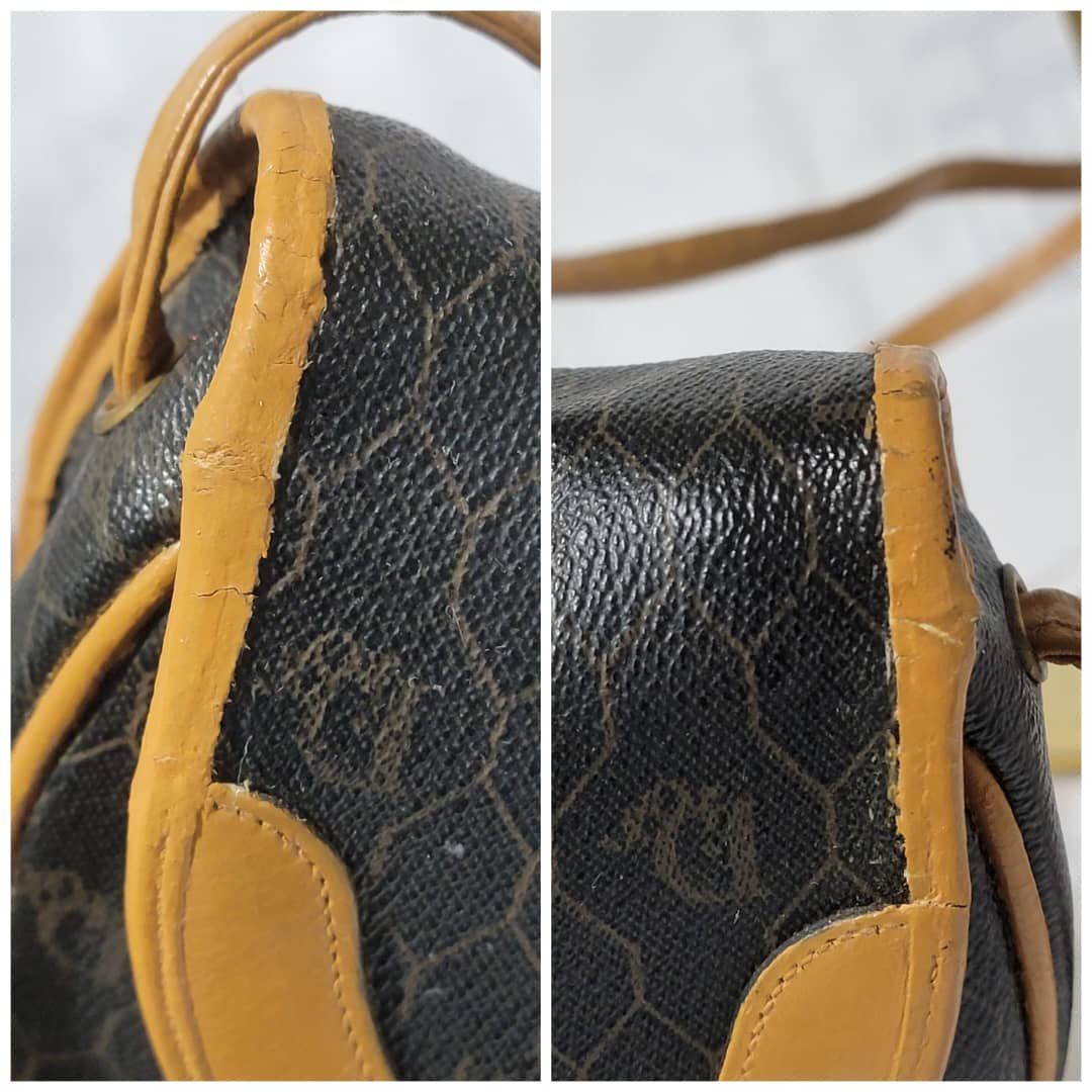 This authentic Christian Dior Vintage Honeycomb Canvas Crossbody Bag PVC Leather Brown/Beige is in it’s pre-owned condition. The exterior coated canvas is clean. The beige brown trim leather that runs across the bag and handle shows some sign of wear. Kindly note that the beige leather trim that runs across the bag has been repainted. Interior is clean, in it’s vintage condition. Gold hardware shows scratches.