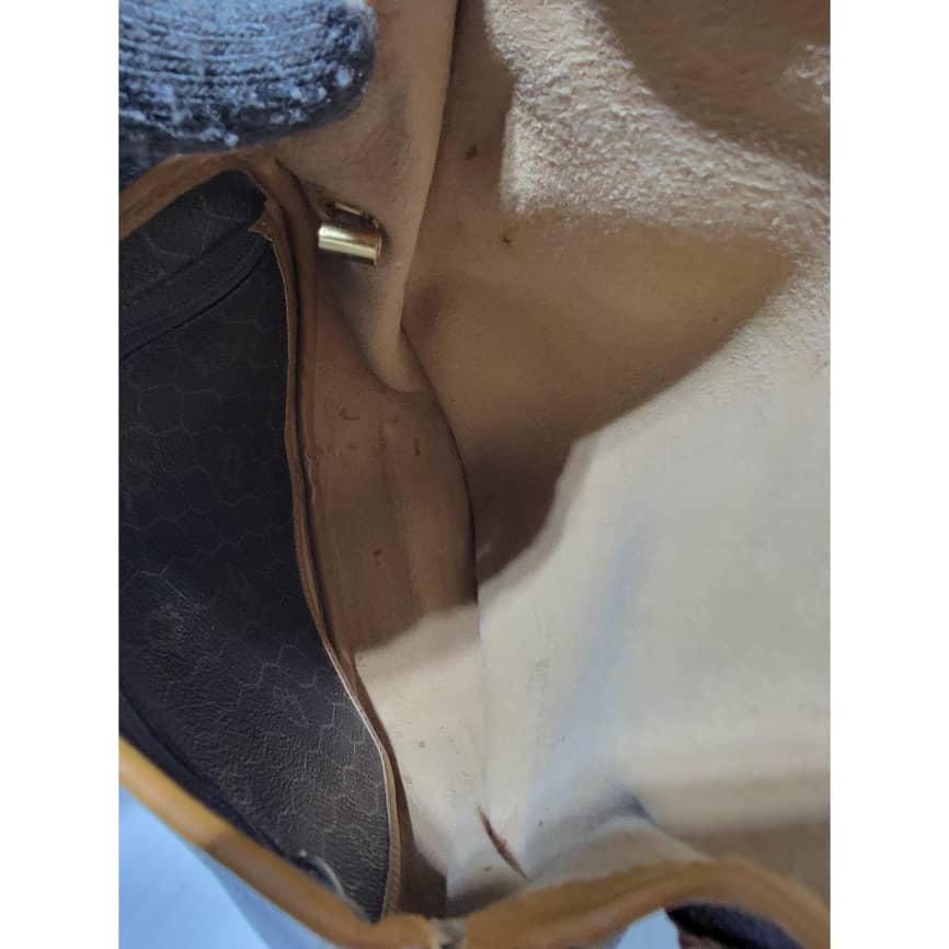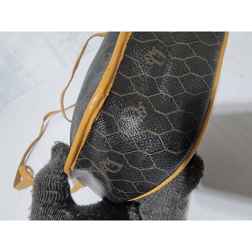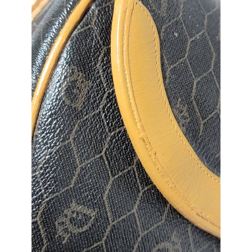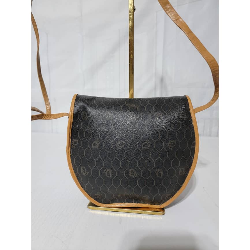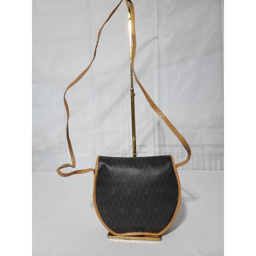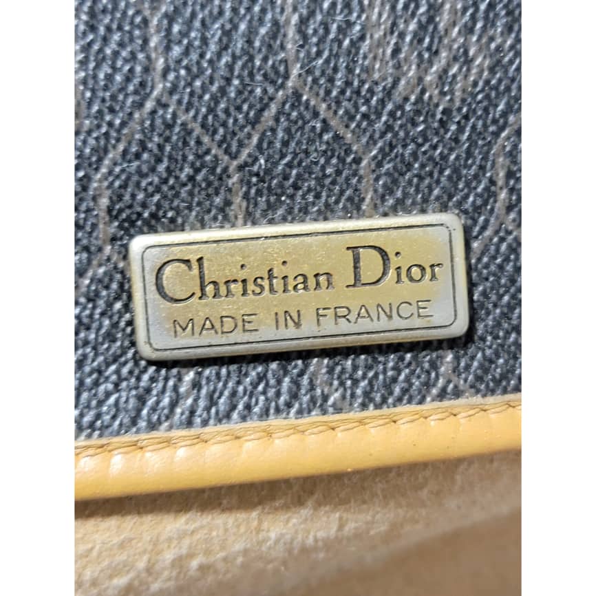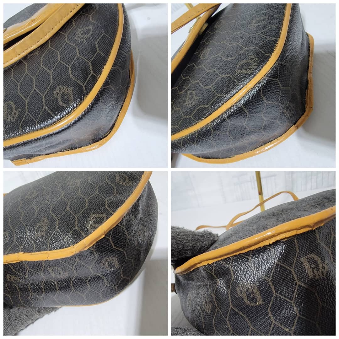 This authentic Christian Dior Vintage Honeycomb Canvas Crossbody Bag PVC Leather Brown/Beige is in it’s pre-owned condition. The exterior coated canvas is clean. The beige brown trim leather that runs across the bag and handle shows some sign of wear. Kindly note that the beige leather trim that runs across the bag has been repainted. Interior is clean, in it’s vintage condition. Gold hardware shows scratches.