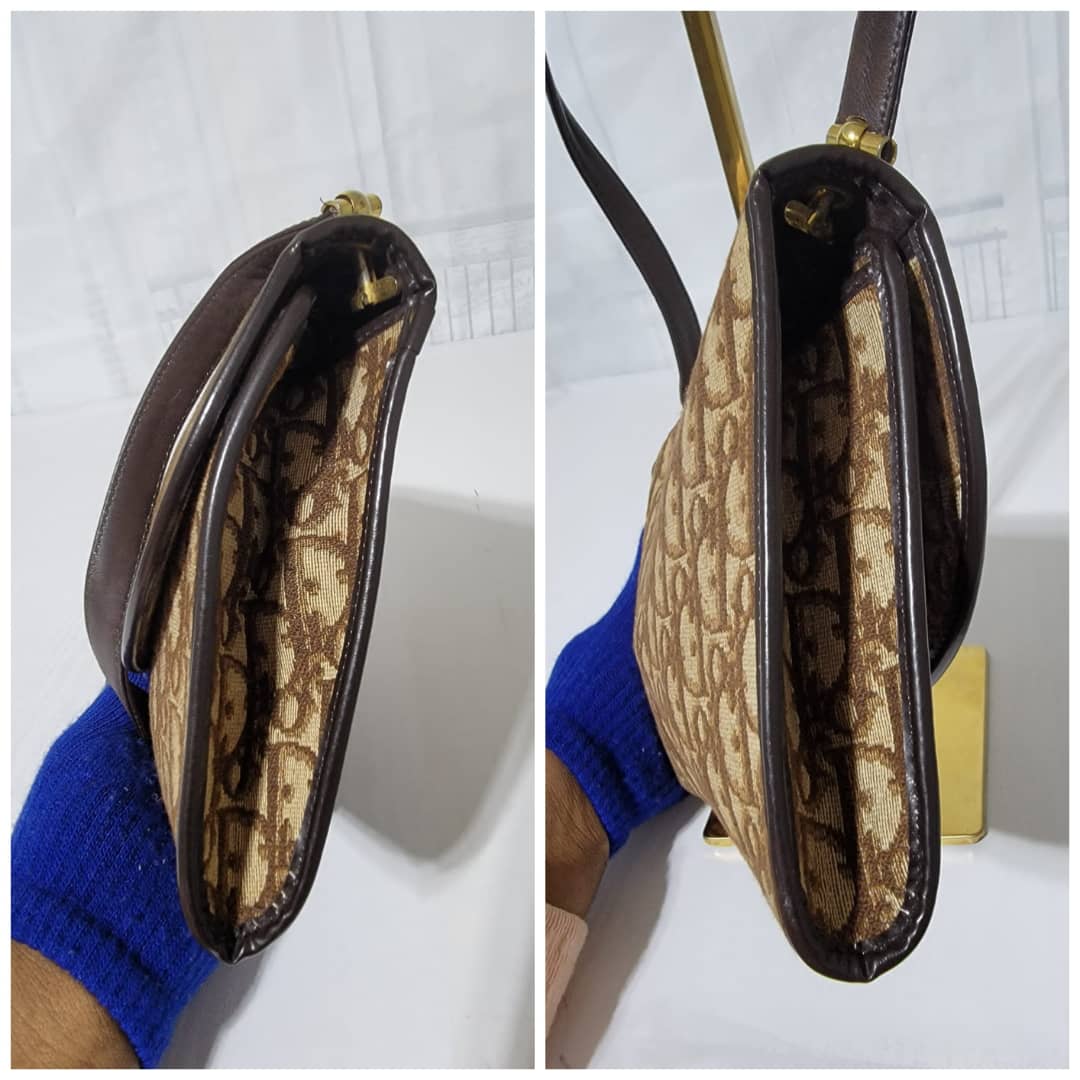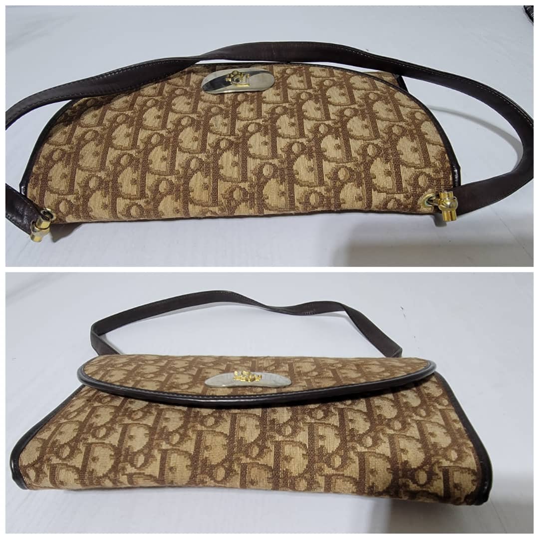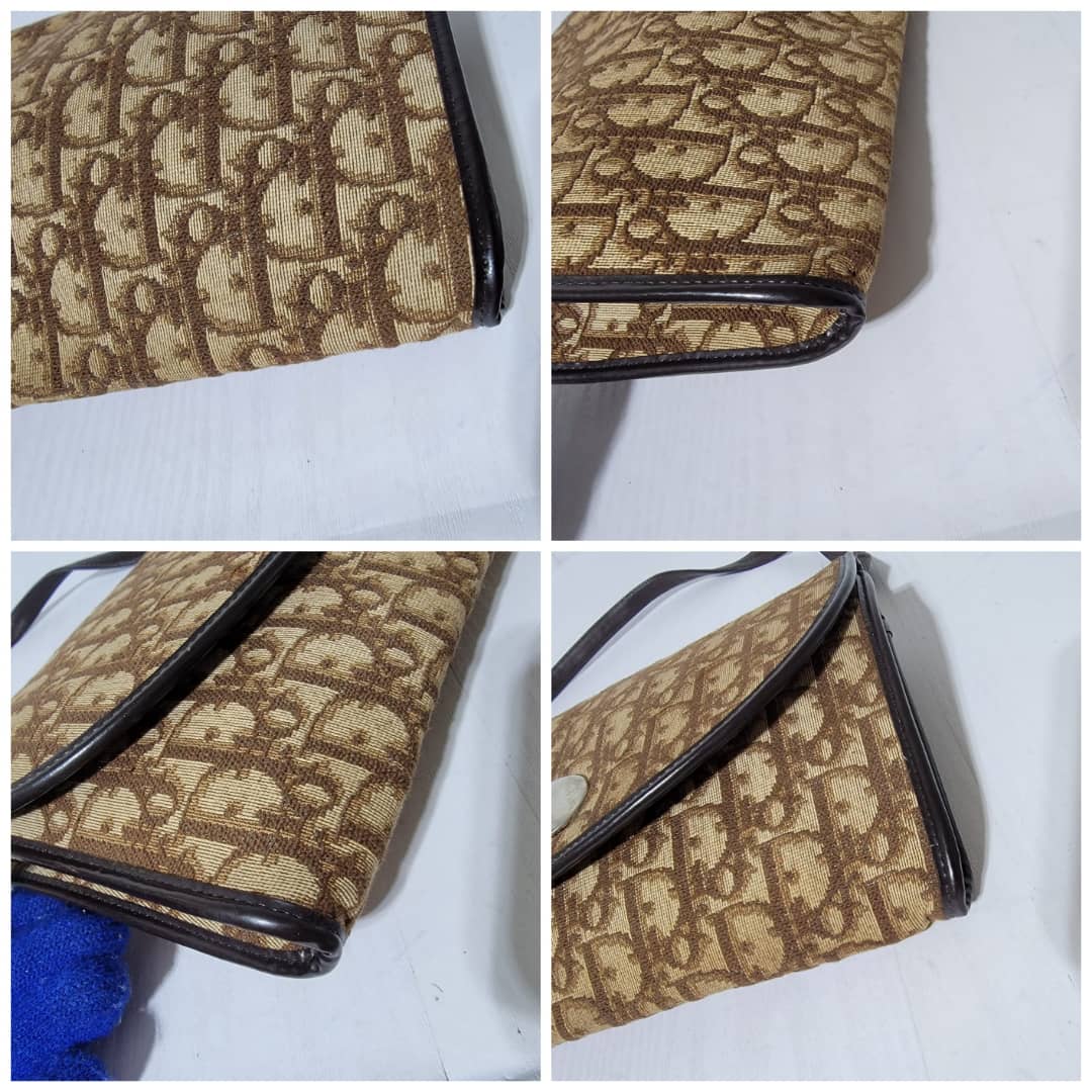 This authentic CHRISTIAN DIOR VINTAGE TROTTER SHOULDER BAG BEIGE/BROWN is in it’s good pre-owned condition. The exterior canvas is clean and beautiful. Hardware shows scratches. Interior is clean, it shows some vintage sign of use wear. It can be worn as a shoulder bag or clutch.