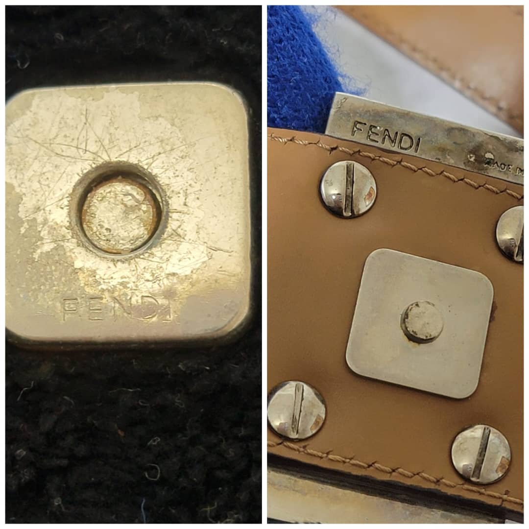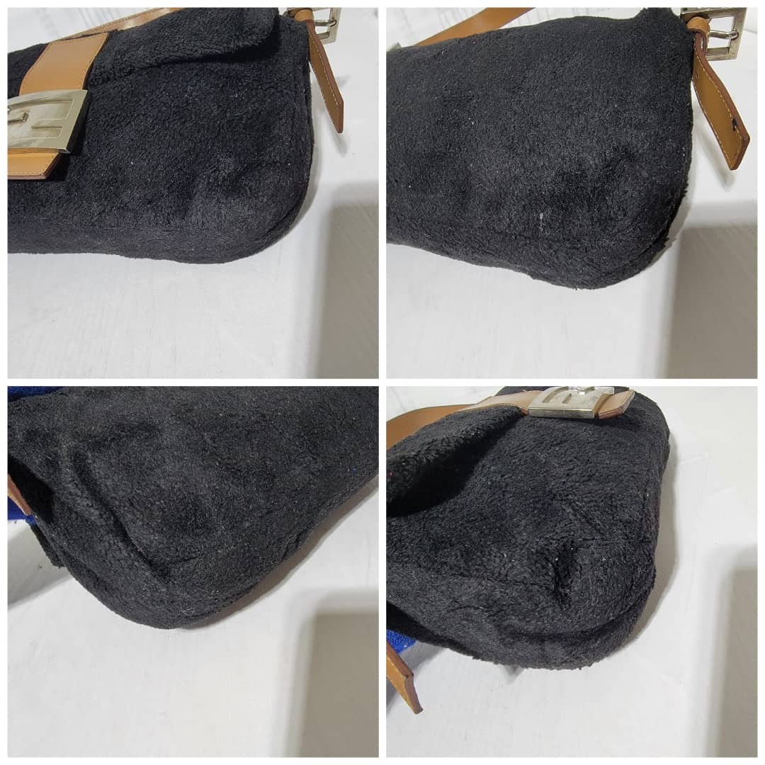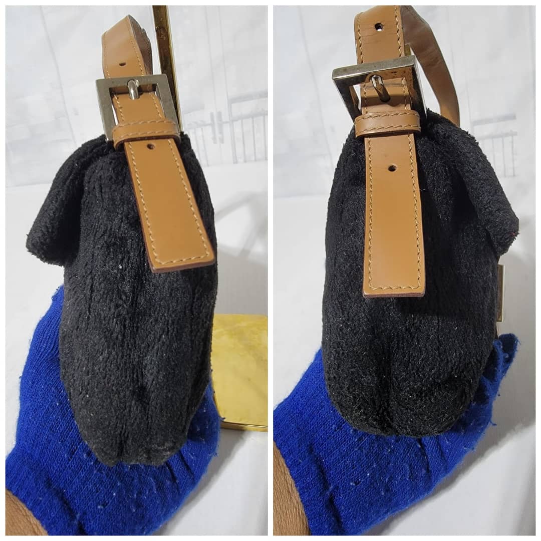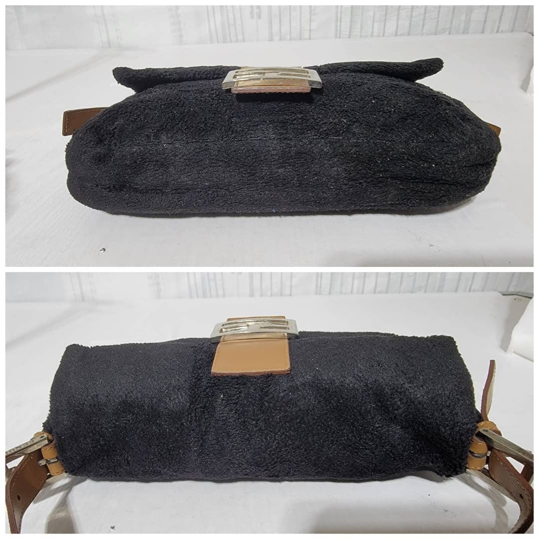 This authentic Iconic Fendi Black Suede Baguette Bag With silver Tone Zucchino Logo Closure is in it’s pre-owned good condition the same is clean and beautiful. Has a beautiful red satin Interior. The Shoulder strap has an adjustable belt hole .
