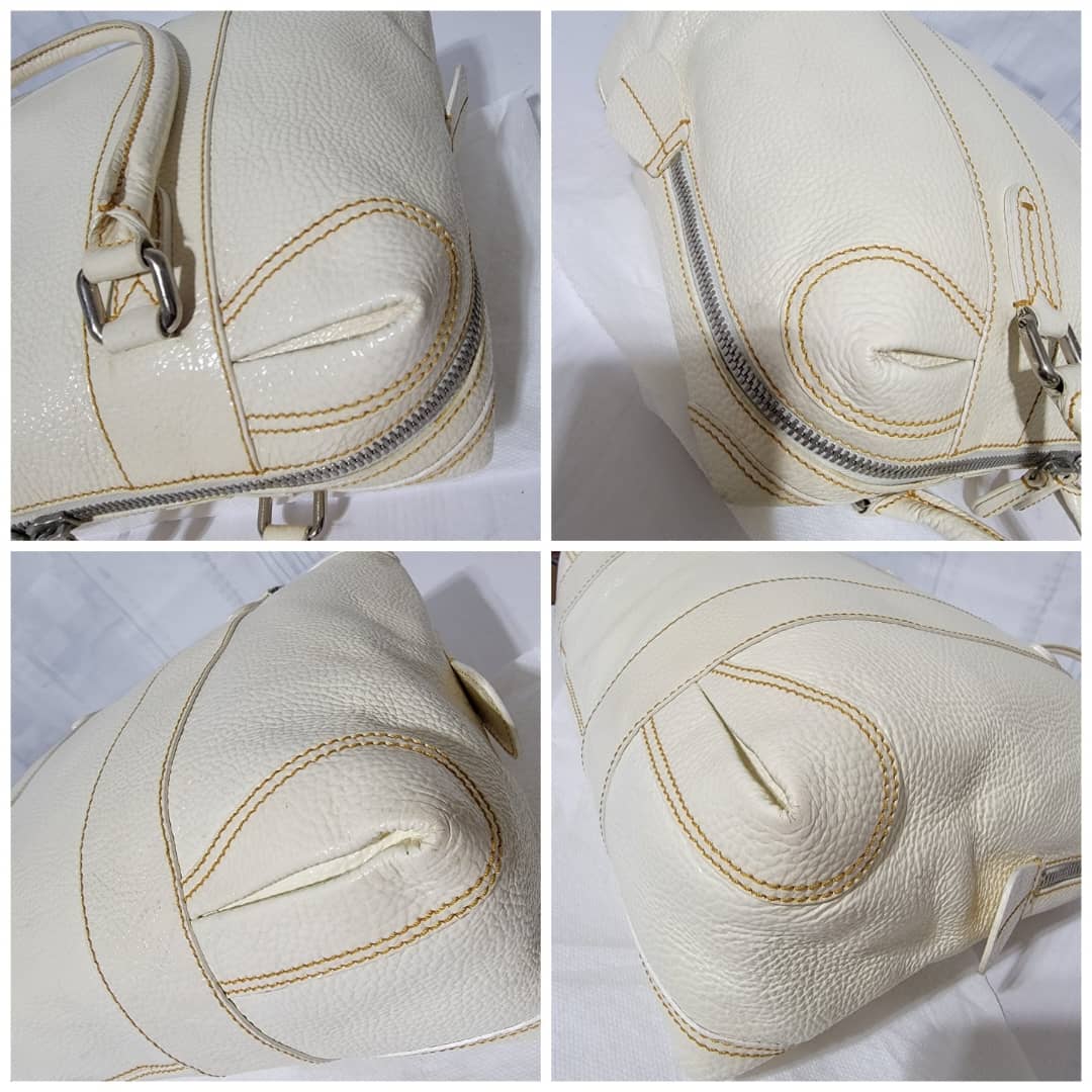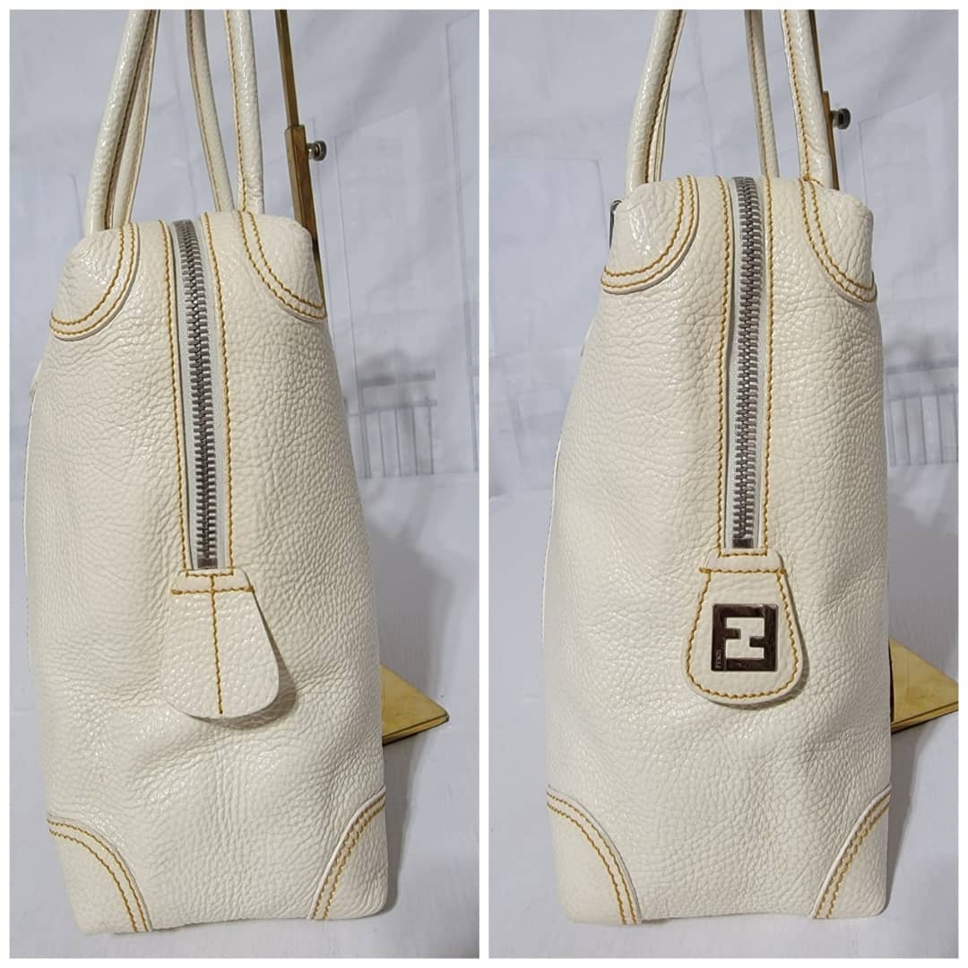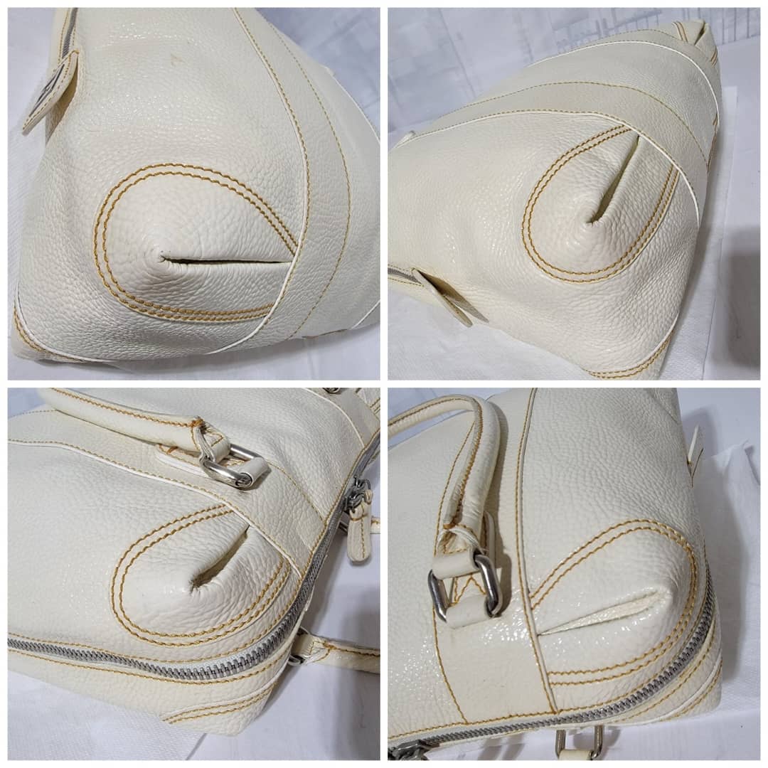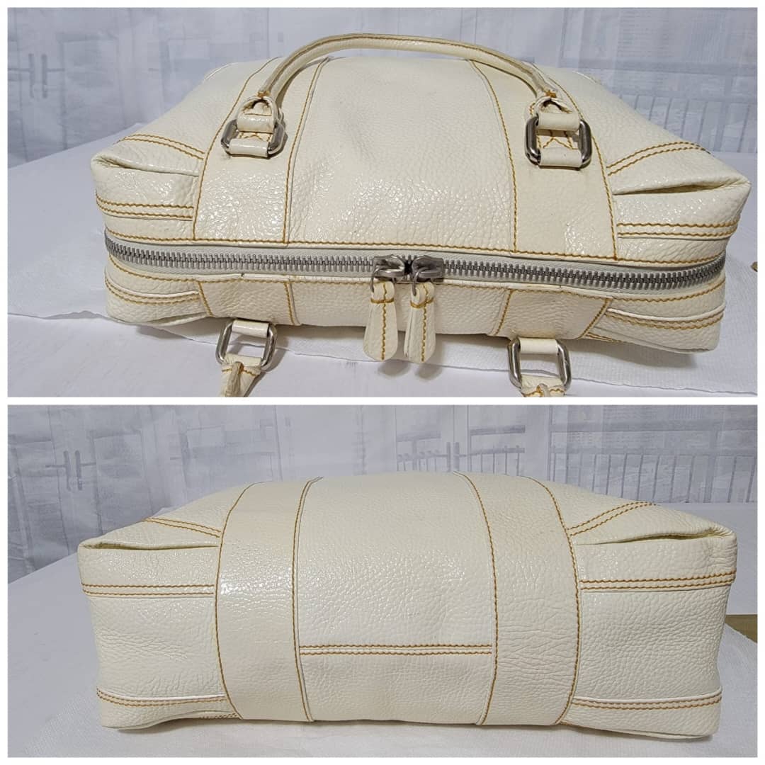 This authentic FENDI Boston Patent Leather Bag Off- White is in itβs good pre-owned condition. The exterior patent leather is clean and beautiful. Interior is clean. Silver hardware.