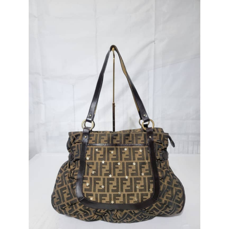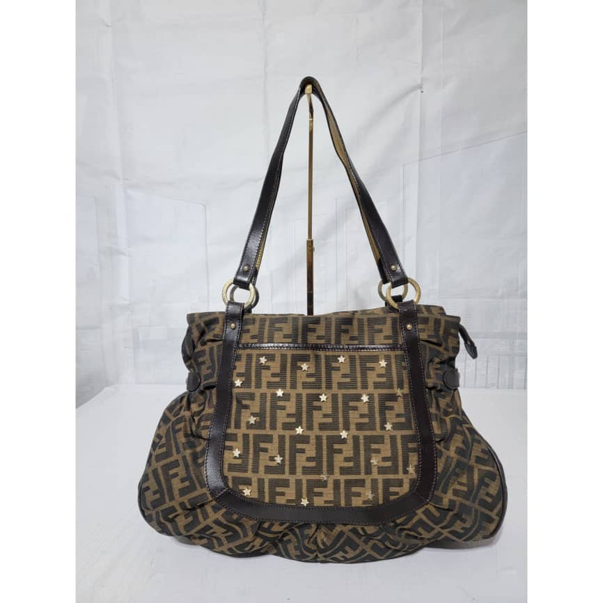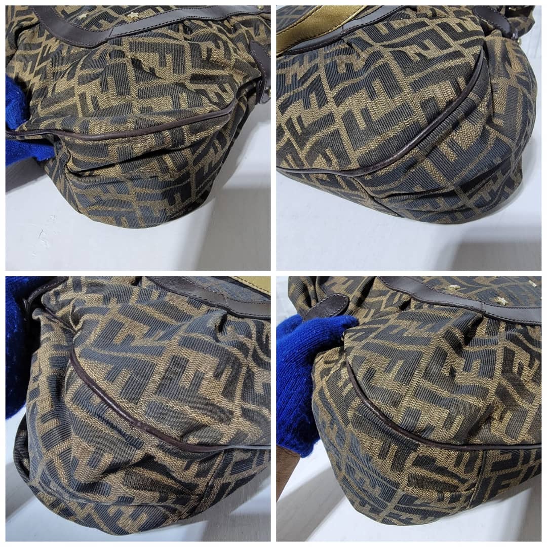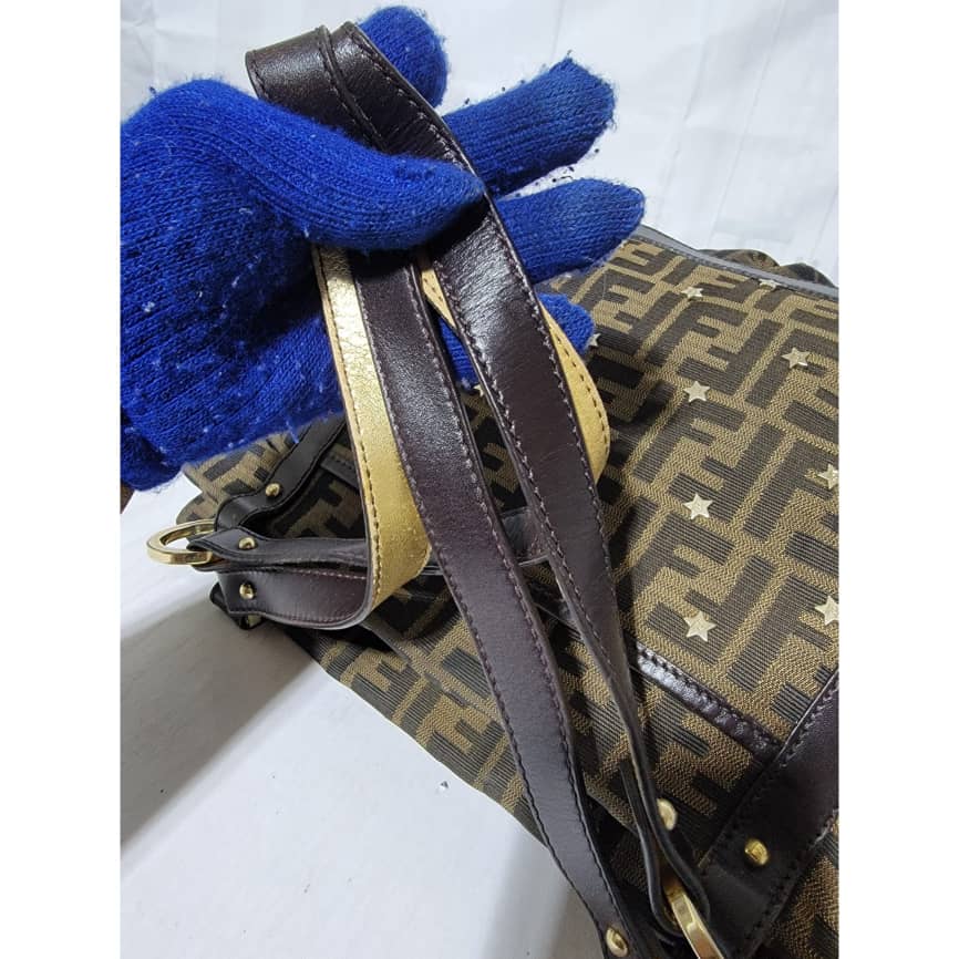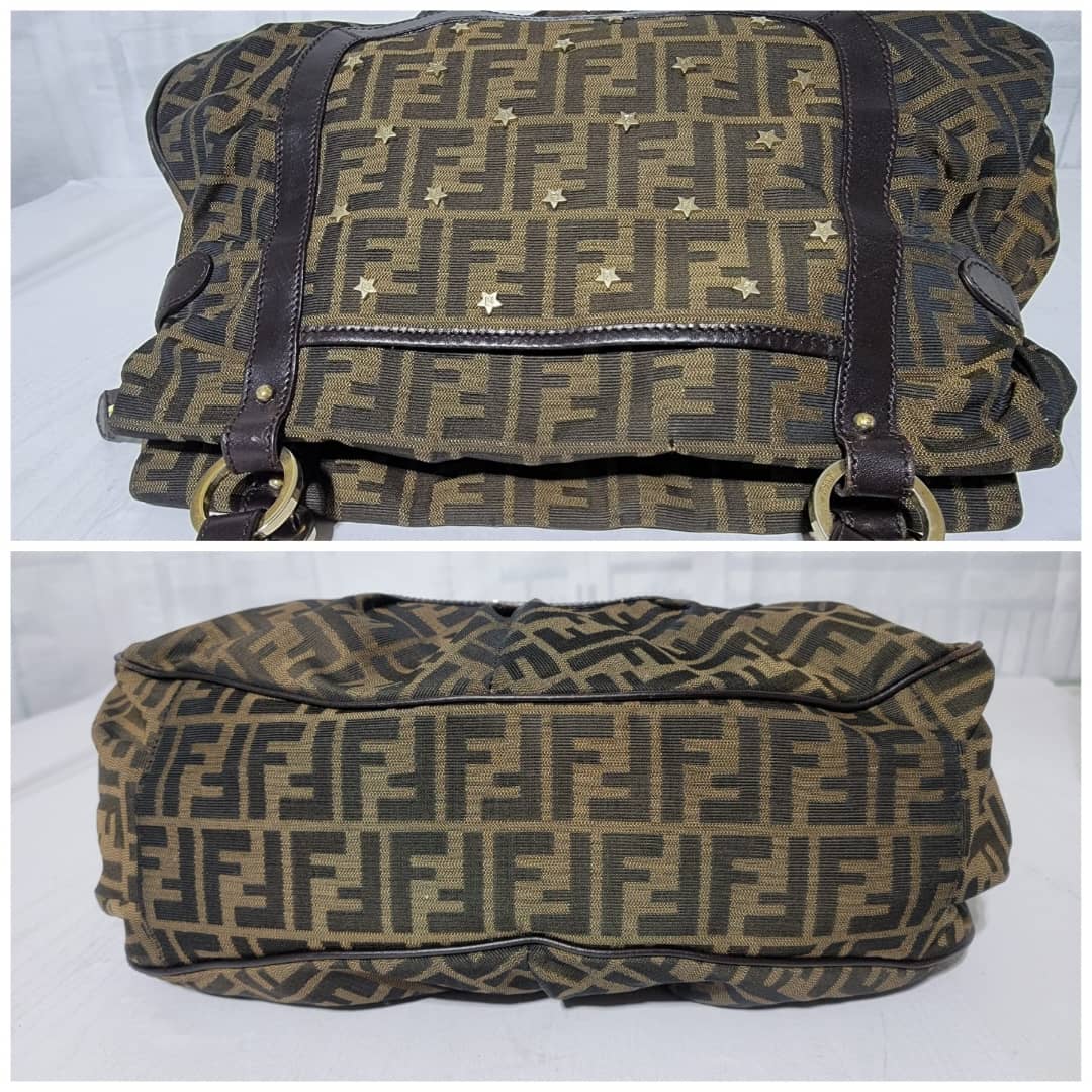 This authentic Fendi Chef Tote Studded Zucca Canvas Large bag is in it’s good pre-owned condition the exterior is clean and interior is clean. The Studs has an FF logo on them. There’s no Fendi charm on this bag.