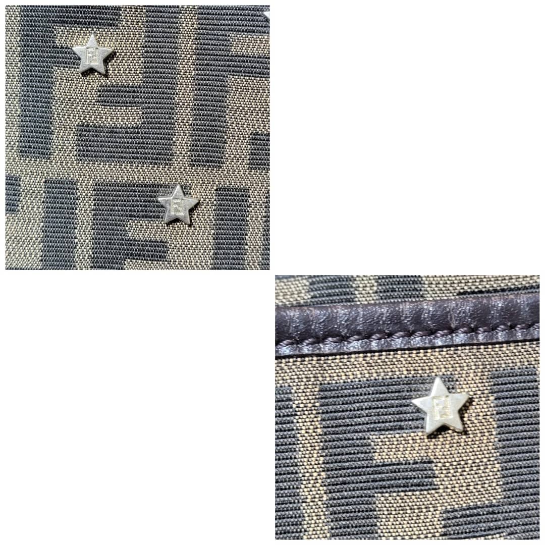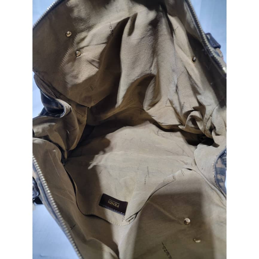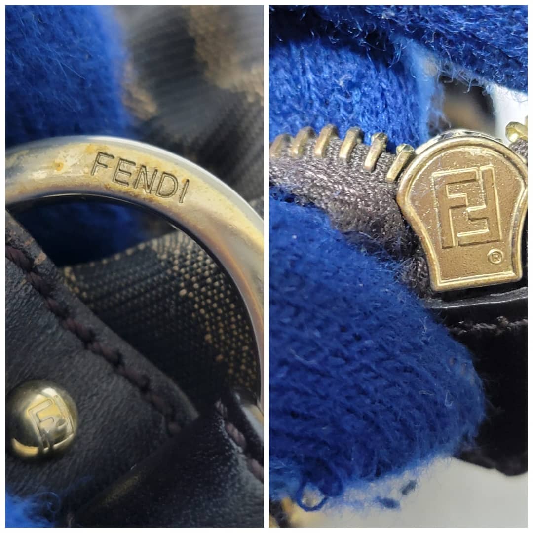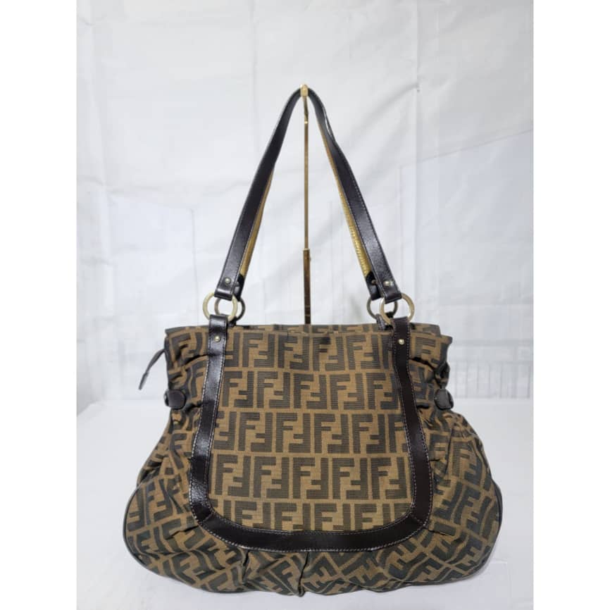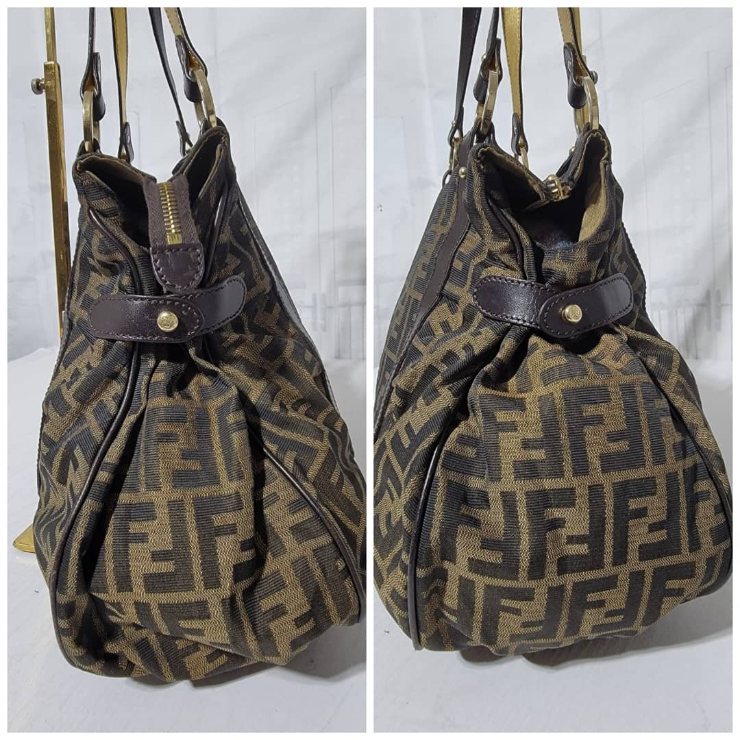 This authentic Fendi Chef Tote Studded Zucca Canvas Large bag is in it’s good pre-owned condition the exterior is clean and interior is clean. The Studs has an FF logo on them. There’s no Fendi charm on this bag.
