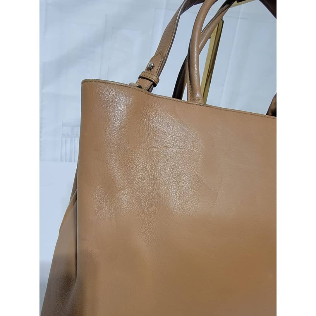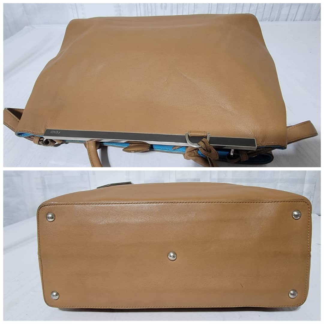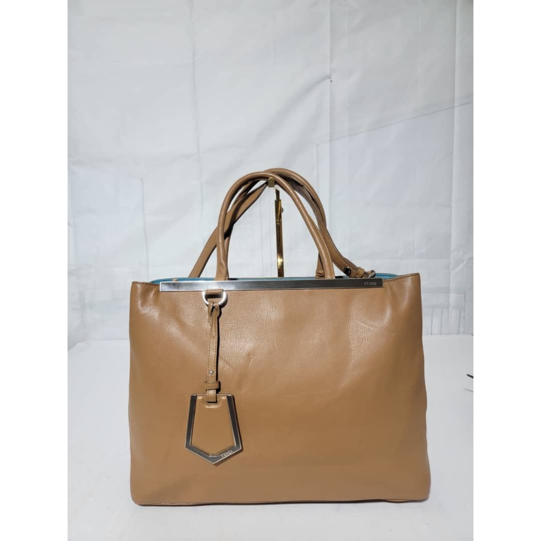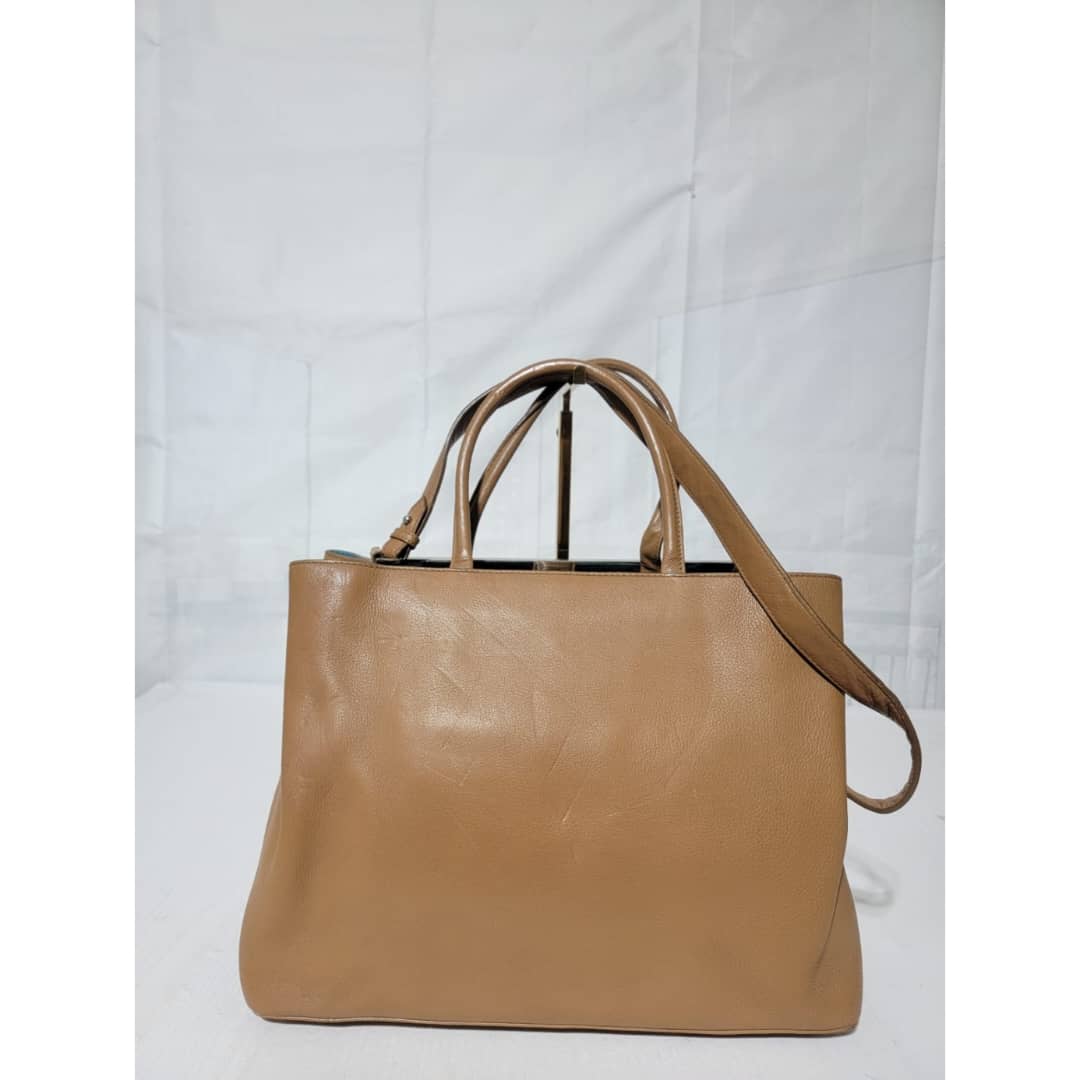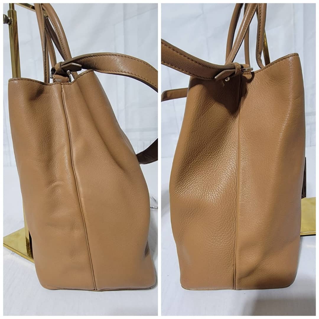 This authentic Fendi Leather Medium 2jours Tote Bag Tan is in it’s pre-owned condition. The exterior is clean however, it shows sign of marks like pressed dent on it. The interior shows pen marks and makeup stains in it (Kindly look at pictures above). The handles shows sign of wear, loss of structure. Silver hardware.
