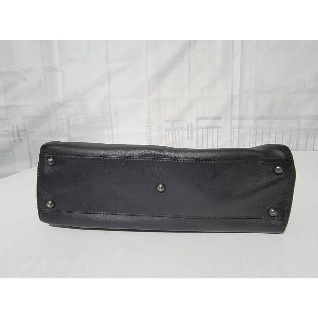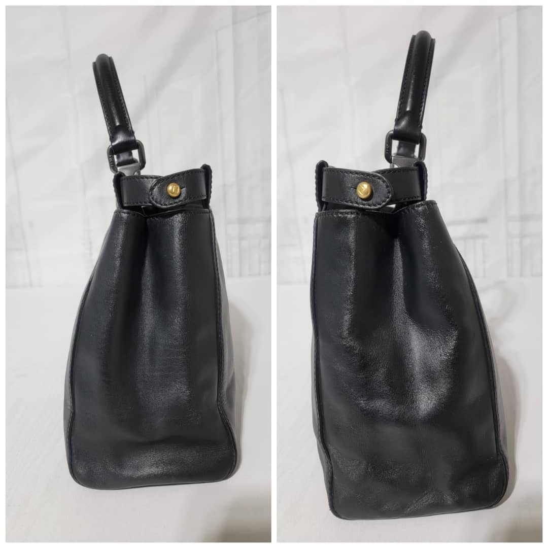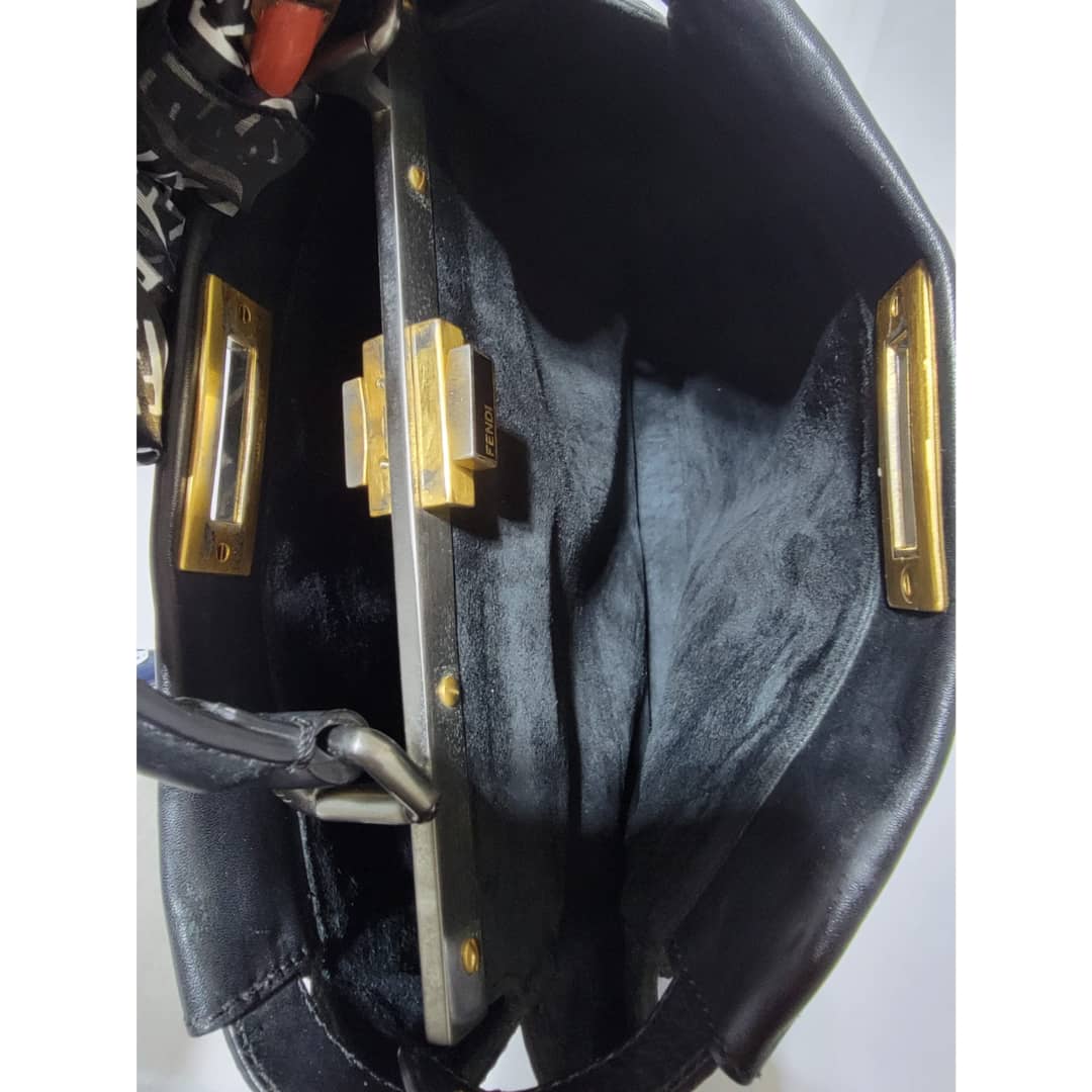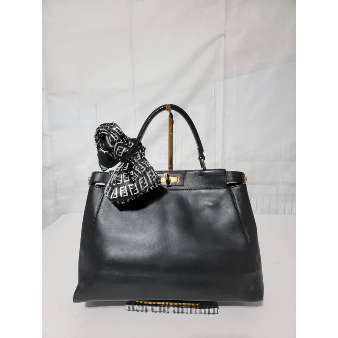This authentic Fendi Peekaboo Leather Black is in it’s good pre-owned condition. The exterior leather is clean and beautiful, there is a little hairline scratches that is not obvious on the exteriorleather. Interior is clean. It does not come with a long strap. The scarf is an ordinary scarf with a FF print. If you need the scarf during purchase, kindly let me know