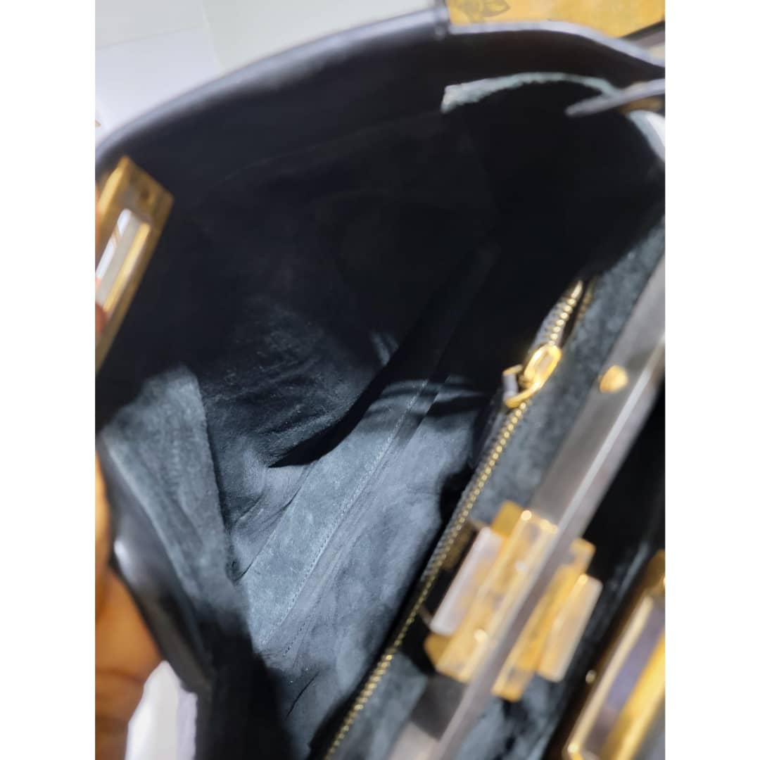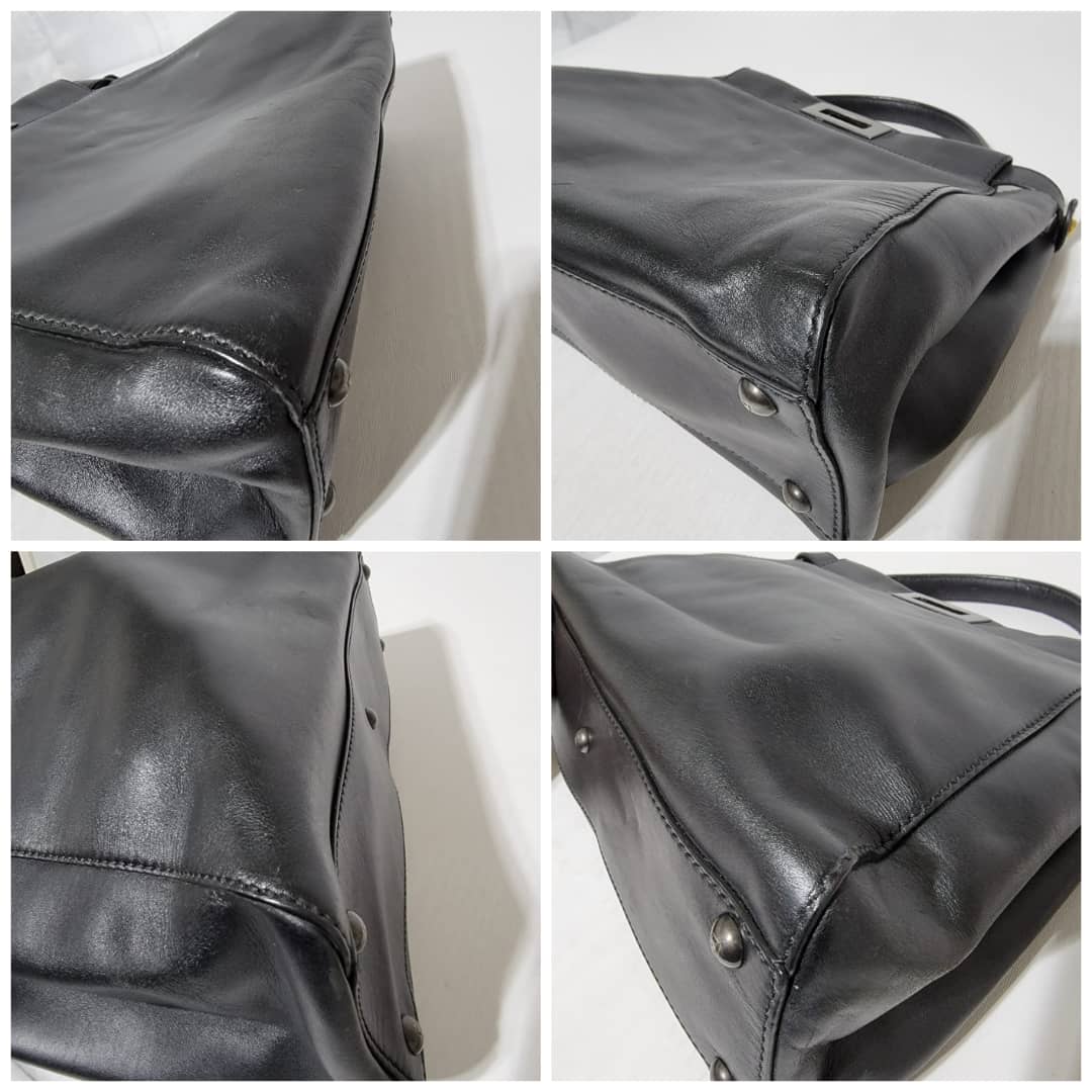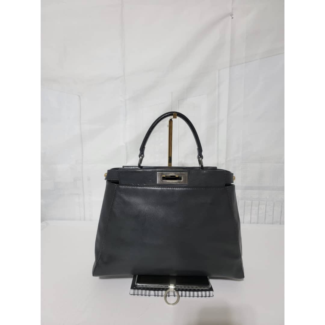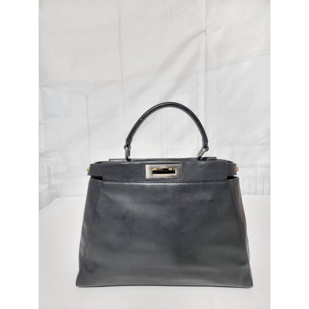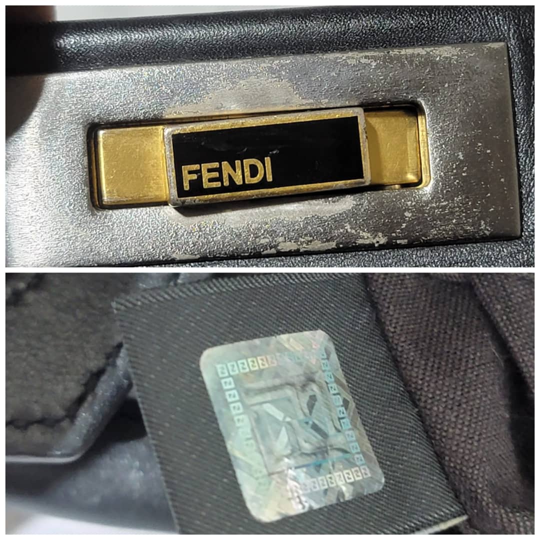 This authentic Fendi Peekaboo Leather Black is in it’s good pre-owned condition. The exterior leather is clean and beautiful, there is a little hairline scratches that is not obvious on the exteriorleather. Interior is clean. It does not come with a long strap. The scarf is an ordinary scarf with a FF print. If you need the scarf during purchase, kindly let me know
