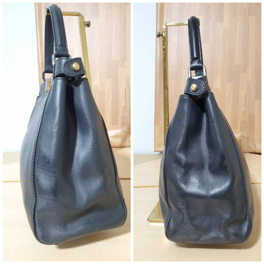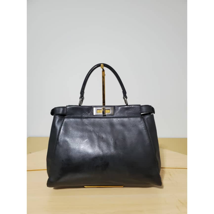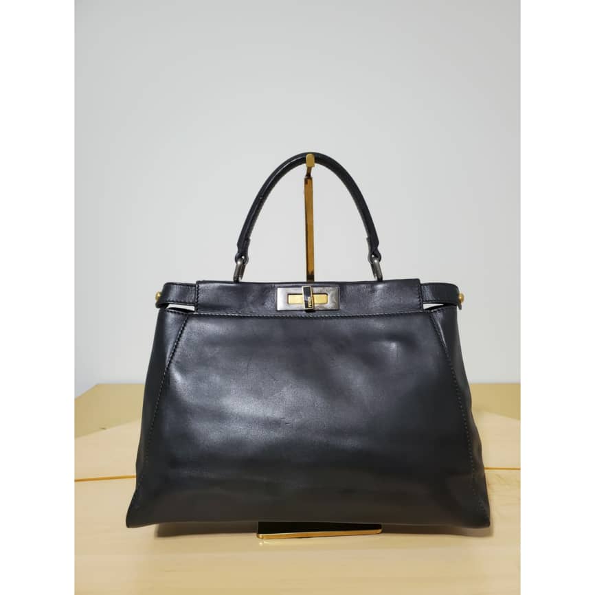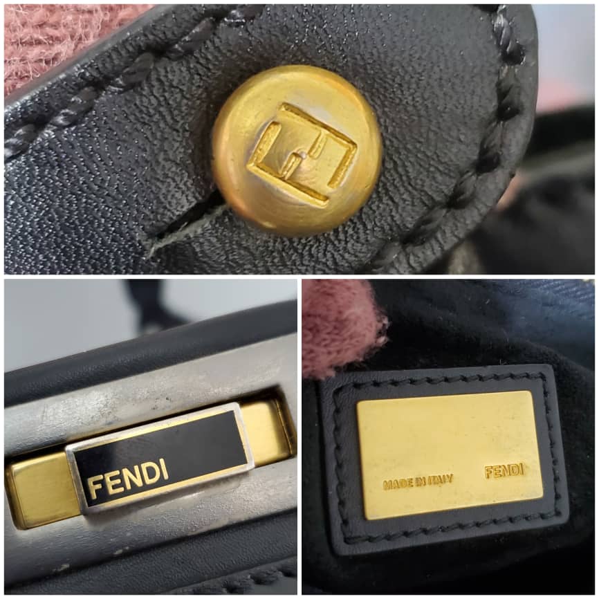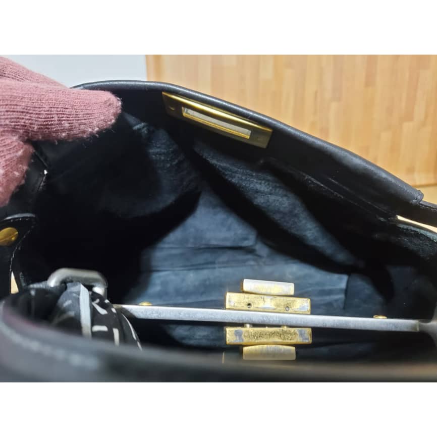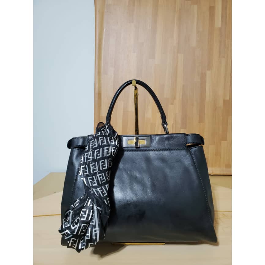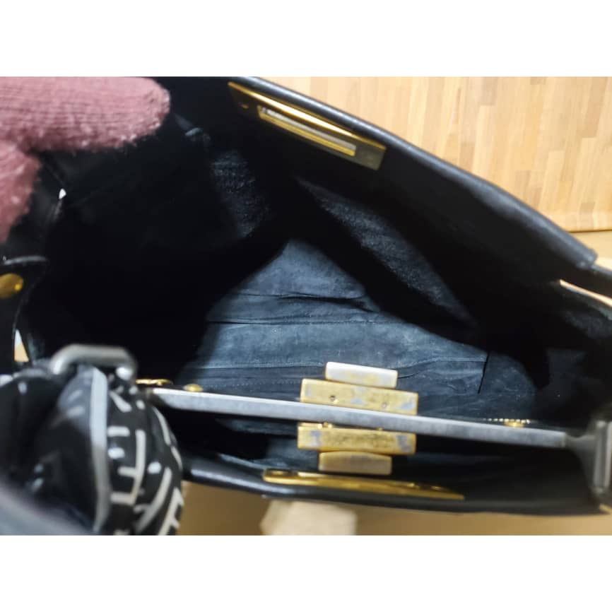 This authentic Fendi Peekaboo Top Handle Bag Black Leather Medium bag is in it’s pre-owned good condition. The exterior leather is clean and beautiful. Interior is clean. Silver and gold hardware. It’s a regular FF scarf free.