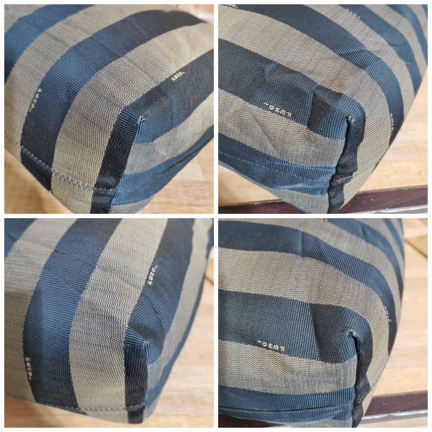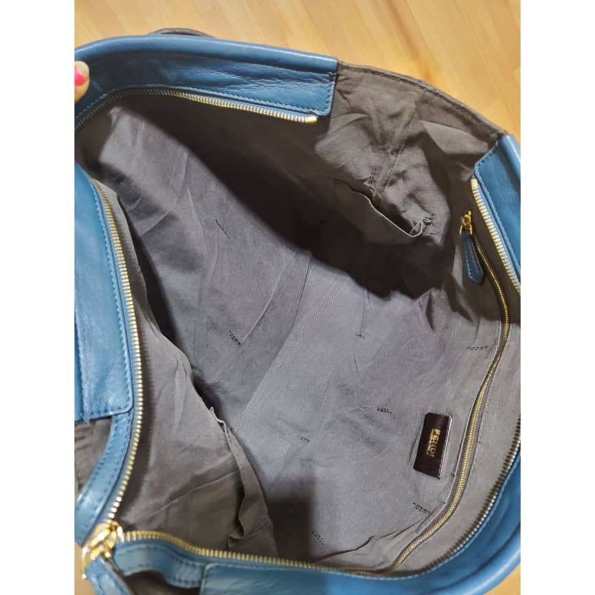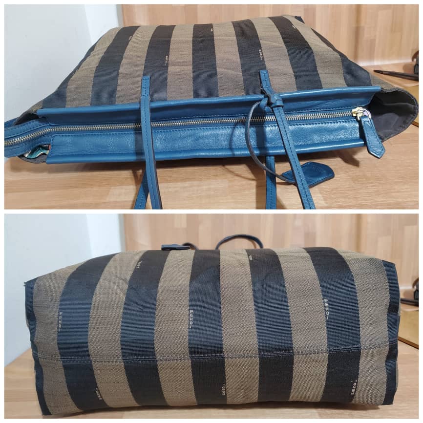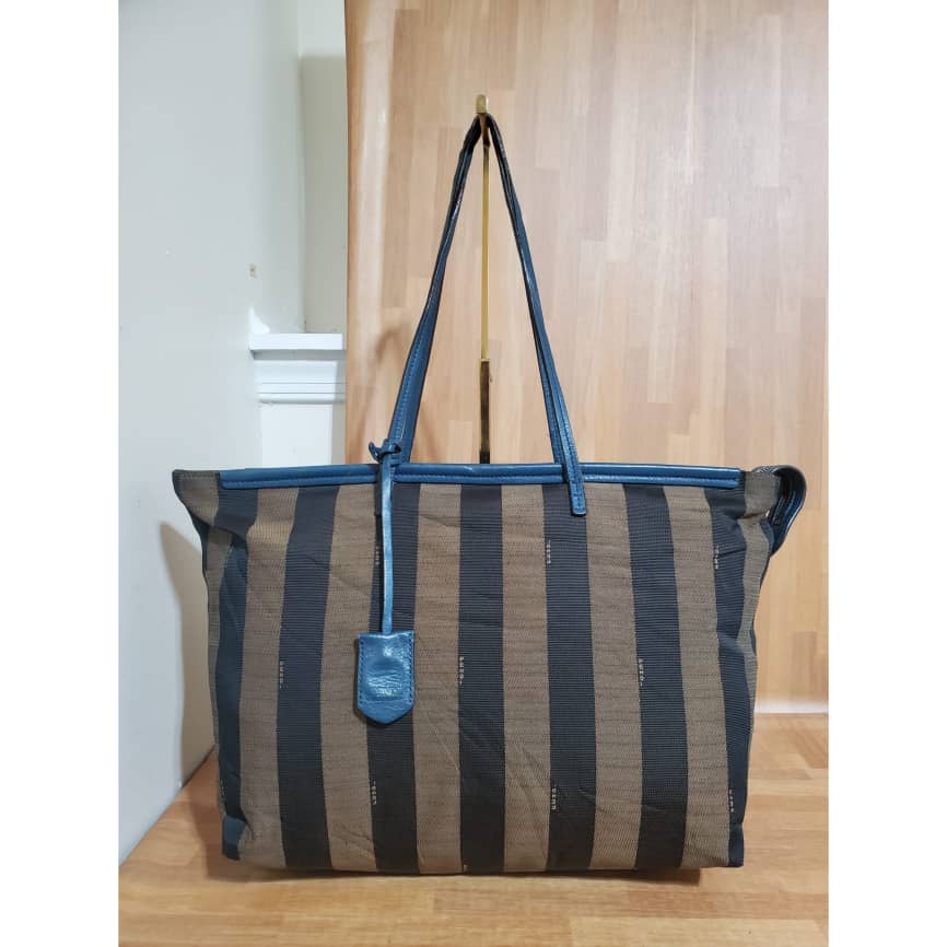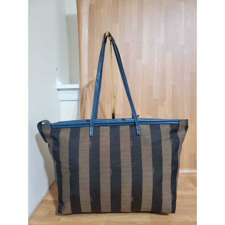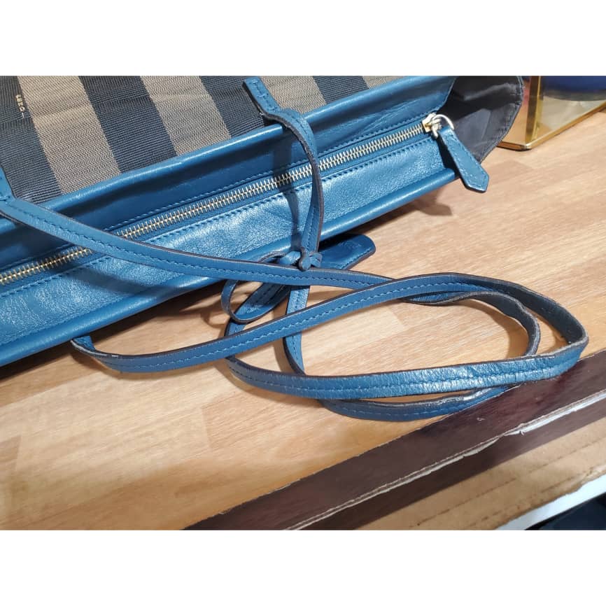 This authentic Fendi Pequin Canvas & Leather Roll Tote Brown, Black, Blue Tote is in its good pre-owned condition. The exterior canvas is clean and beautiful. Interior is clean. It’s in good condition. Perfect for this season.