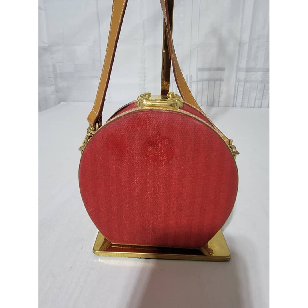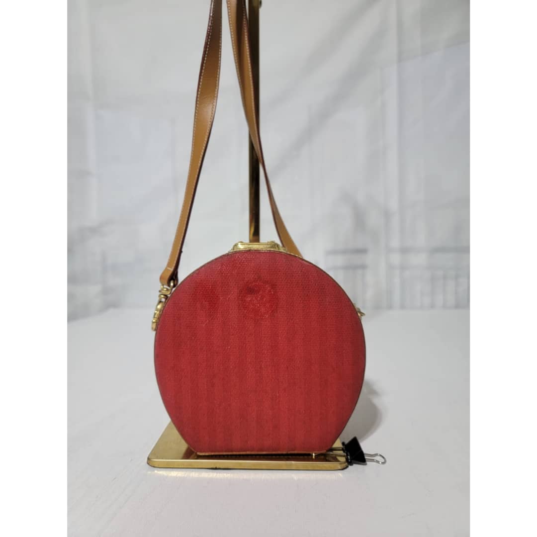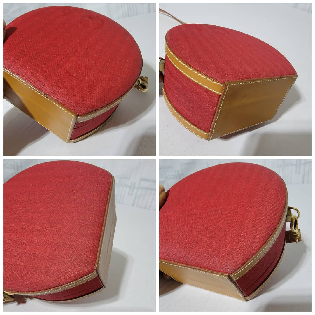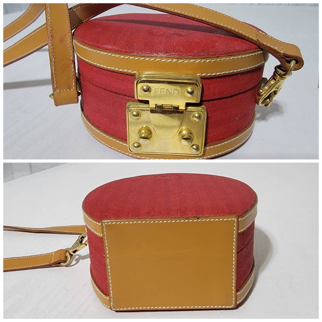 This authentic Fendi Vintage Pequin Round Box Bag Red is in it’s good pre-owned condition. The exterior is clean and beautiful, shows sign of vintage wear (Kindly look at pictures above). Interior is clean. The heat stamp hardware inside shows little sign of rust. Can be worn as a crossbody/shoulder bag.
