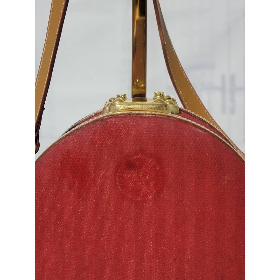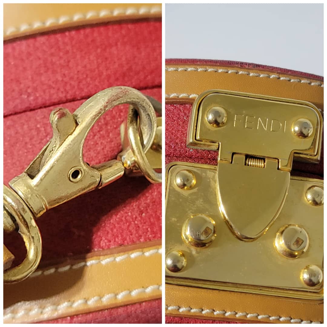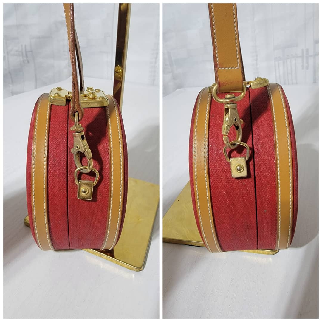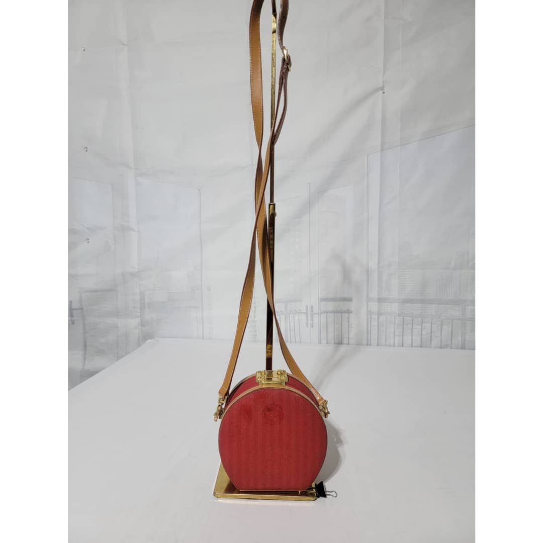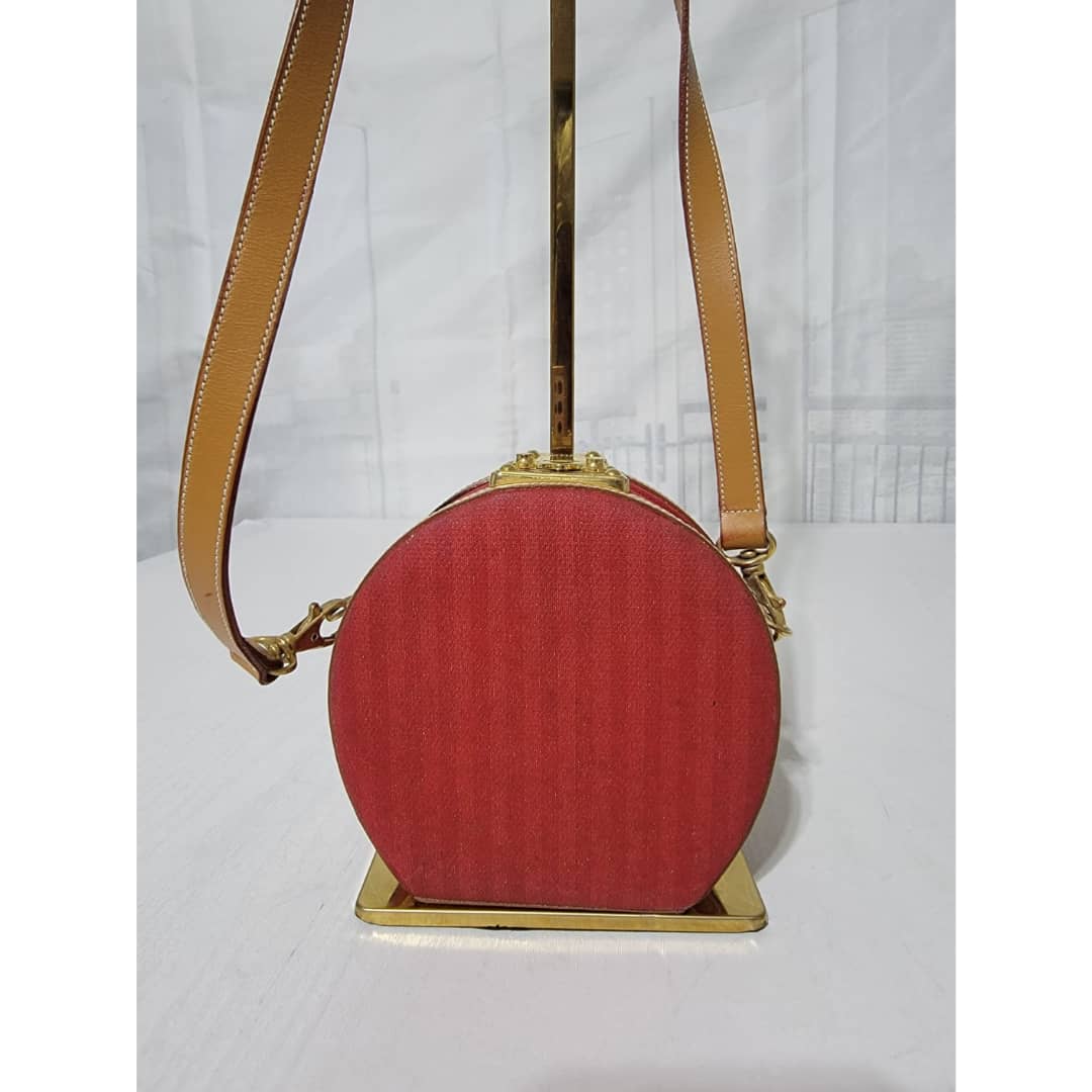 This authentic Fendi Vintage Pequin Round Box Bag Red is in it’s good pre-owned condition. The exterior is clean and beautiful, shows sign of vintage wear (Kindly look at pictures above). Interior is clean. The heat stamp hardware inside shows little sign of rust. Can be worn as a crossbody/shoulder bag.