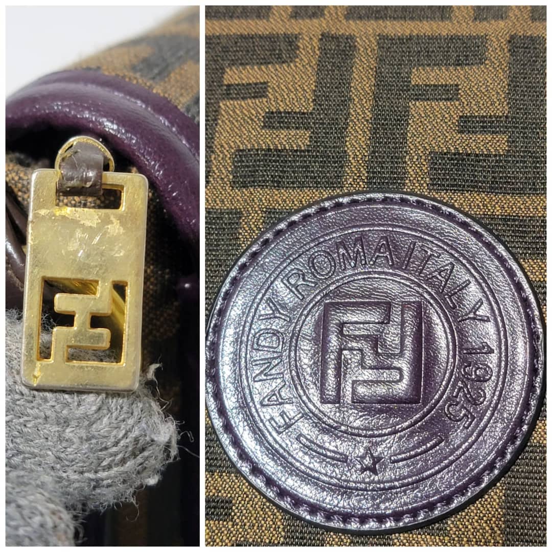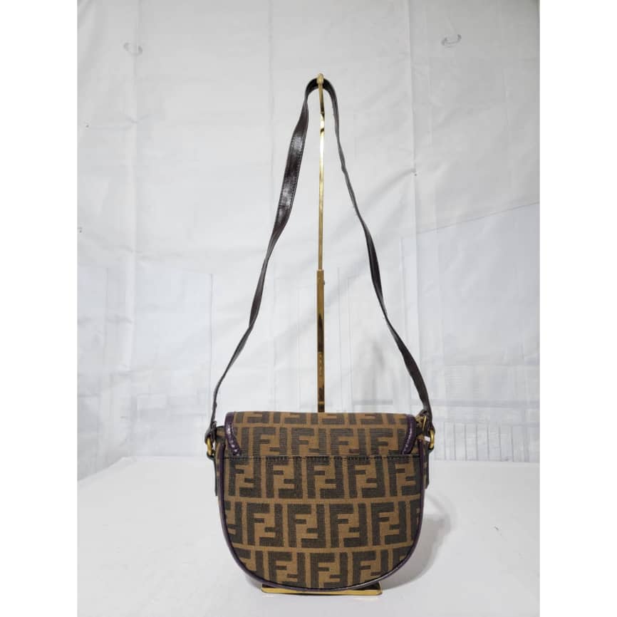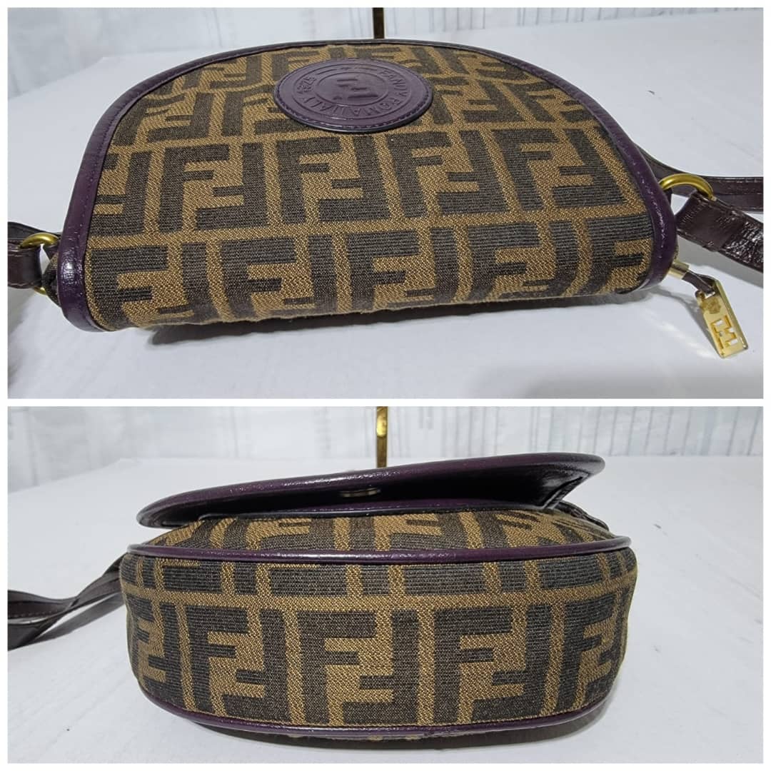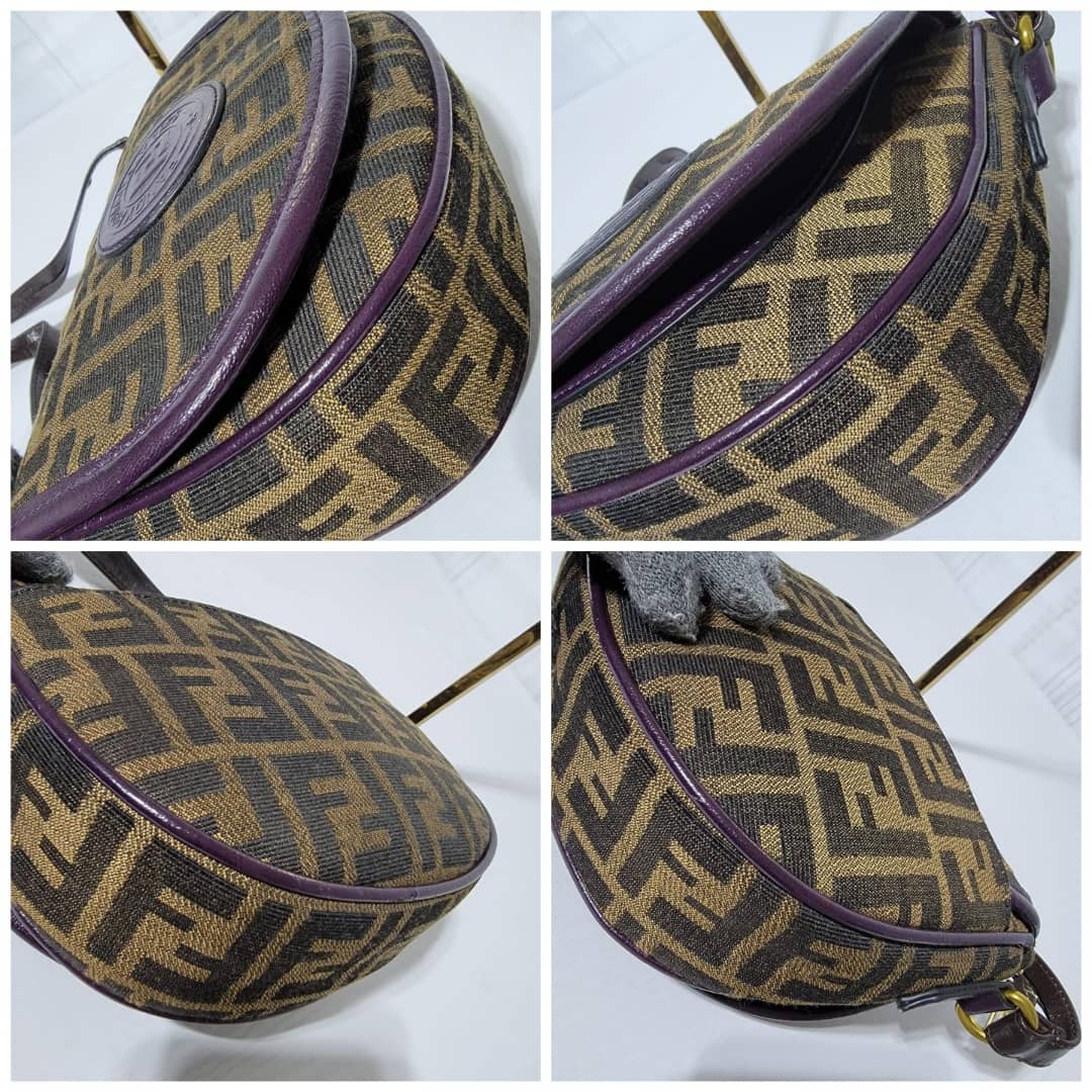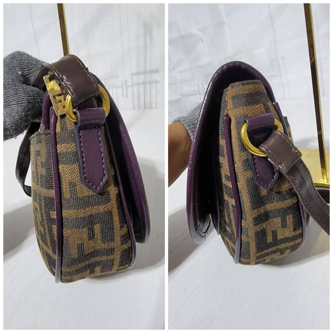 This authentic Fendi Vintage Zucca Crossbody Bag Brown is in it’s good pre-owned condition. The exterior is clean and beautiful, it has a purple trim leather around the bag and also a purple FF logo on the flap. Interior is clean and beautiful, it has a brown leather lining. The crossbody strap is a chocolate brown leather which can go as a crossbody/shoulder bag. Gold hardware.