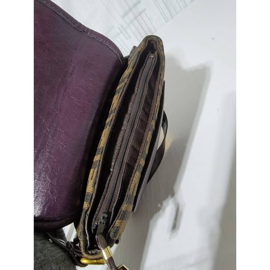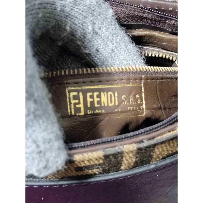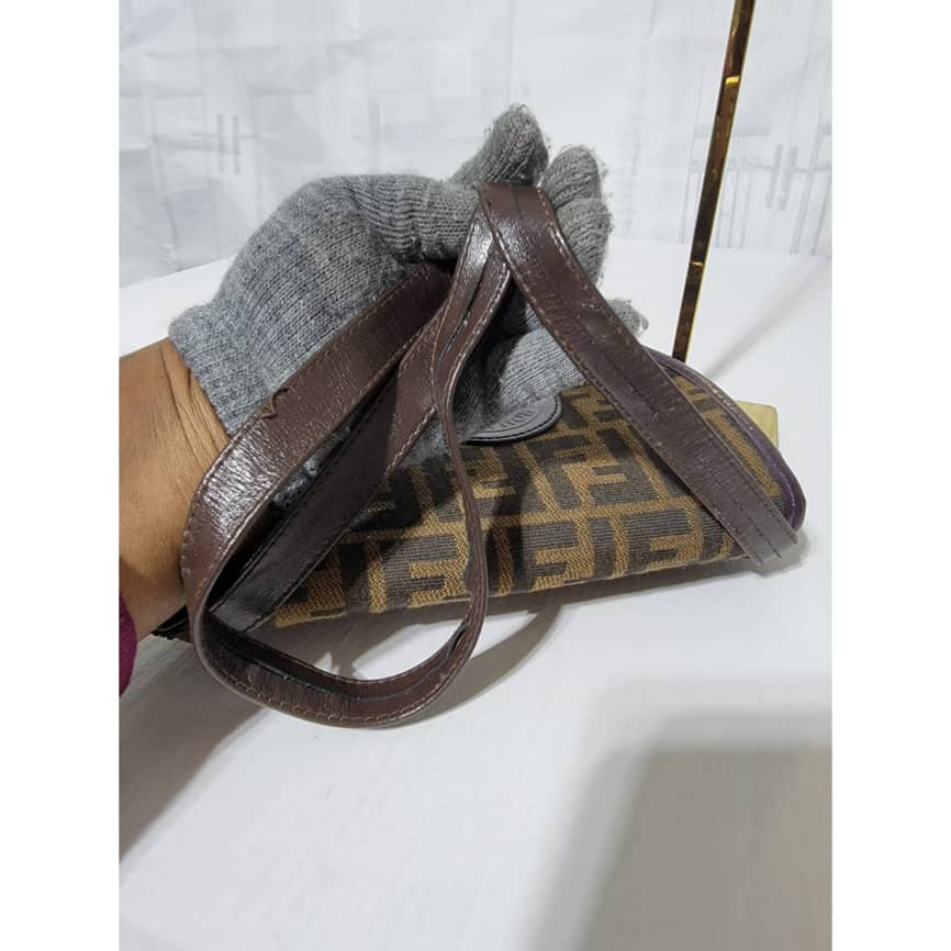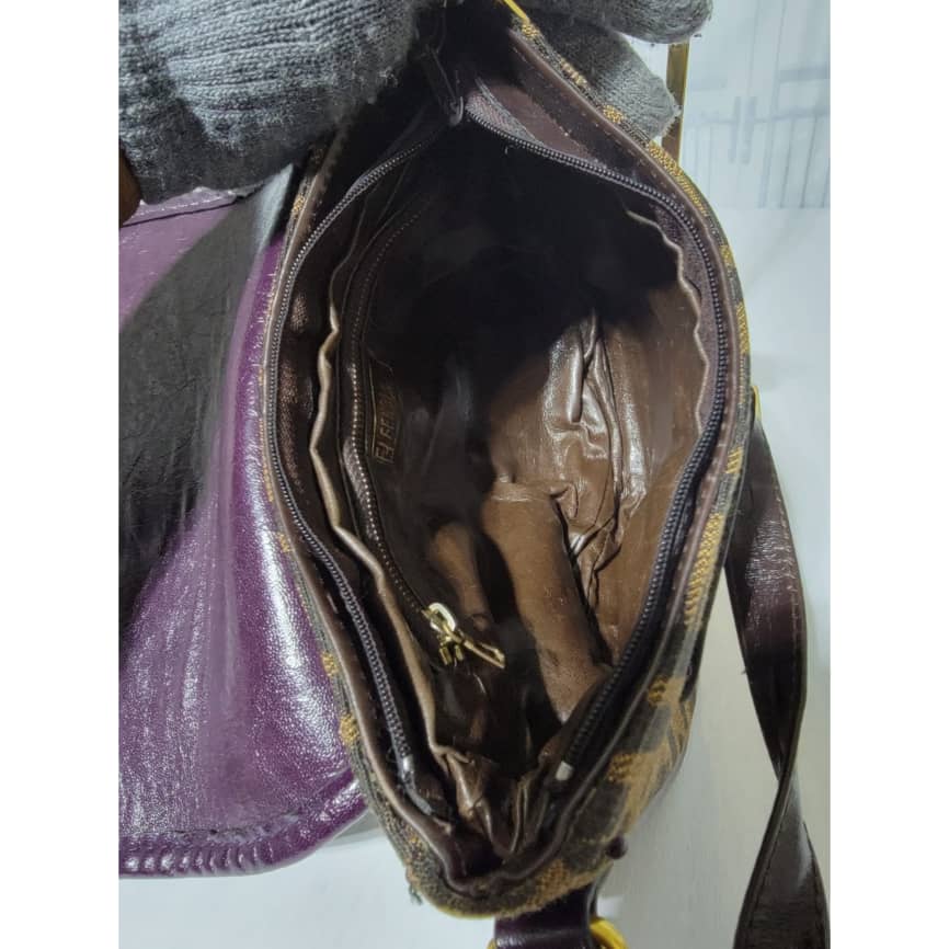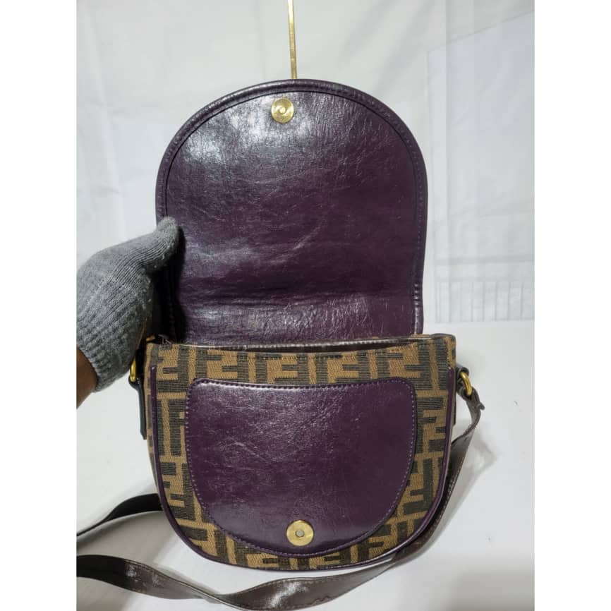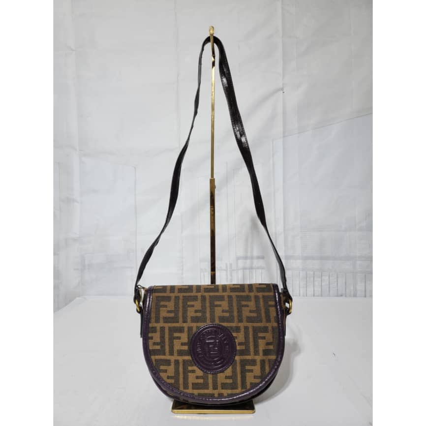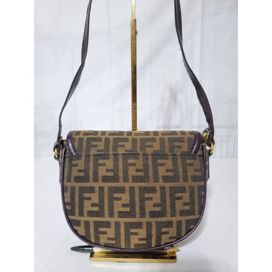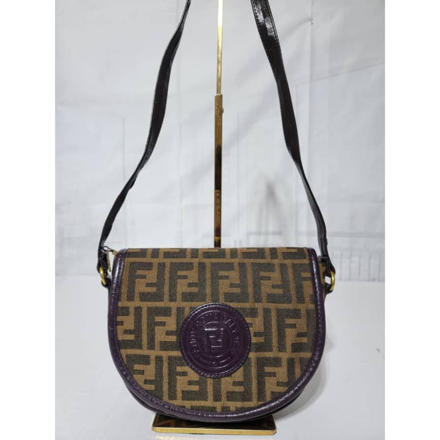 This authentic Fendi Vintage Zucca Crossbody Bag Brown is in it’s good pre-owned condition. The exterior is clean and beautiful, it has a purple trim leather around the bag and also a purple FF logo on the flap. Interior is clean and beautiful, it has a brown leather lining. The crossbody strap is a chocolate brown leather which can go as a crossbody/shoulder bag. Gold hardware.