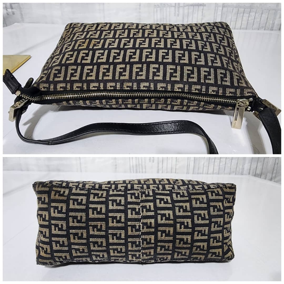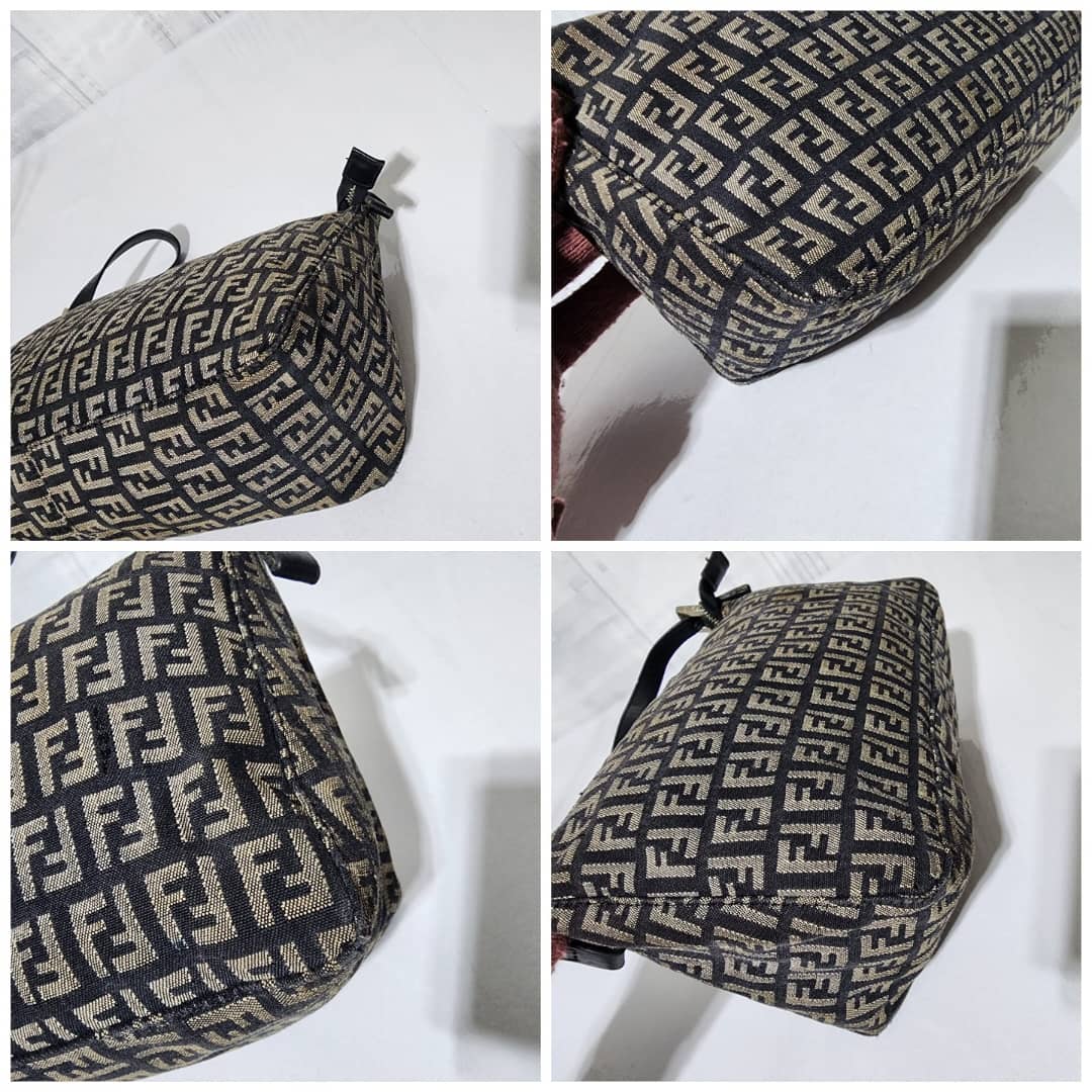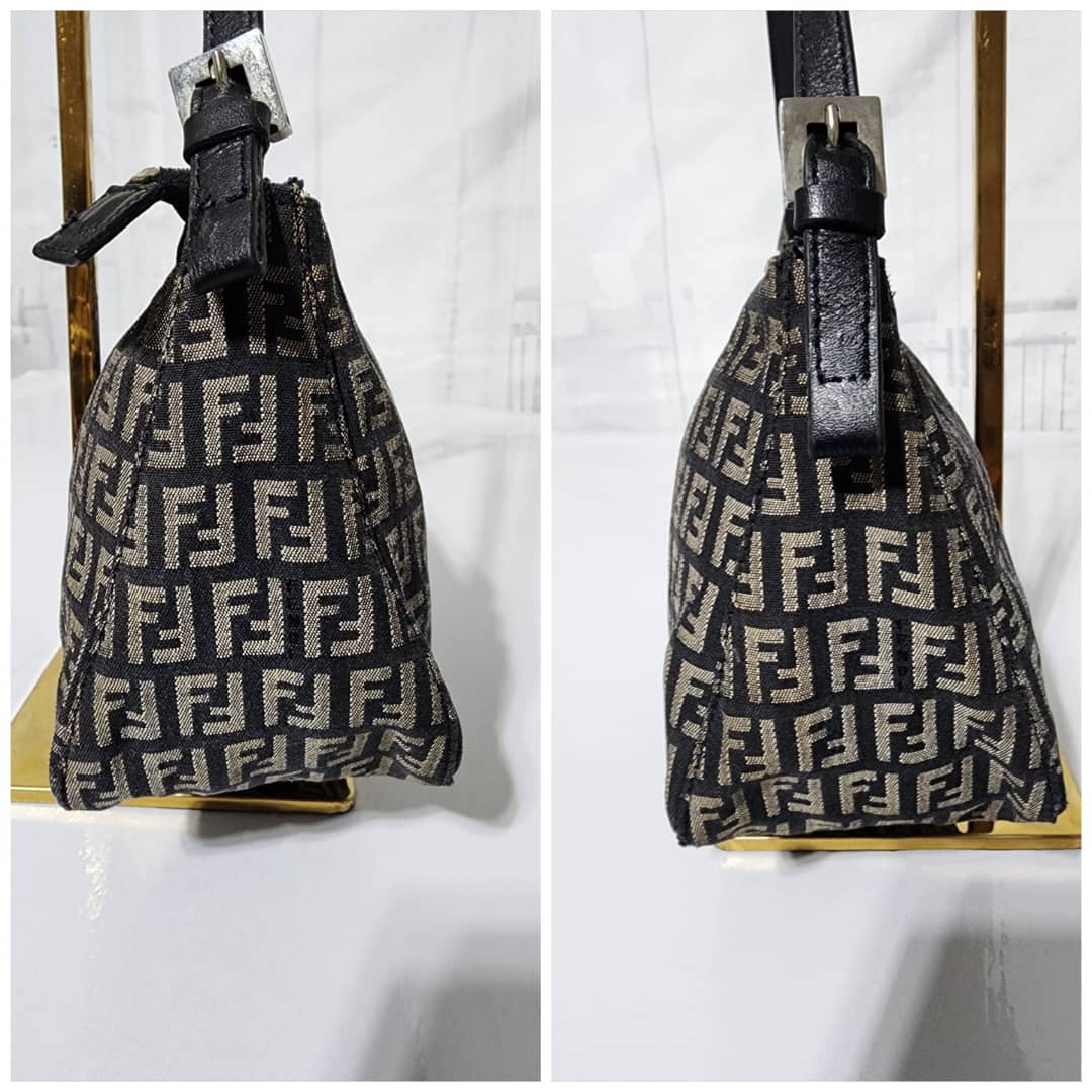 This authentic Fendi Vintage Zucchino Canvas Baguette Black/Grey is in it’s good pre-owned condition. The exterior is clean. Interior is clean. Silver hardware.