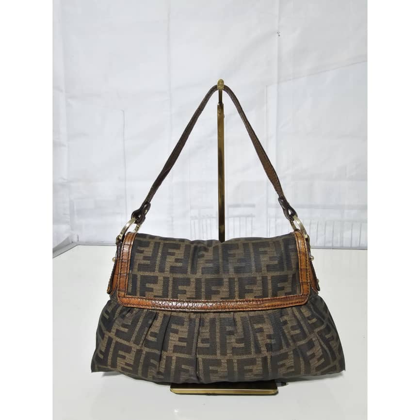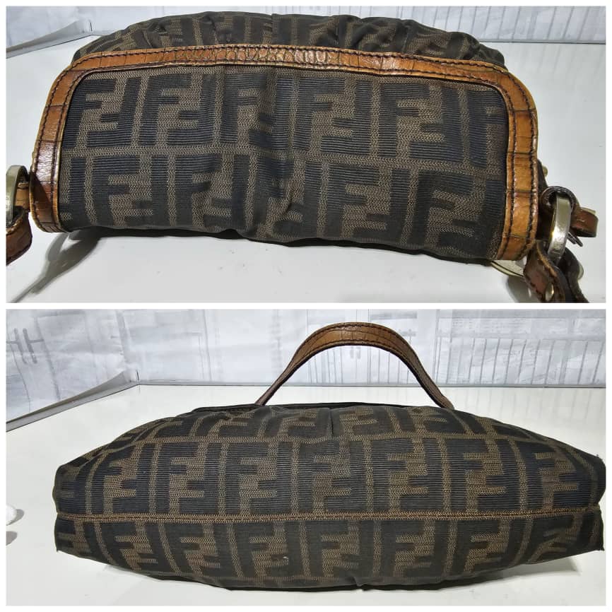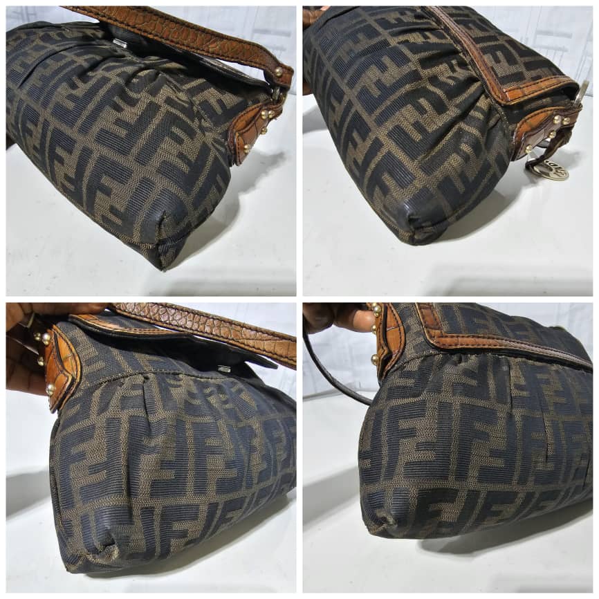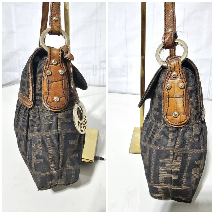 This authentic FENDI Zucca Calfskin Crocodile Embossed Small Chef Shoulder Bag Brown is in it’s good pre-owned condition. The exterior canvas is clean and beautiful. The interior is clean. Gold hardware shows some scratches. It is a great shoulder bag.
