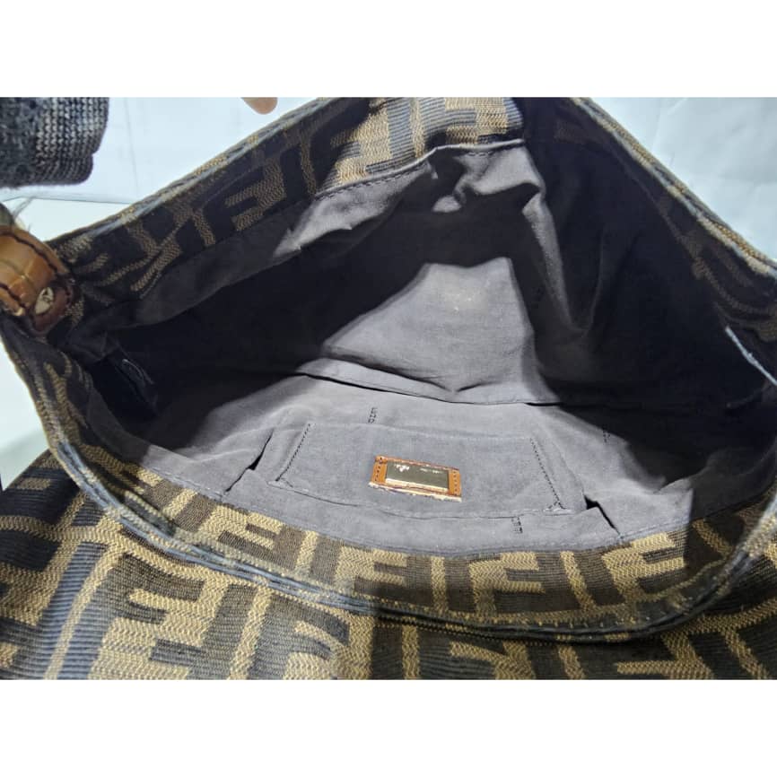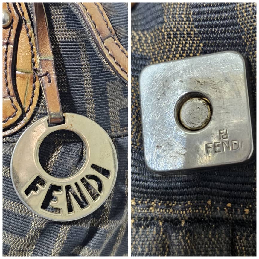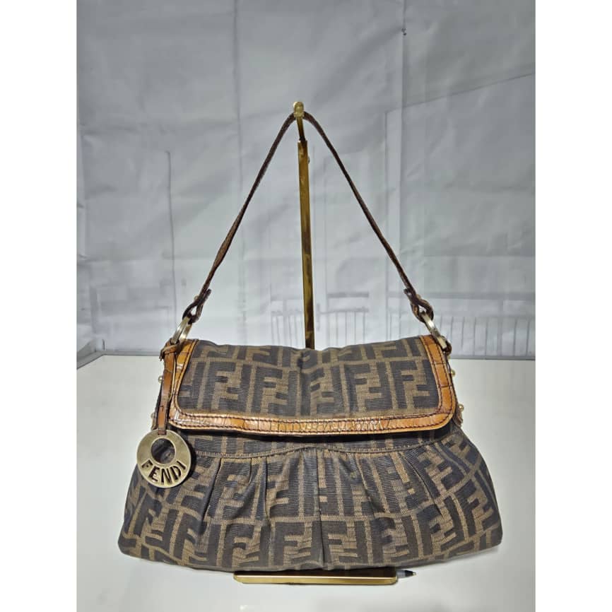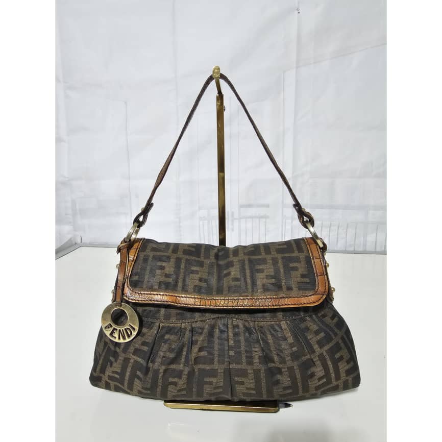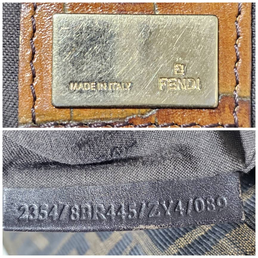 This authentic FENDI Zucca Calfskin Crocodile Embossed Small Chef Shoulder Bag Brown is in it’s good pre-owned condition. The exterior canvas is clean and beautiful. The interior is clean. Gold hardware shows some scratches. It is a great shoulder bag.