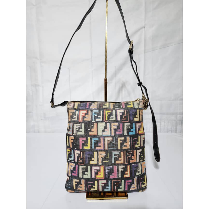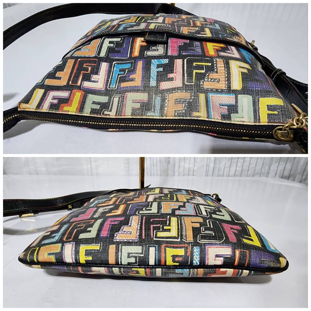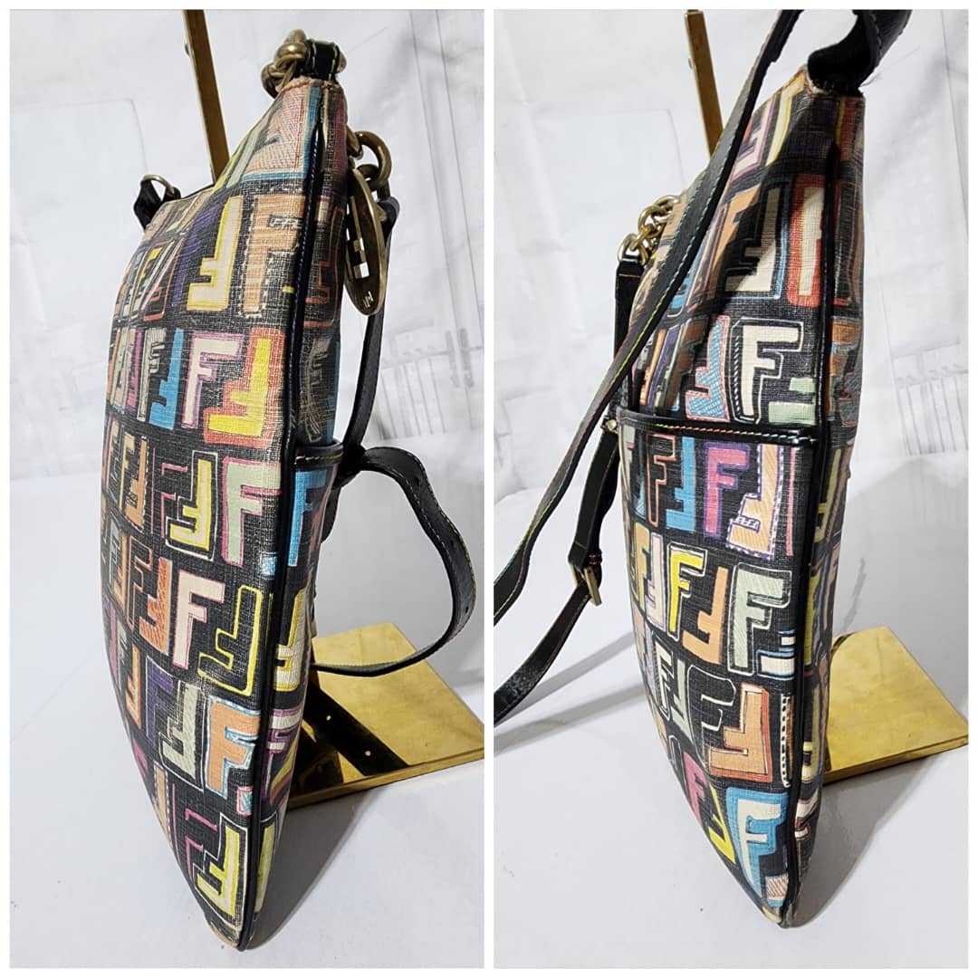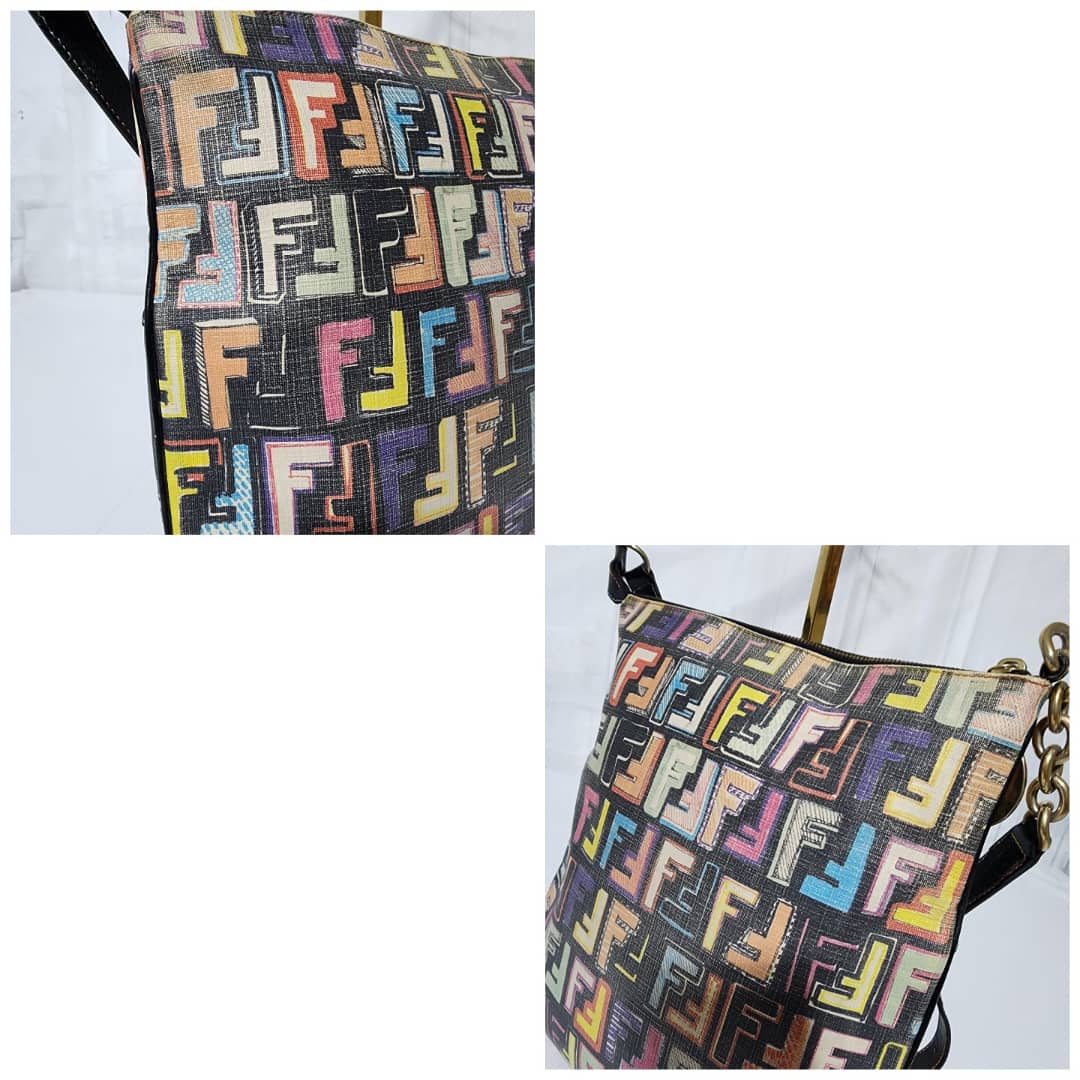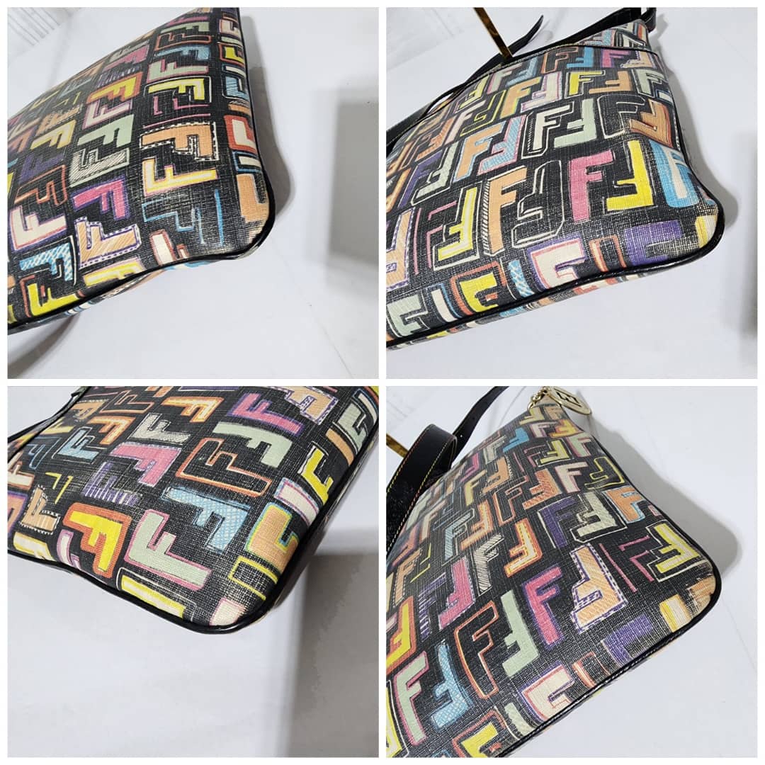 This authentic FENDI Zucca Canvas Shoulder Bag Multicolor/Black is in itβs pre-owned condition. The exterior is clean however, it shows fading to the FF print design. Interior is clean. Gold hardware shows rubbing to it.