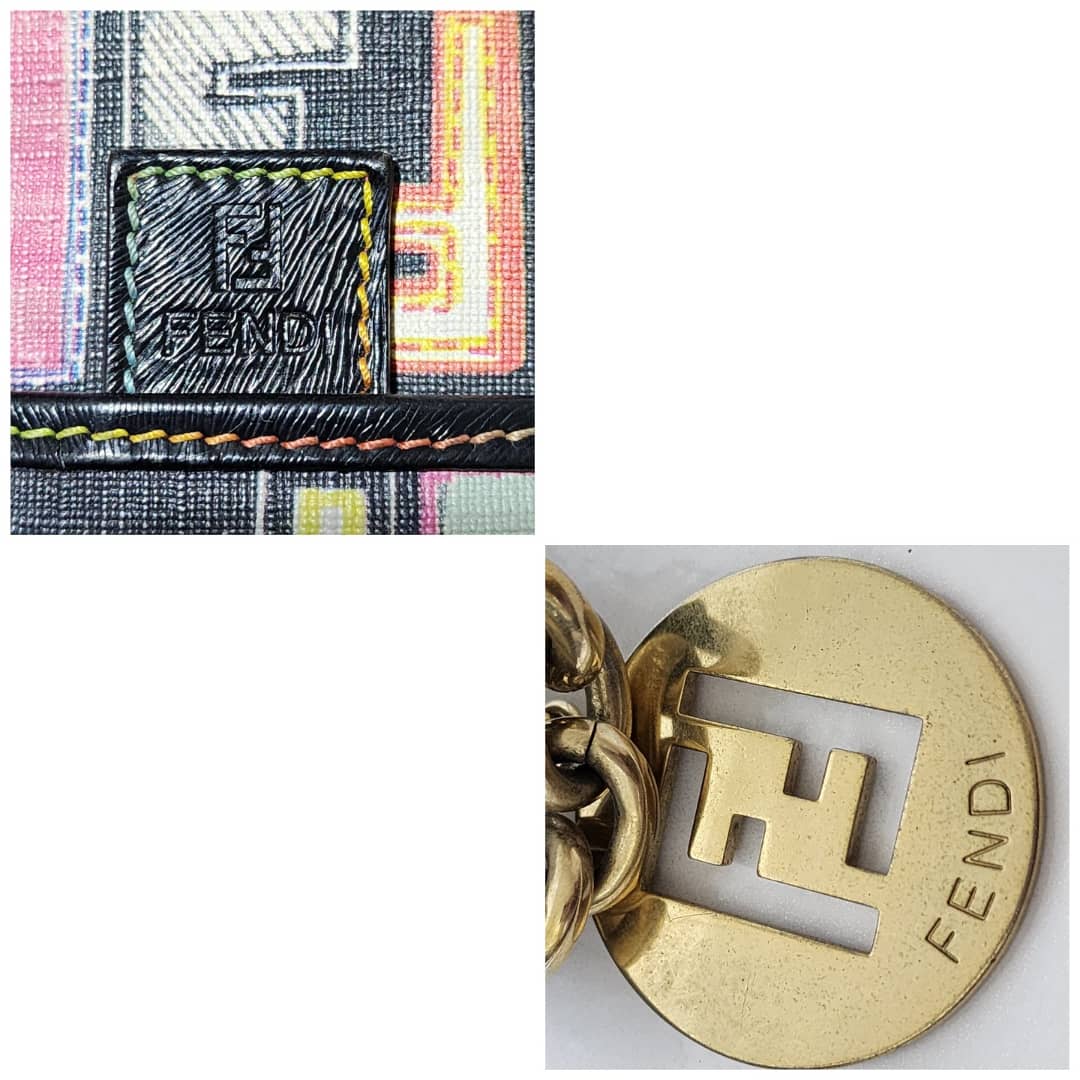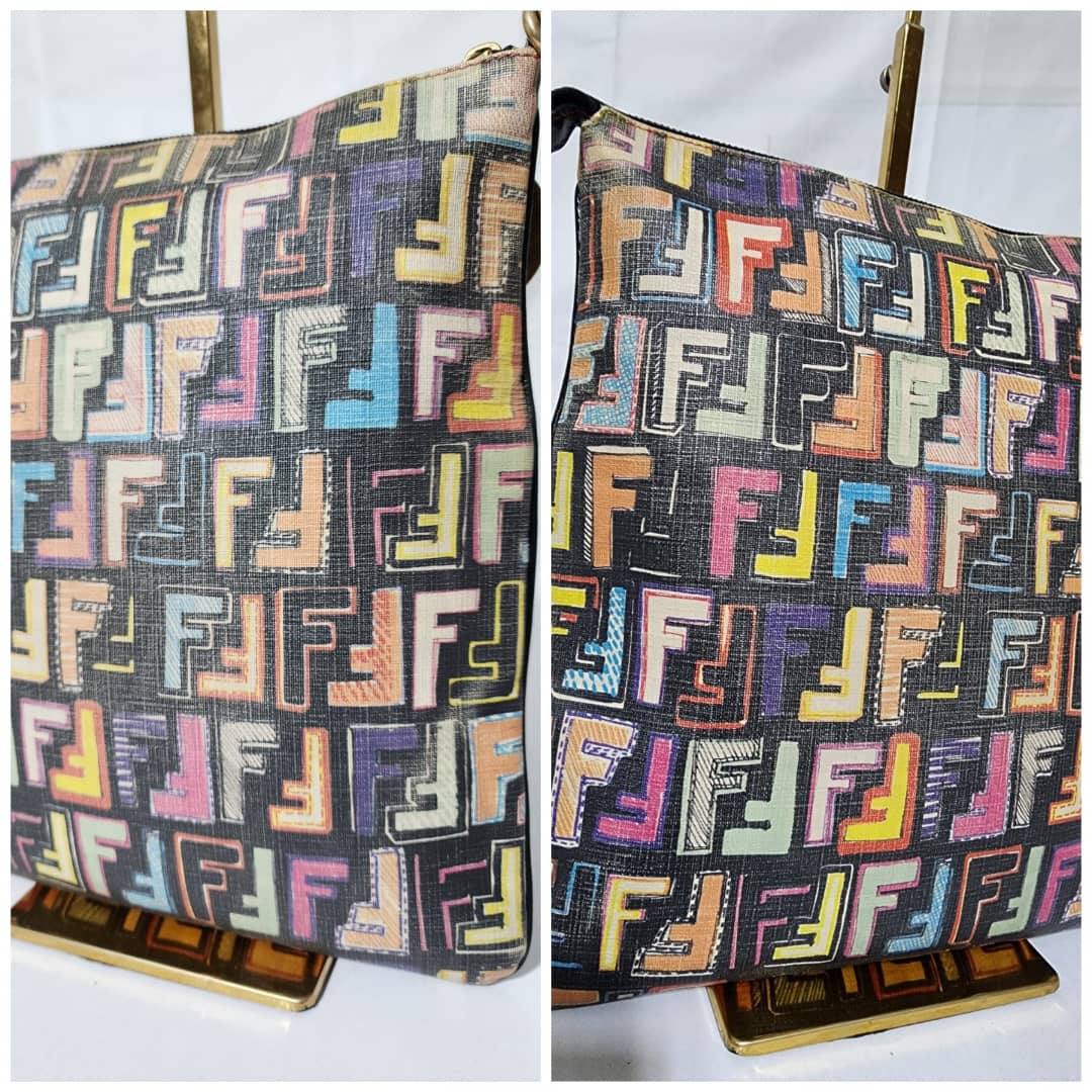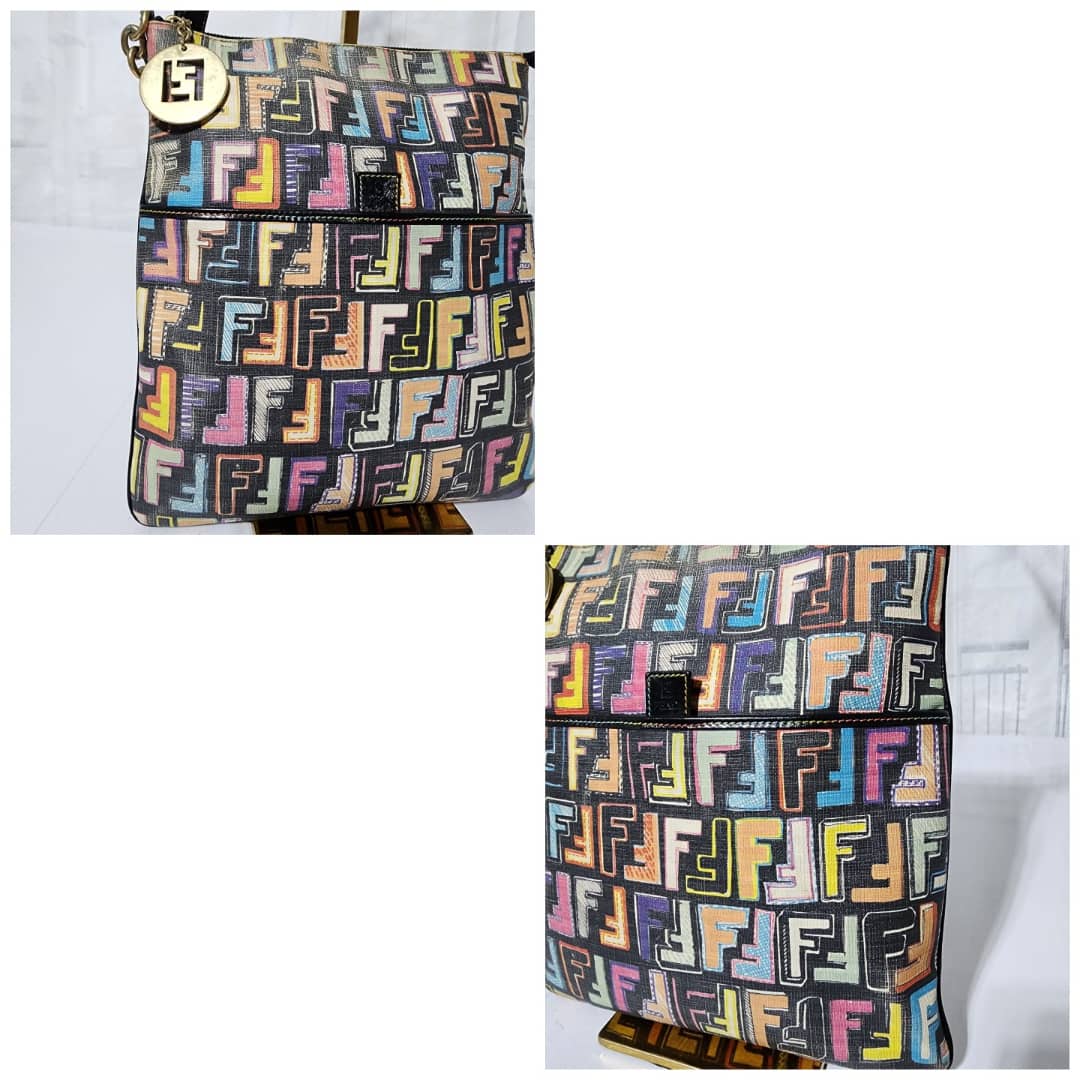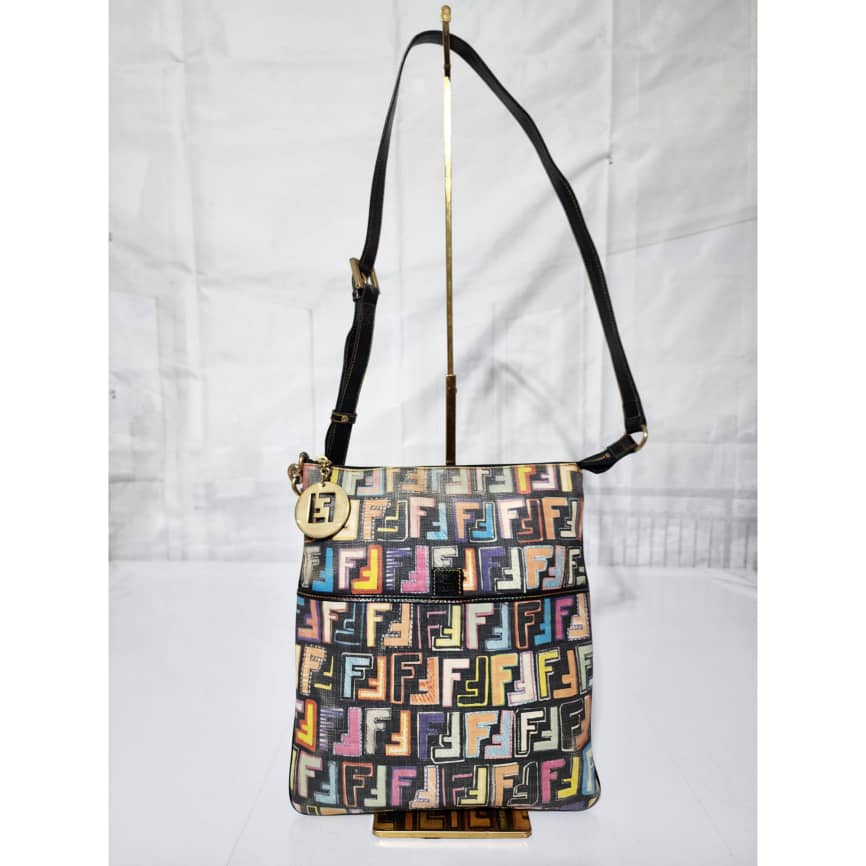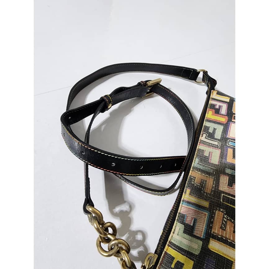 This authentic FENDI Zucca Canvas Shoulder Bag Multicolor/Black is in itβs pre-owned condition. The exterior is clean however, it shows fading to the FF print design. Interior is clean. Gold hardware shows rubbing to it.