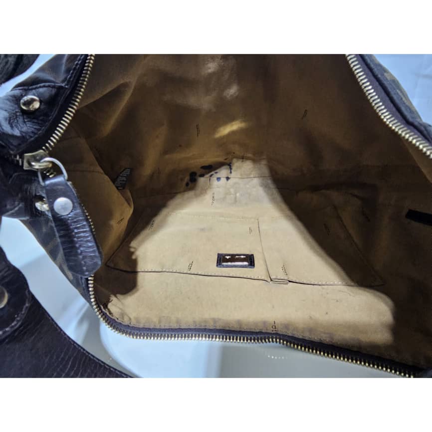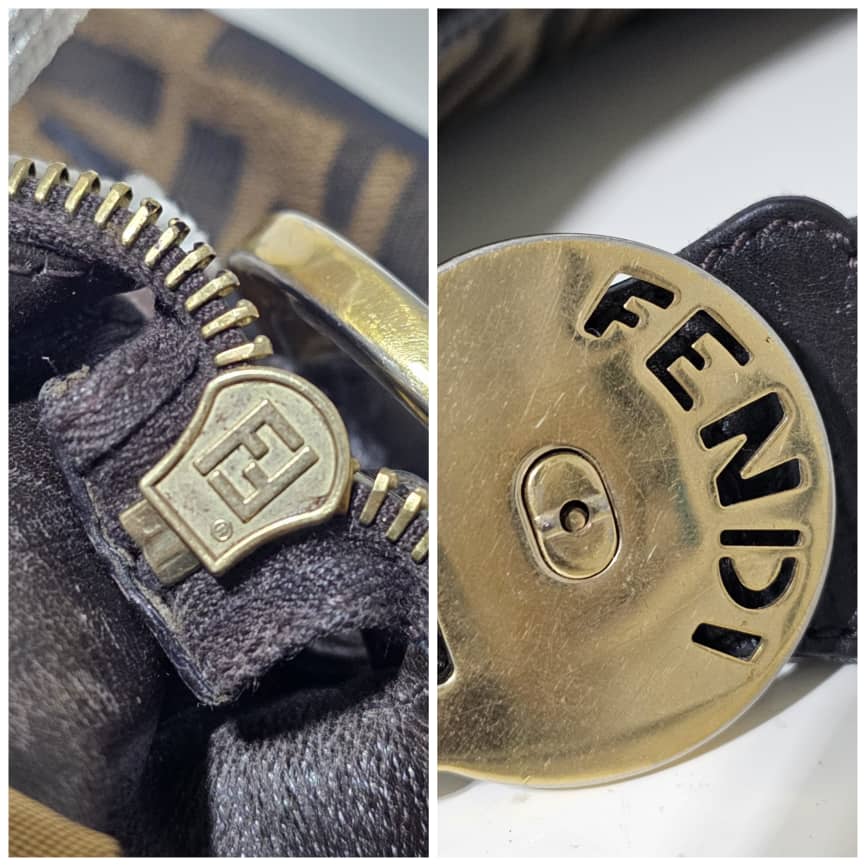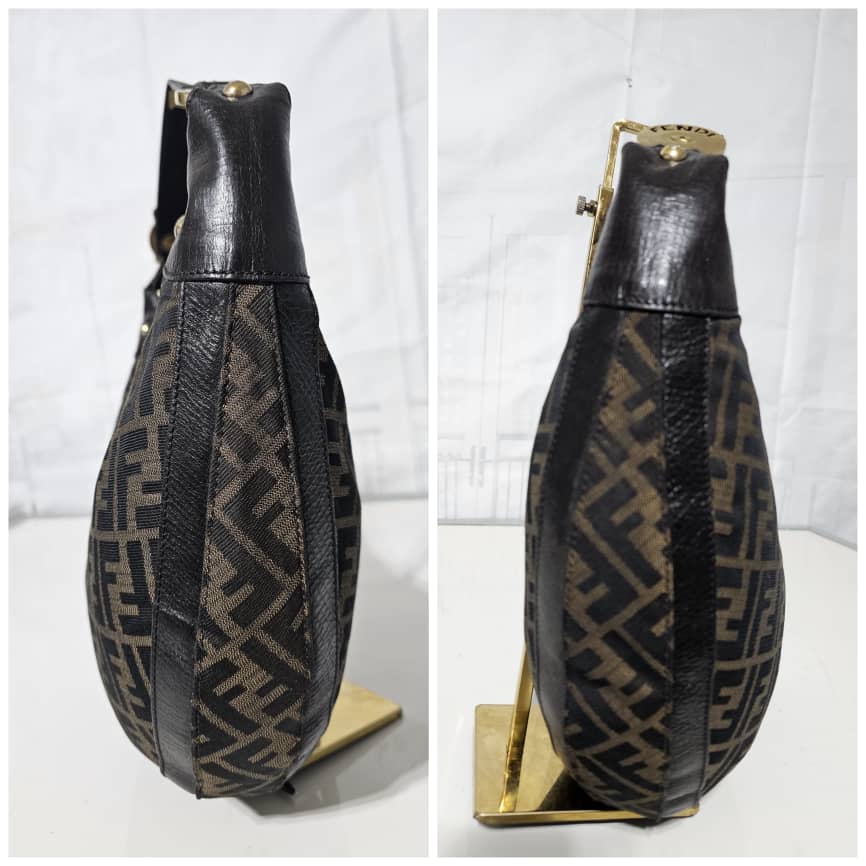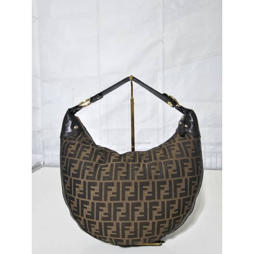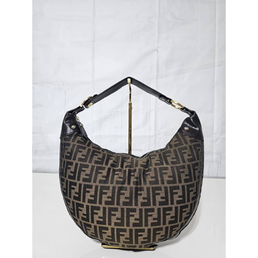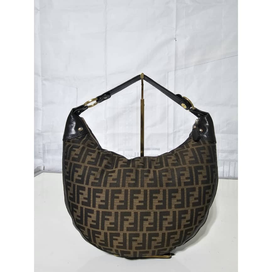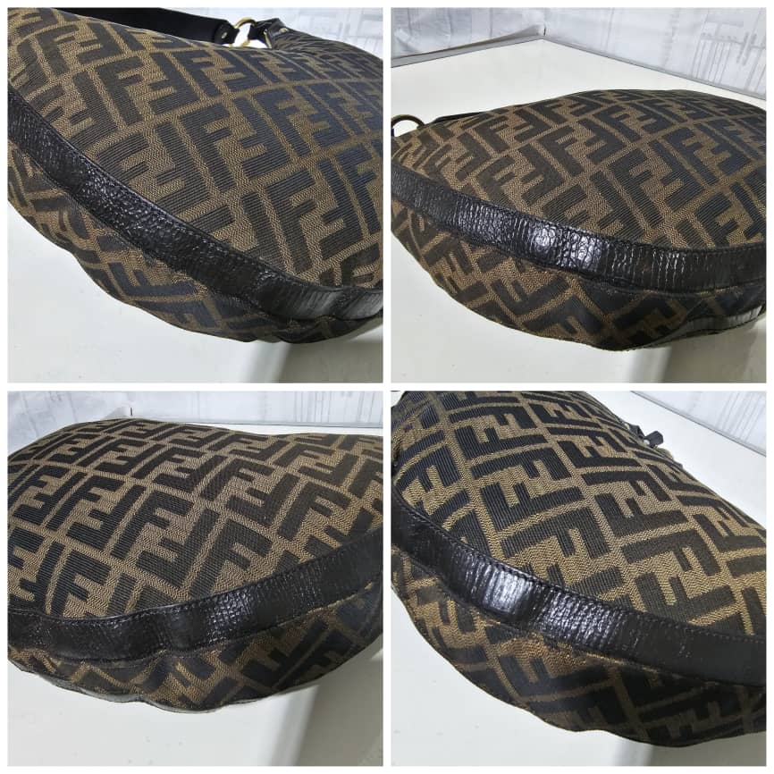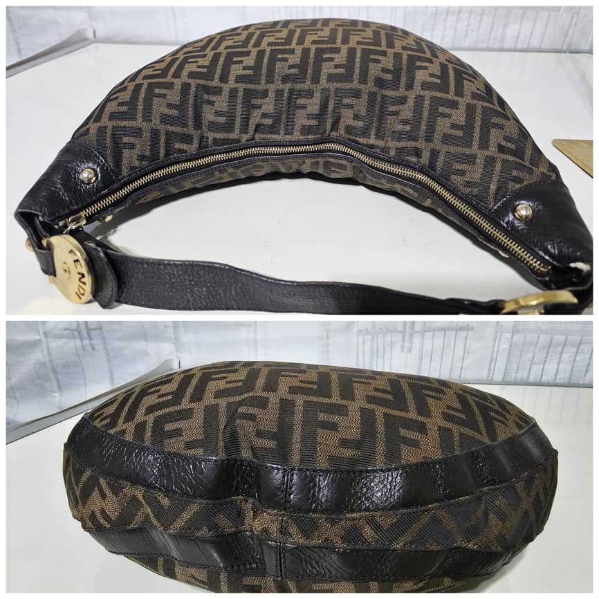 This authentic FENDI ZUCCA LEATHER TRIM HALF MOON CROISSANT BAG is in it’s good pre-owned condition. This hobo is constructed of Zucca print Fendi FF canvas with a croissant shape. The bag features leather trim and matching strap handle with gold links and studs. The top zipper opens to a cocoa brown fabric interior with patch pockets. Exterior is clean and beautiful. Interior is clean with little ink mark at the side corner of the bag.