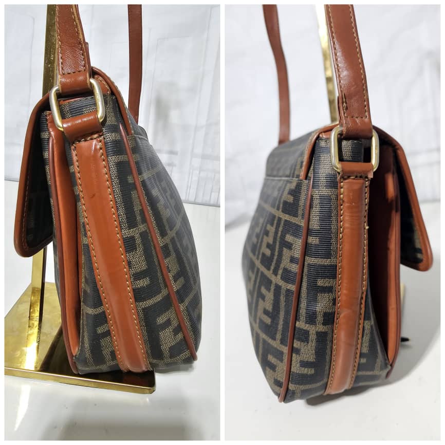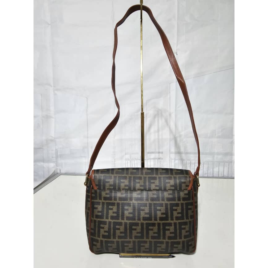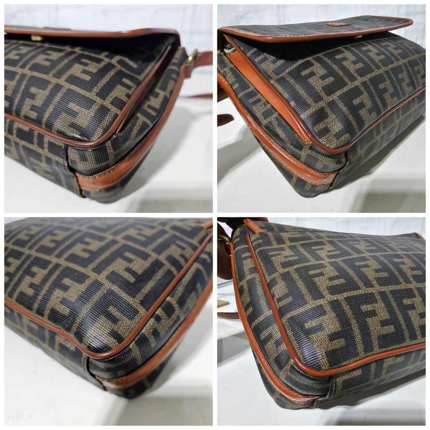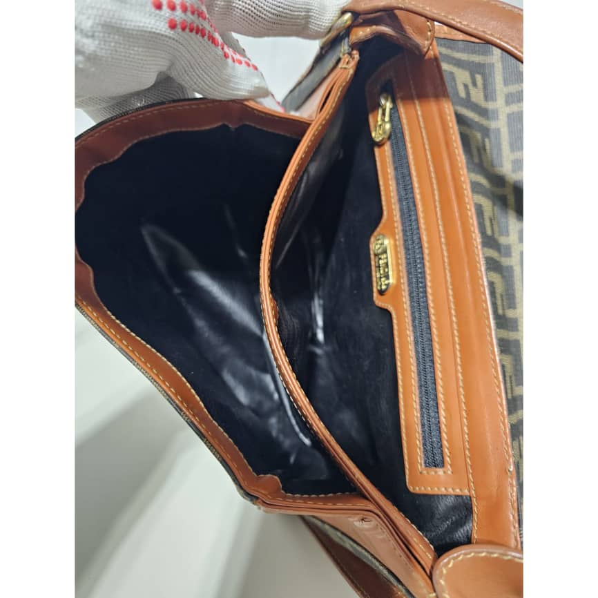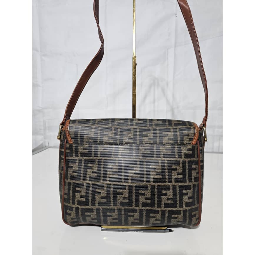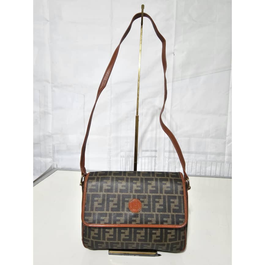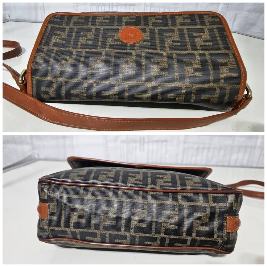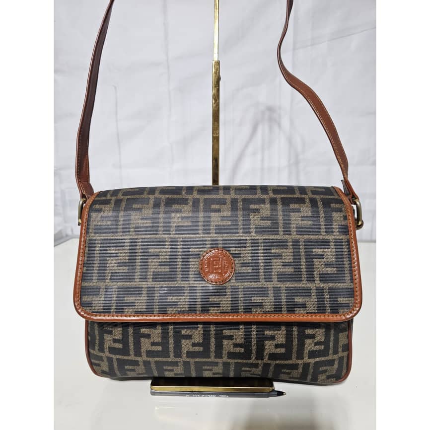 This authentic Fendi Zucca Logo Flap Crossbody/ Shoulder Bag is in it’s good pre-owned condition. The exterior leather is clean. The interior is clean. It is a vintage fendi bag.