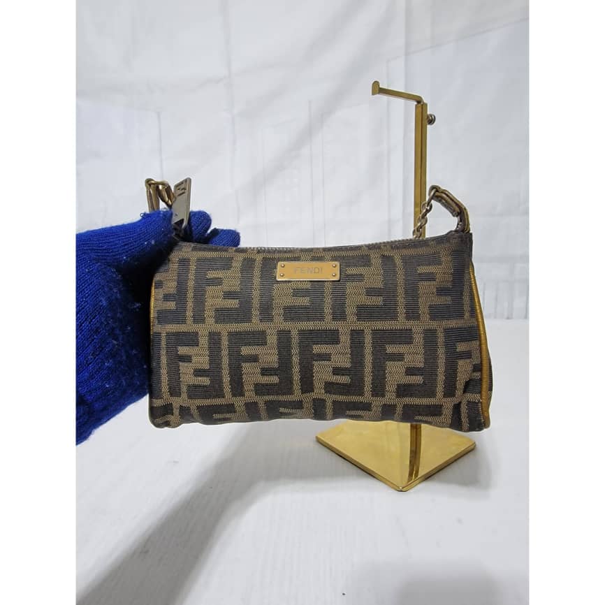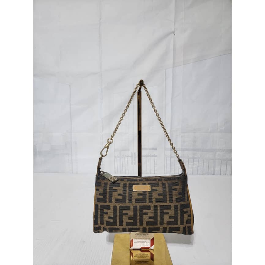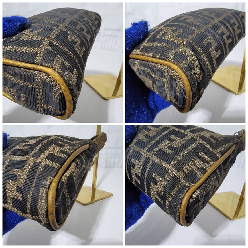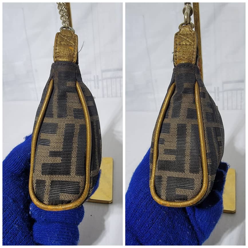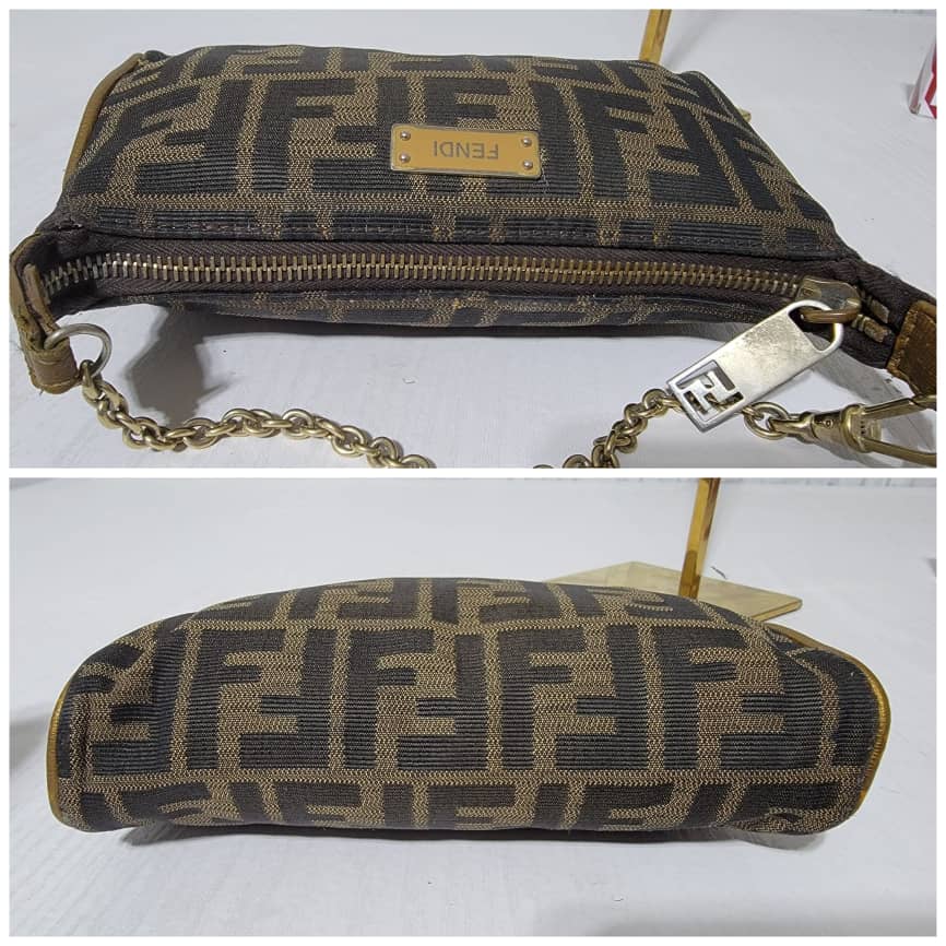 This authentic FENDI Zucca Pochette/Baguette Mini Shoulder Bag Brown is in it’s pre-owned condition. The exterior zucca canvas is clean. The gold trim leather that runs by the side of the bag and also the one holding the chain handle shows sign of rubbing and scratches to it (Kindly look at pictures above, it will be indicated). Gold hardware shows sign of rubbing. Interior is clean. It can be worn as a shoulder bag or clutch, you can also add a long strap to it to make it a crossbody bag. The FF zipper pull shows sign of rubbing to the hardware. Kindly note no longer strap