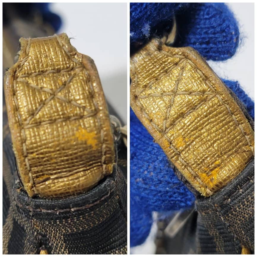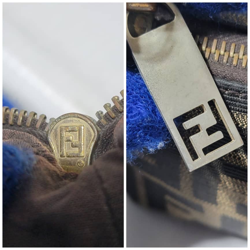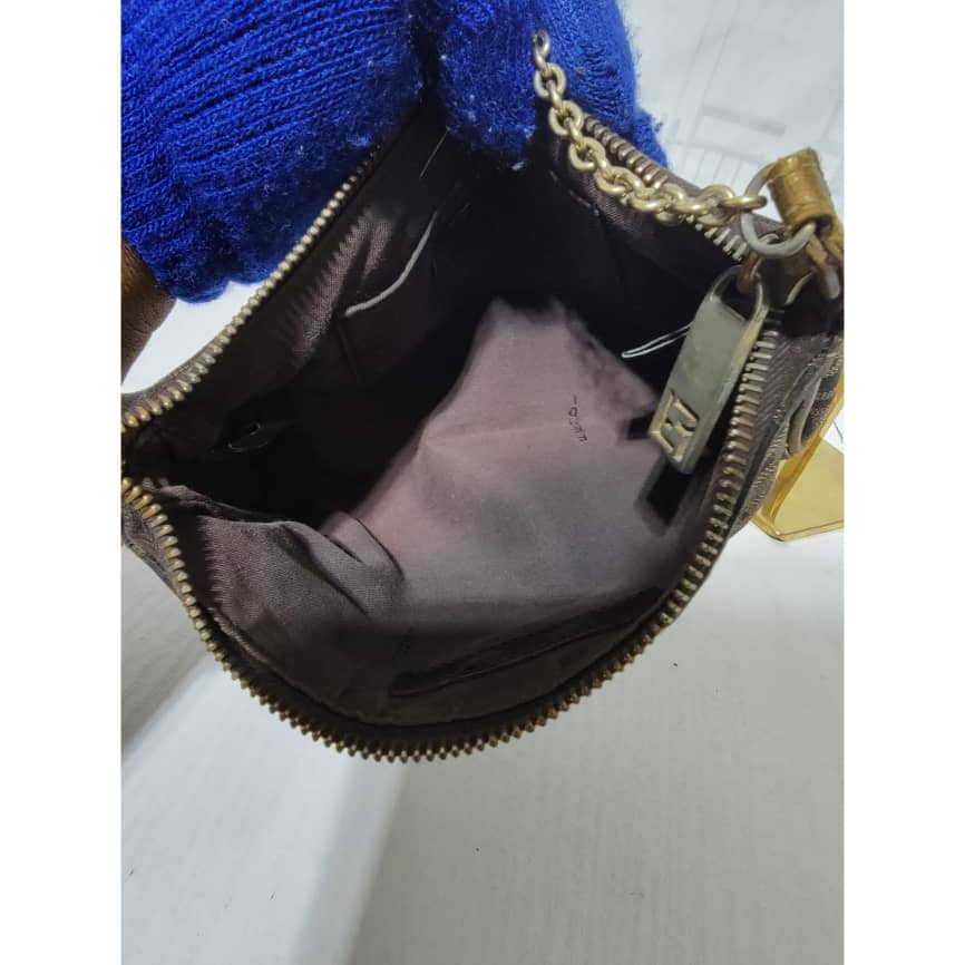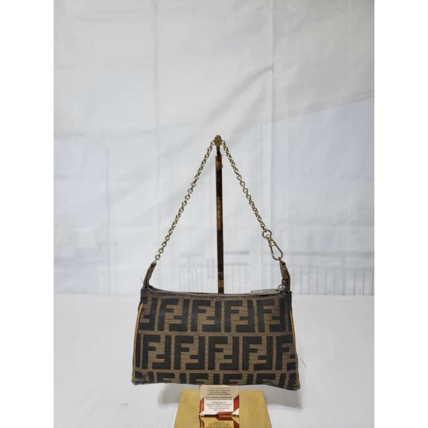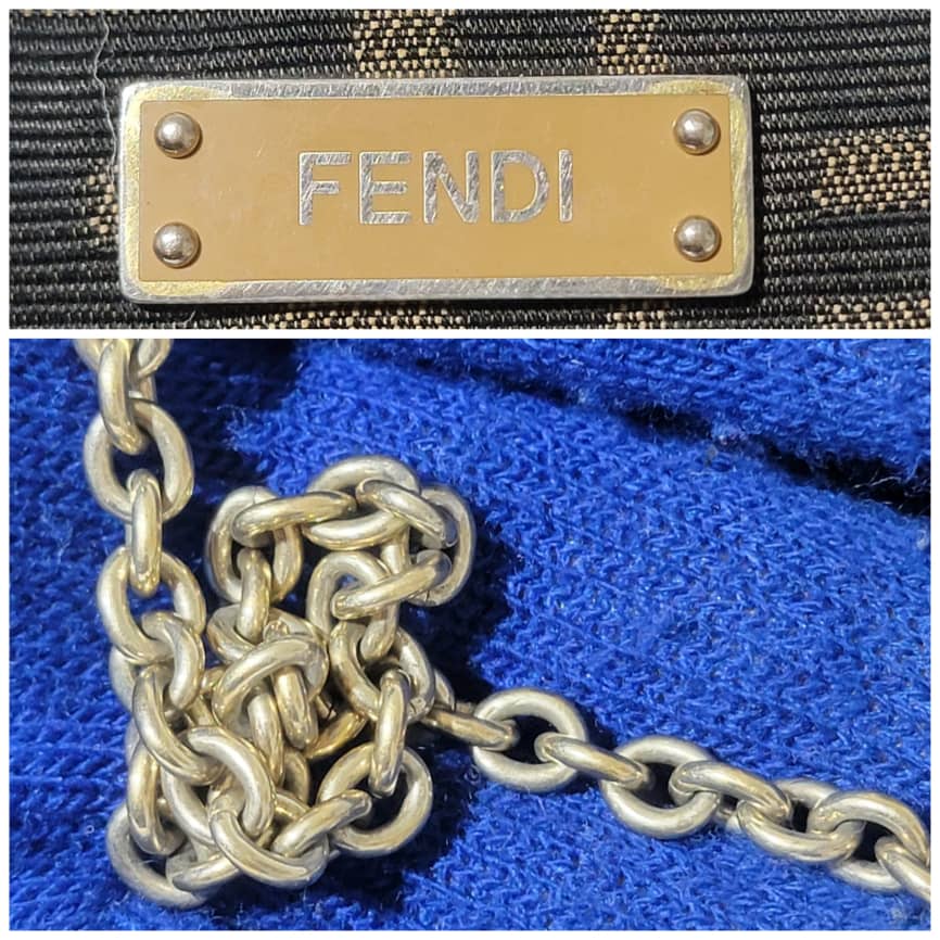 This authentic FENDI Zucca Pochette/Baguette Mini Shoulder Bag Brown is in it’s pre-owned condition. The exterior zucca canvas is clean. The gold trim leather that runs by the side of the bag and also the one holding the chain handle shows sign of rubbing and scratches to it (Kindly look at pictures above, it will be indicated). Gold hardware shows sign of rubbing. Interior is clean. It can be worn as a shoulder bag or clutch, you can also add a long strap to it to make it a crossbody bag. The FF zipper pull shows sign of rubbing to the hardware. Kindly note no longer strap