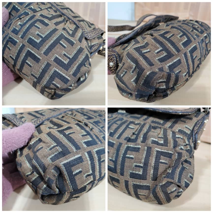 Zucca Small Chef Shoulder Bag Oro is in it’s pre-owned good condition. Has sign of use. The exterior canvas is clean. One corner side of the bag shows thread pull. Still okay. Interior is clean