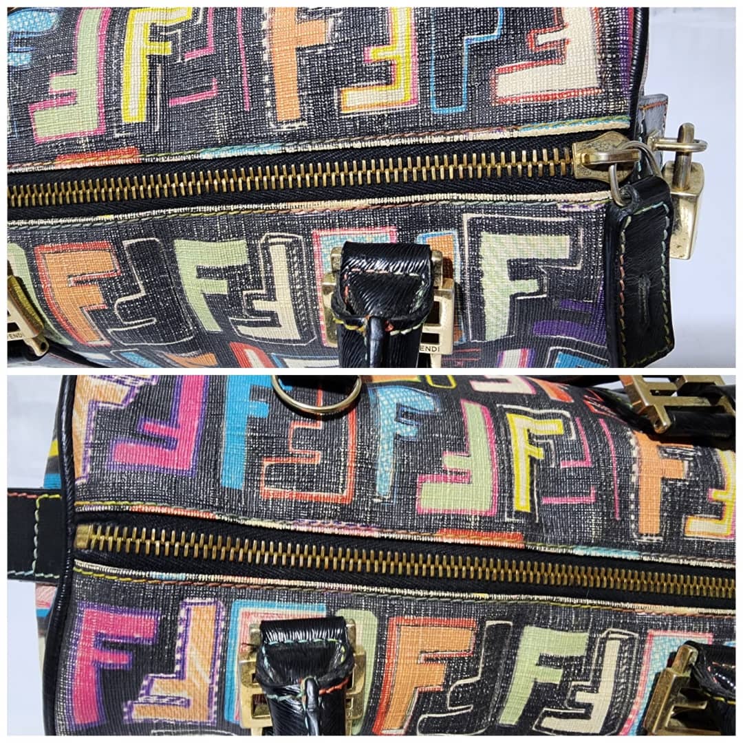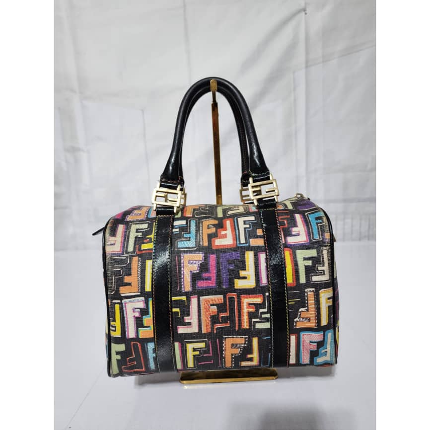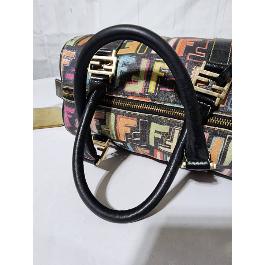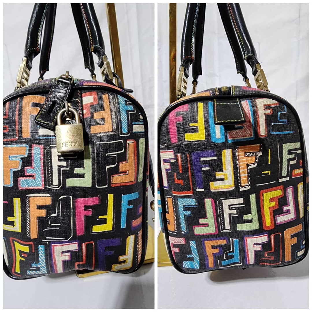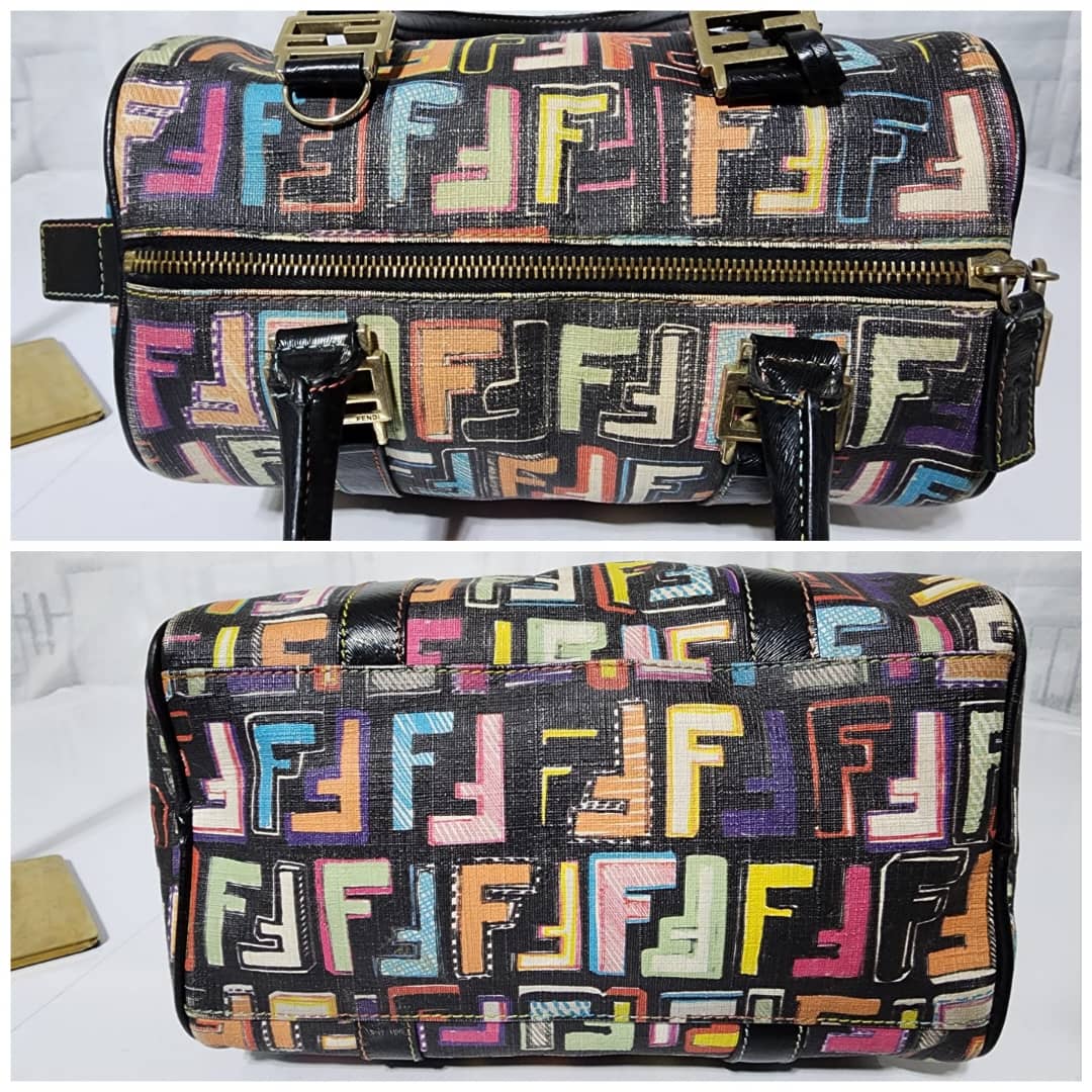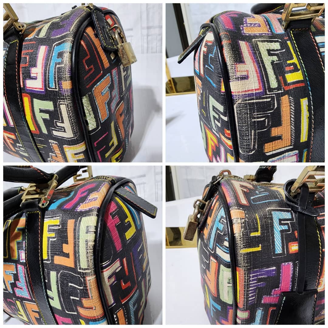 This authentic FENDI Zucca Spalmati FF Forever Boston Black/Multicolor is in it’s good pre-owned condition. The exterior is clean and beautiful. Interior is clean and beautiful. The edges of the bag shows some sign of rubbing to the multicolored FF print. Gold hardware shows some scratch and rubbing to it.